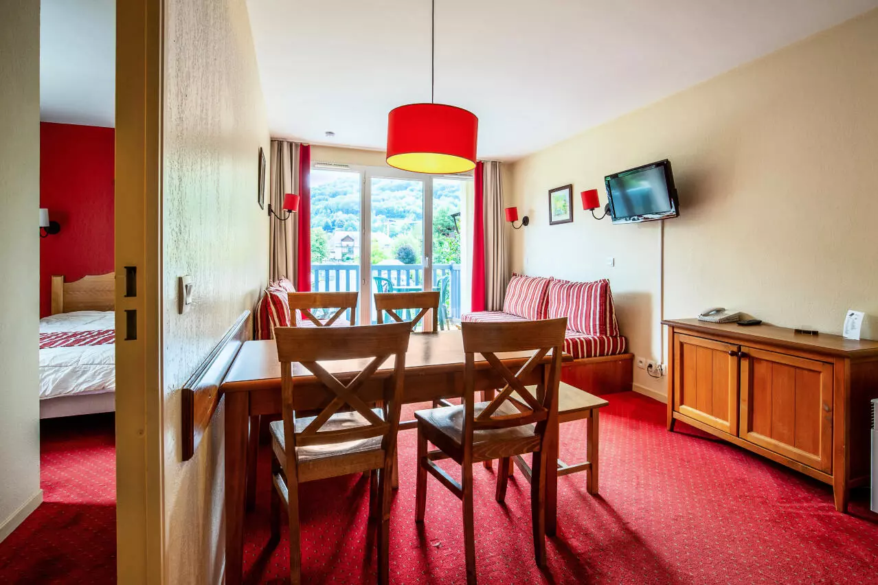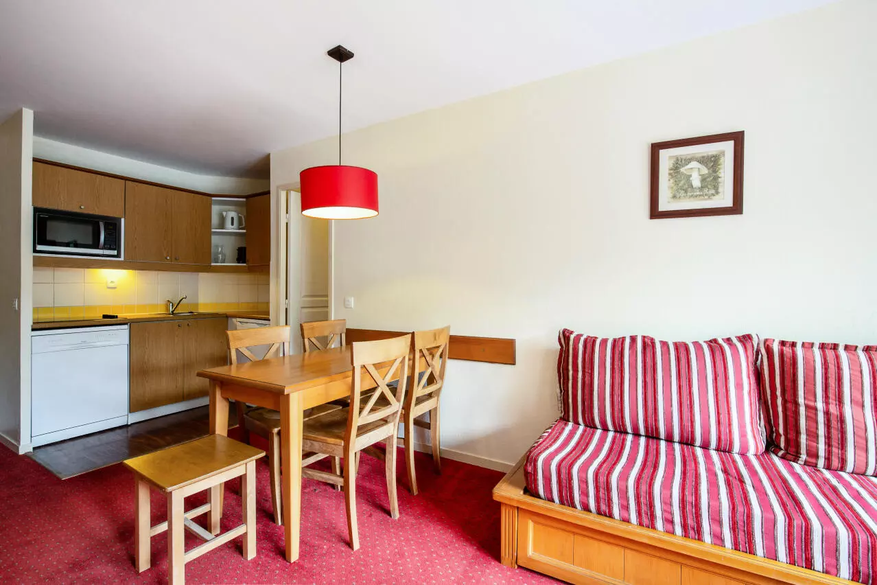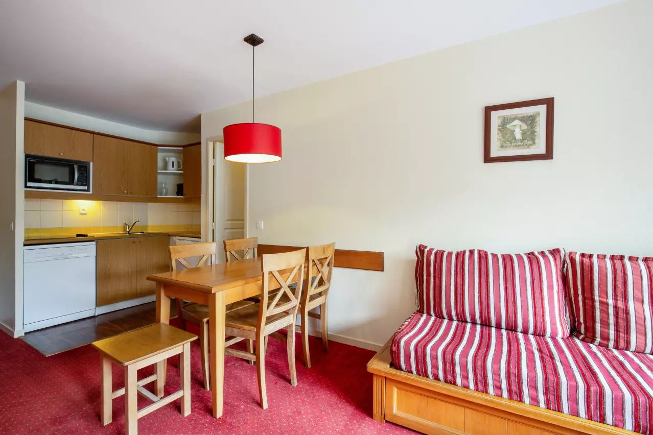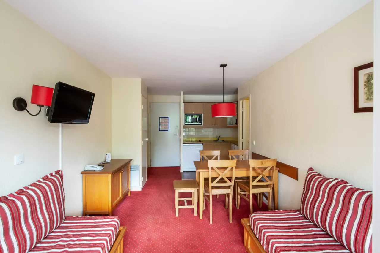 Living room composition: 2 sofa beds, 1 with a pull-out bed (maximum capacity of 3 beds). Dining area: 1 table with 4 chairs.