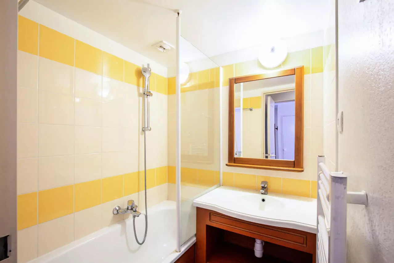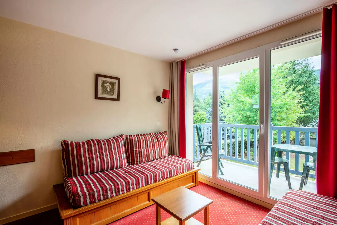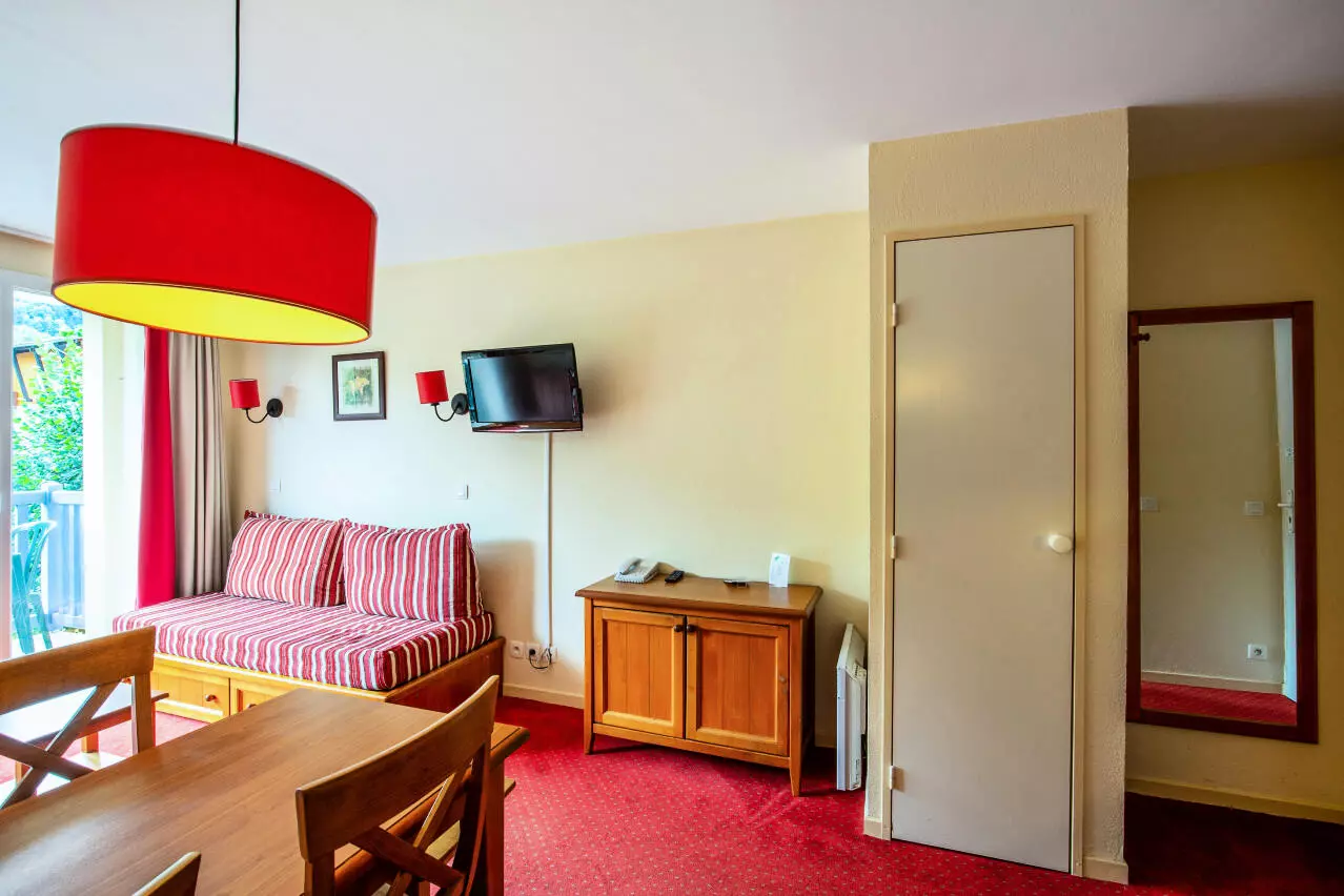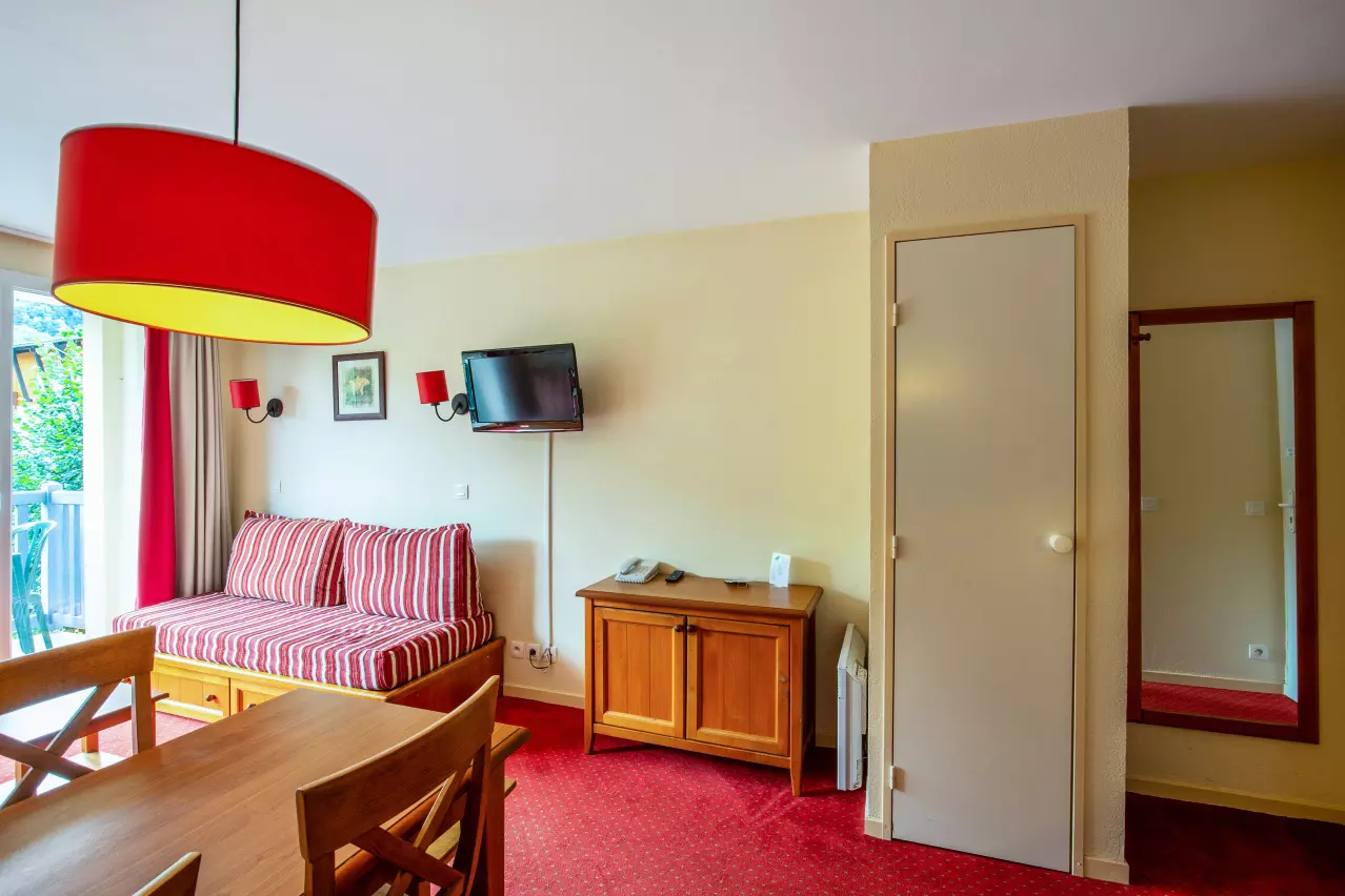 Living room composition: 2 sofa beds, 1 with a pull-out bed (maximum capacity of 3 beds). Dining area: 1 table with 4 chairs.