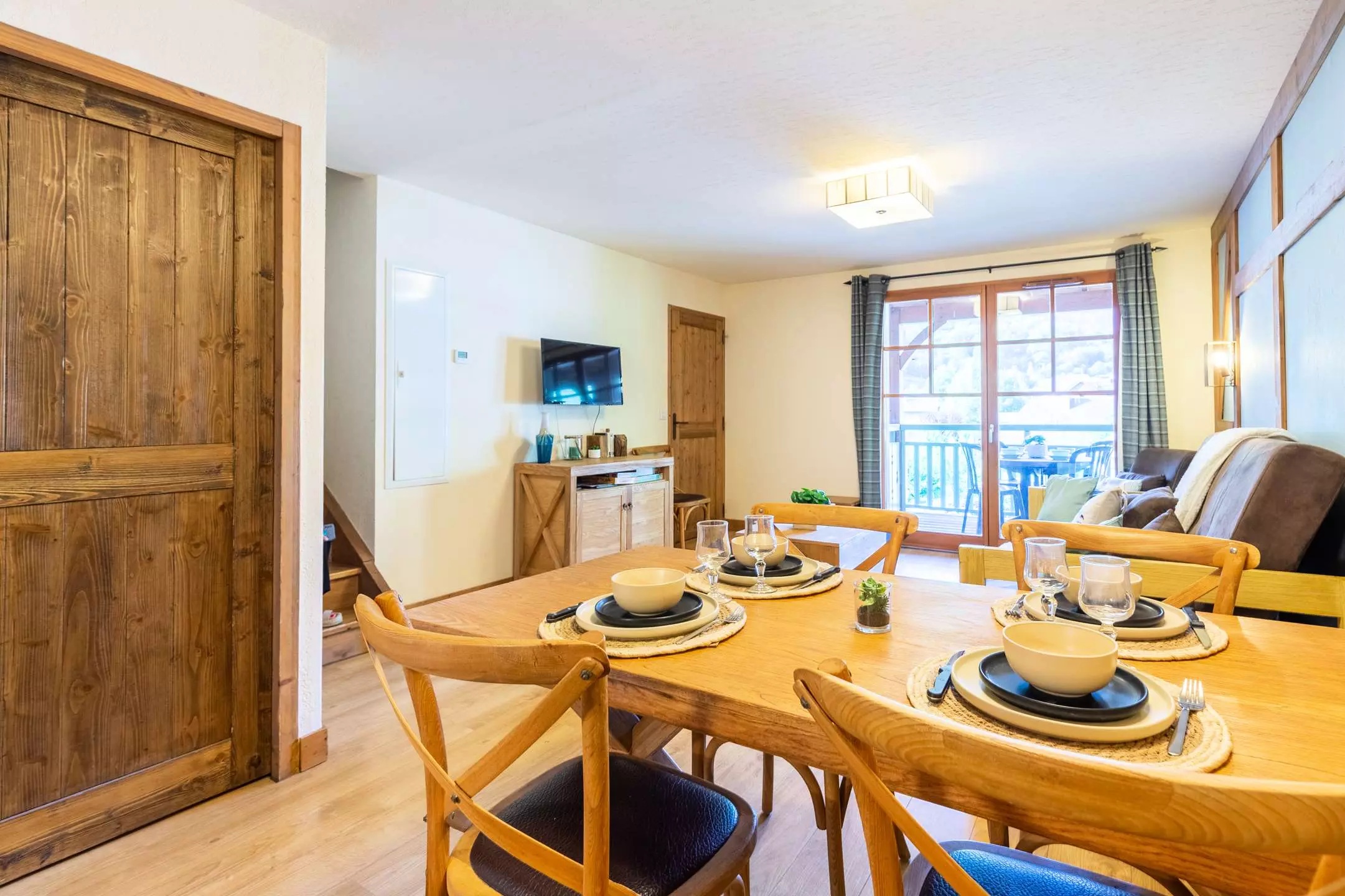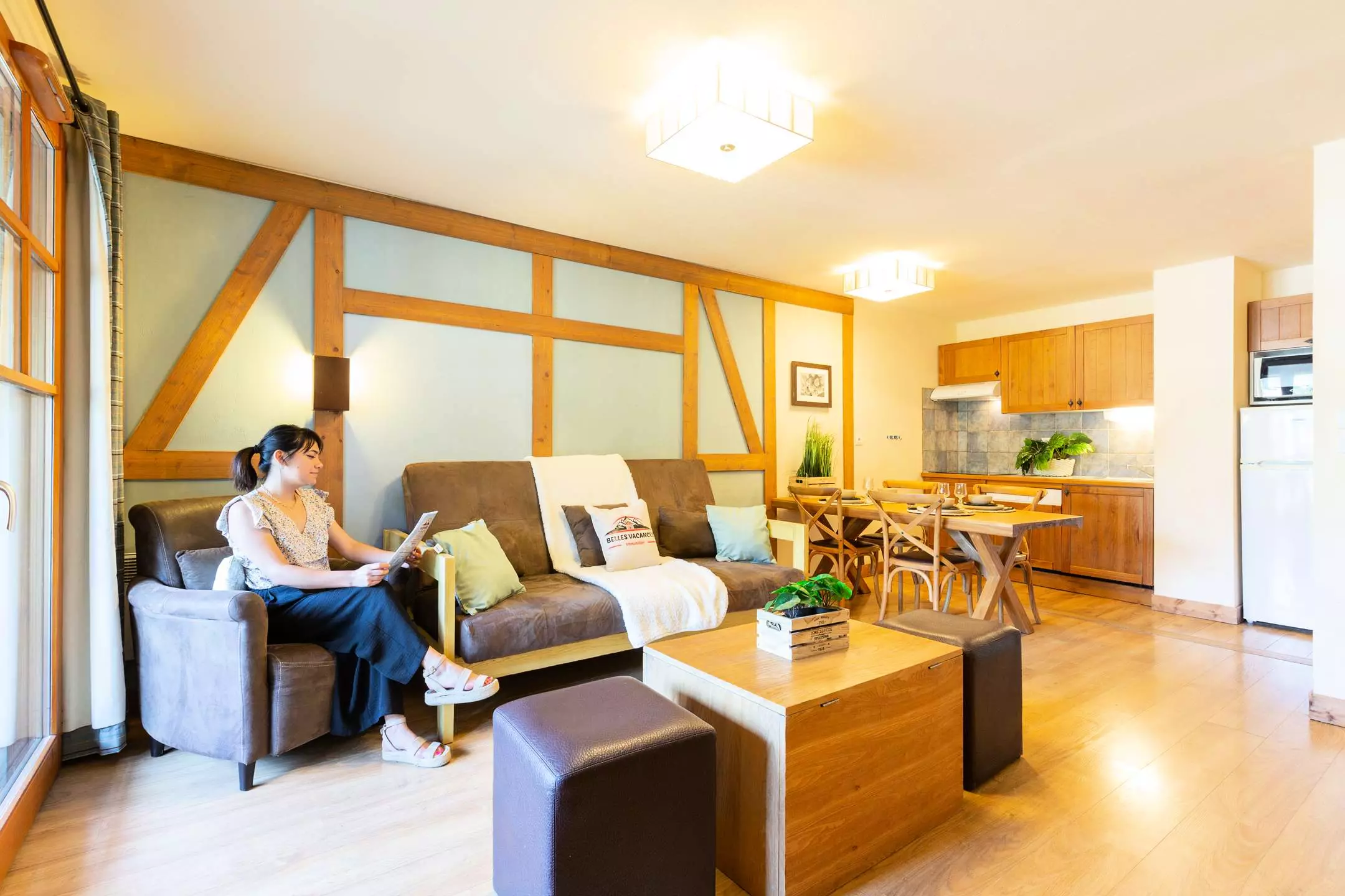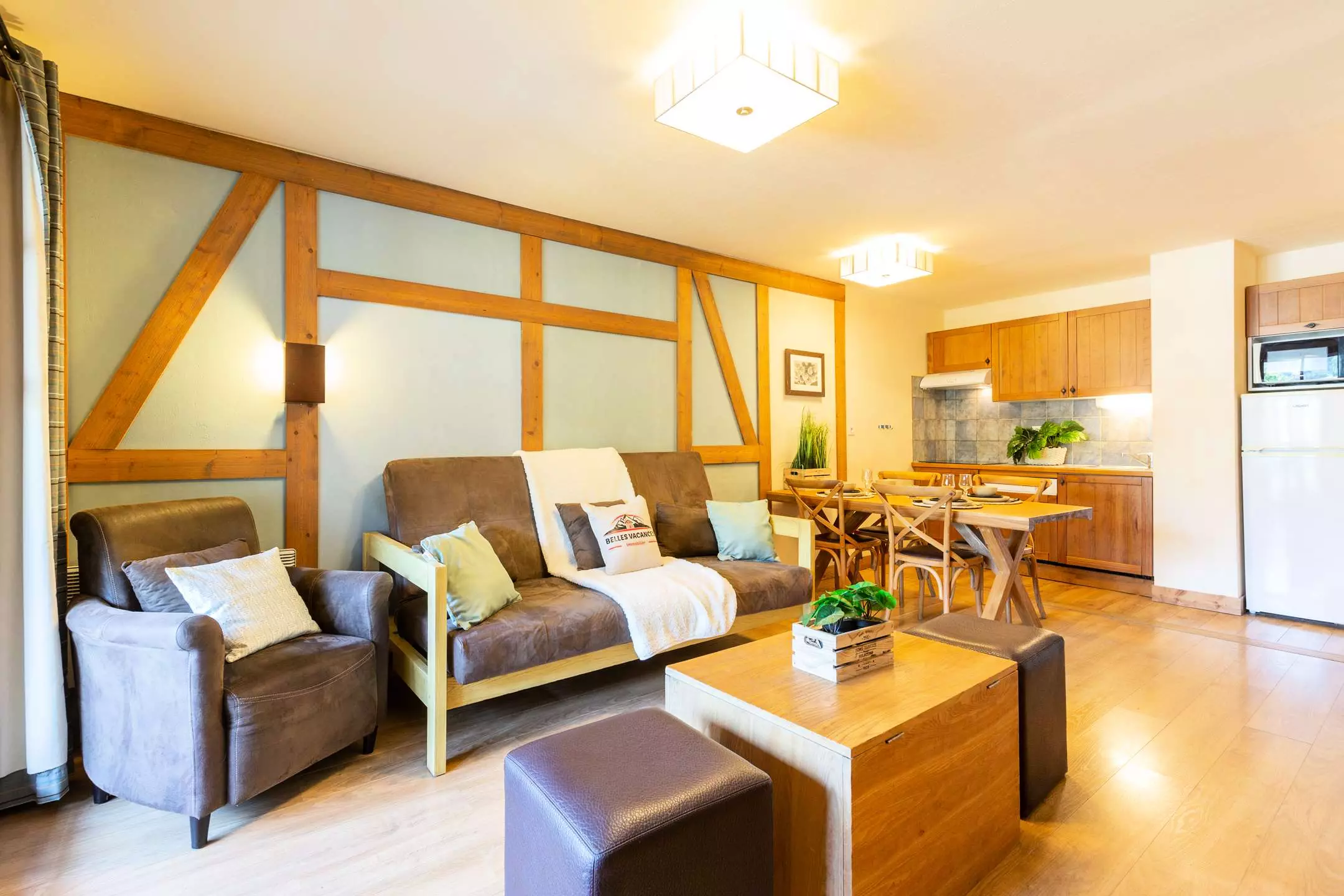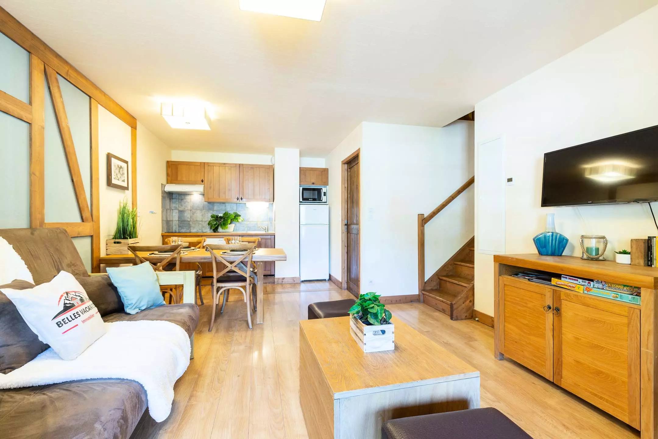 -A living room with 1 double sofa bed and TV, opening onto a fitted kitchen (ceramic hob, microwave, dishwasher)