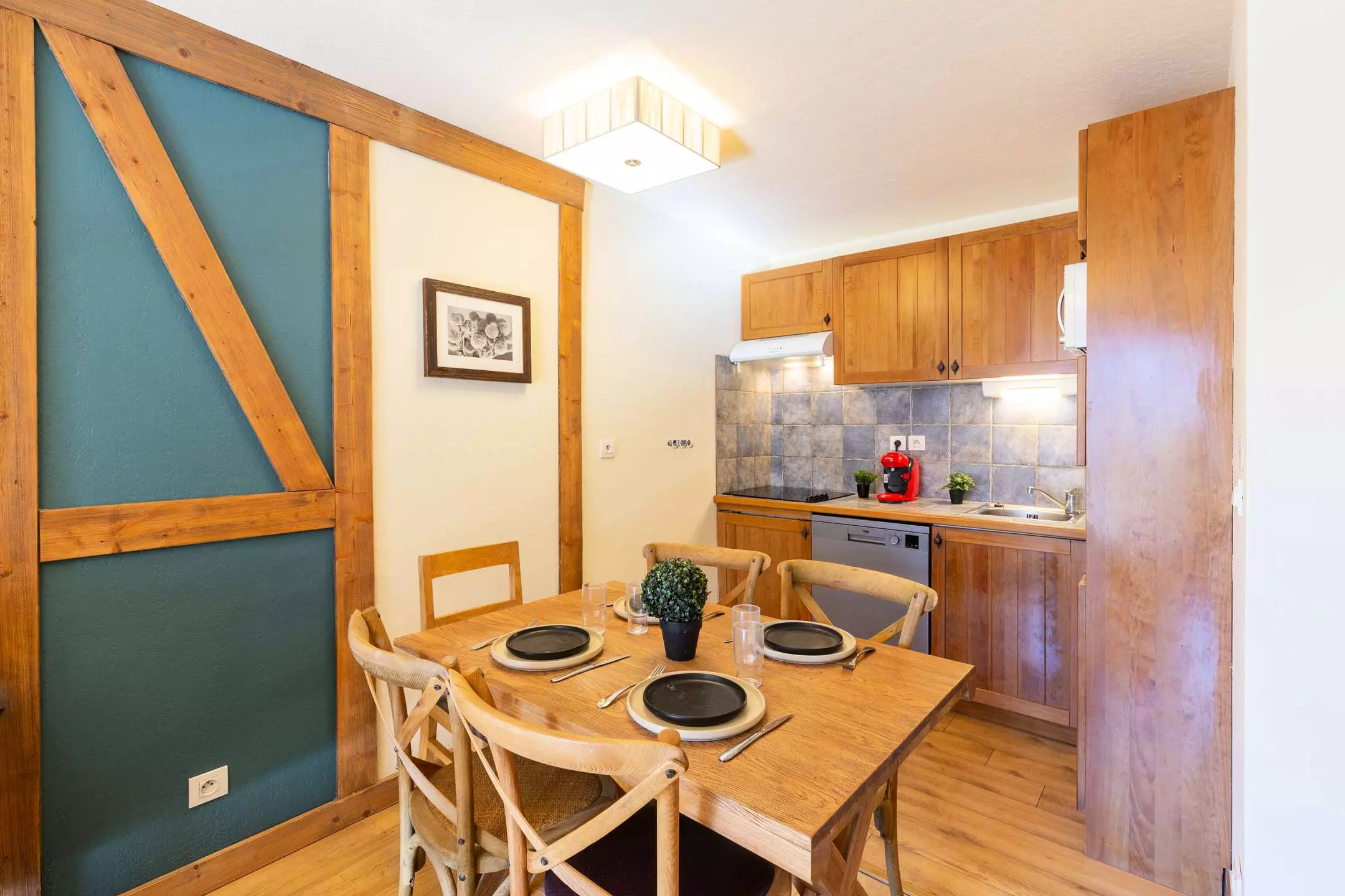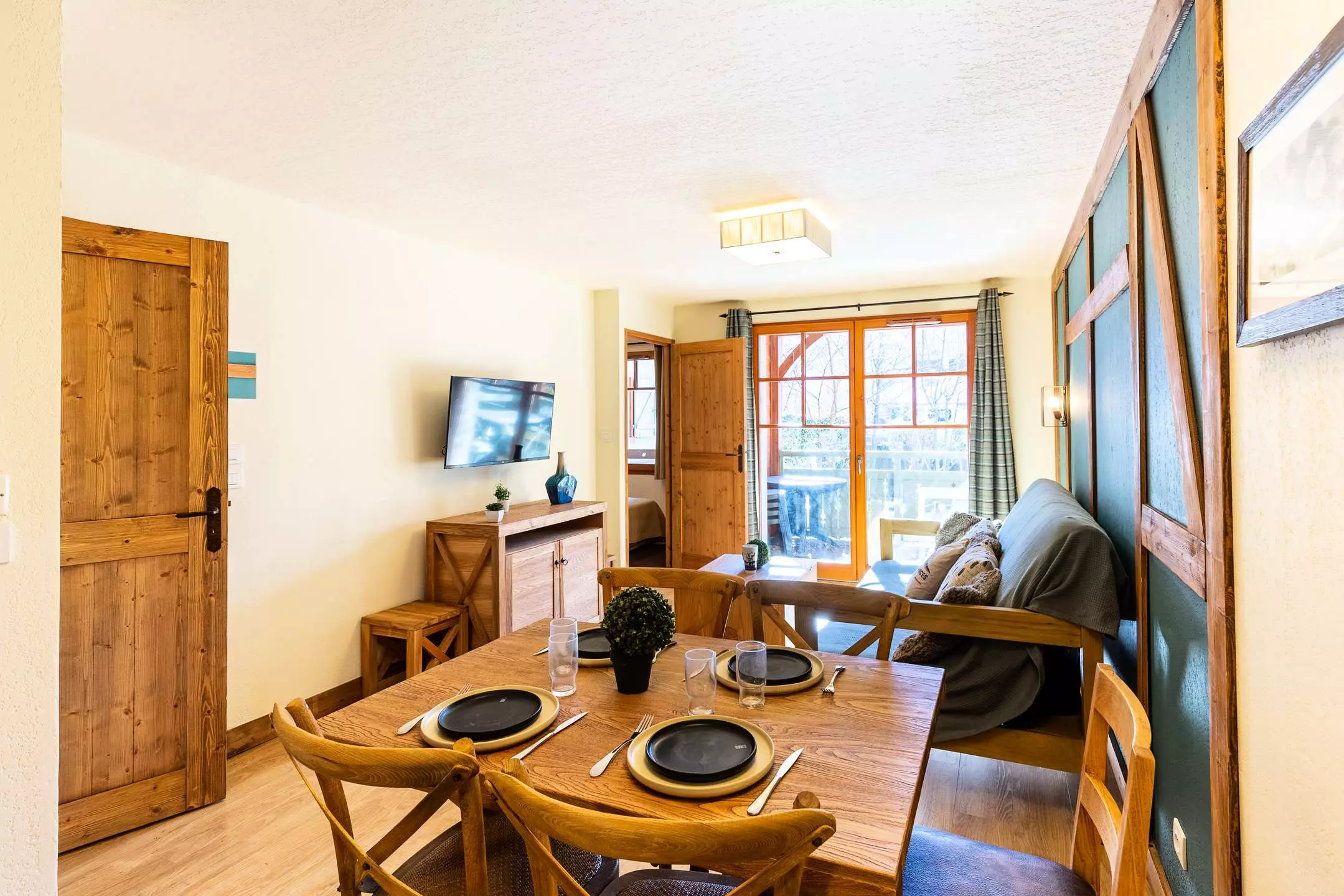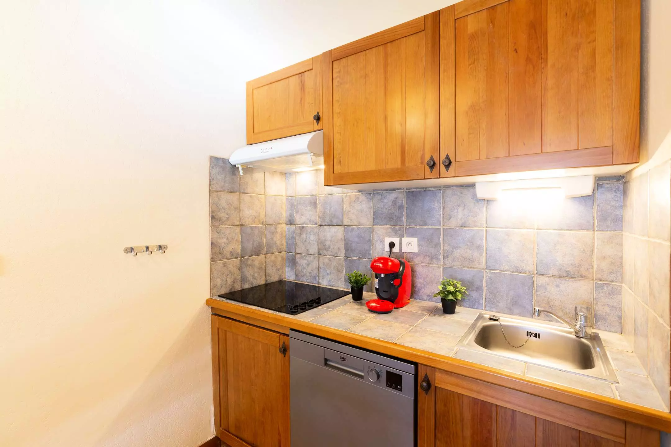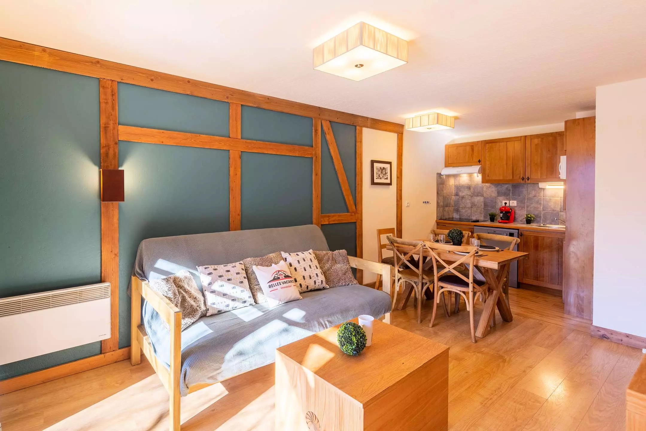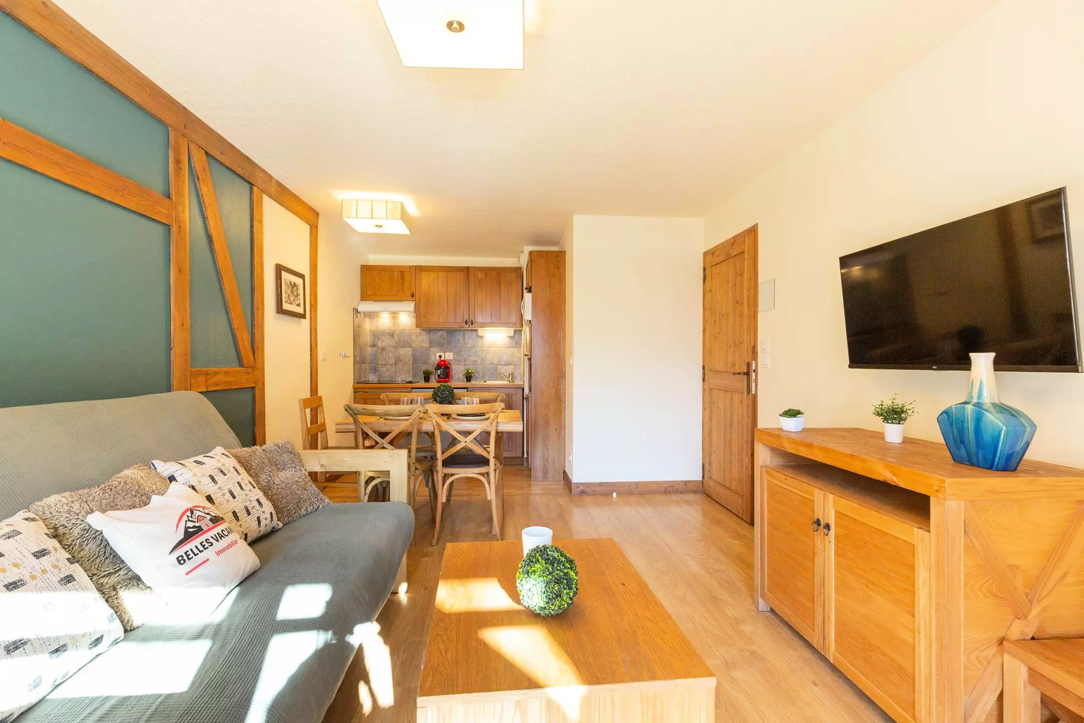 -A living room with 1 double sofa bed and TV, opening onto a fitted kitchen (ceramic hob, microwave, dishwasher)