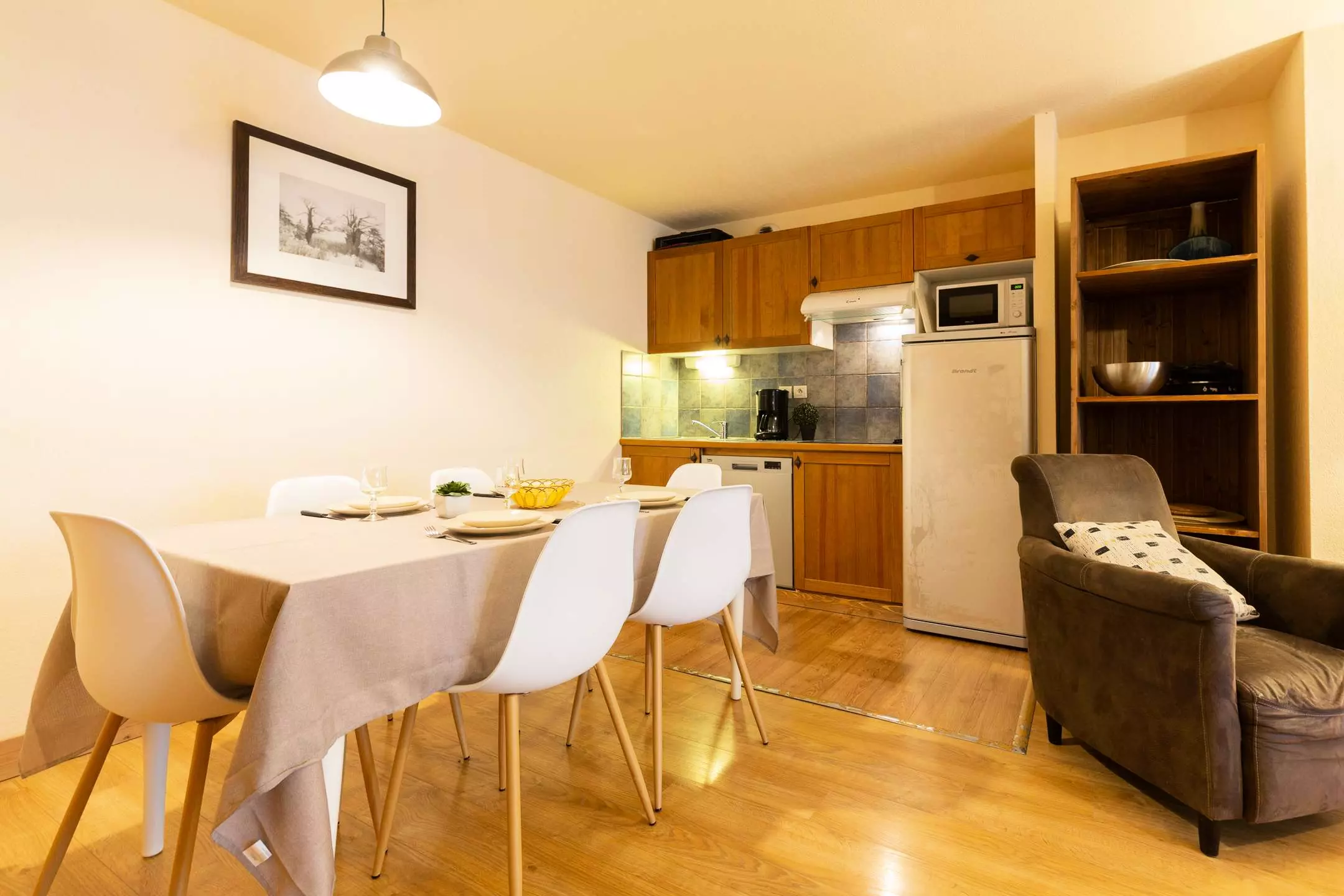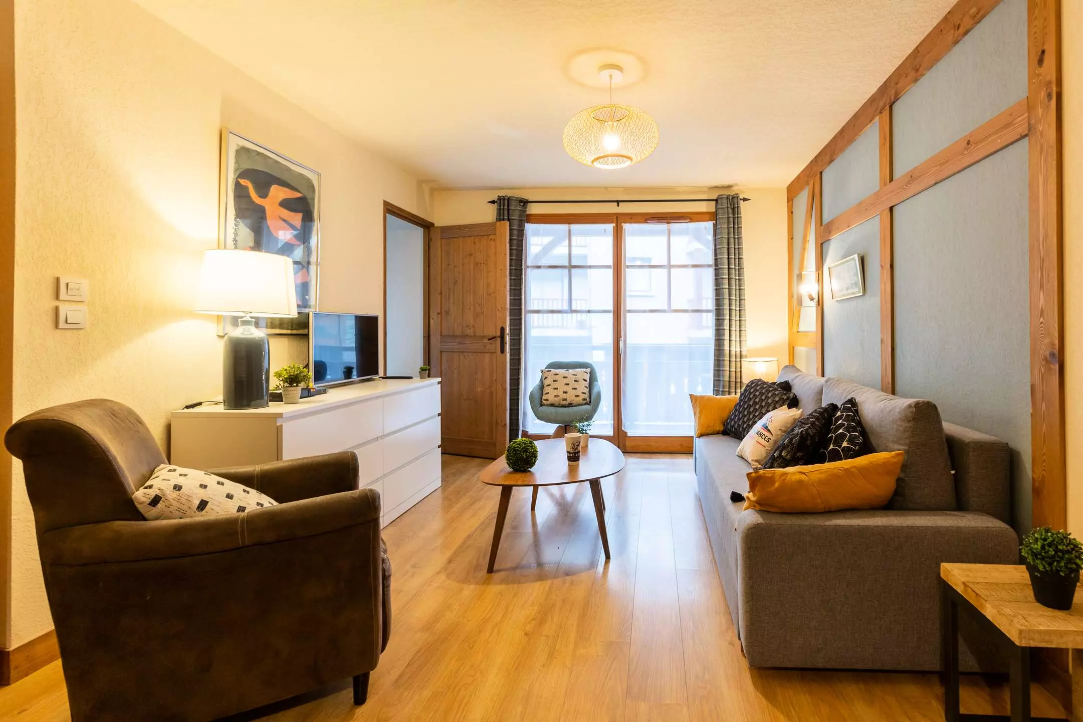-A living room with 1 double sofa bed and television, opening onto a fitted kitchen (ceramic hob, microwave, dishwasher)