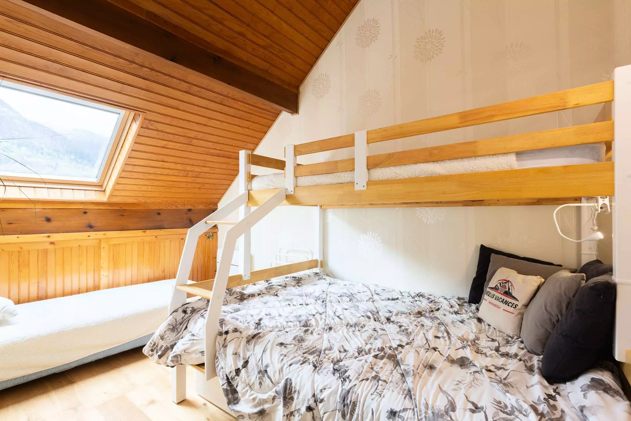 A bedroom with 1 single bed + 1 bunk bed including a double bed