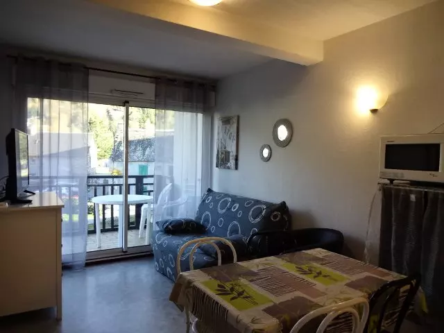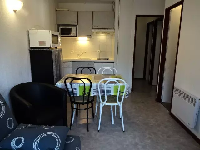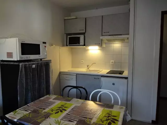 In a luxury residence with elevator, living room with sofa, TV opening onto an east-facing balcony, equipped kitchenette: fridge, 2 ceramic hobs, mini oven and dishwasher.