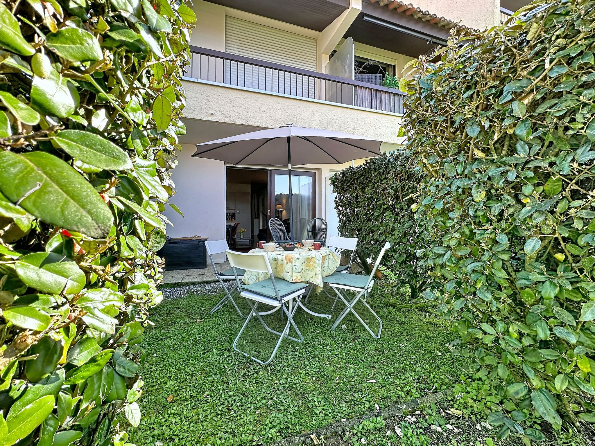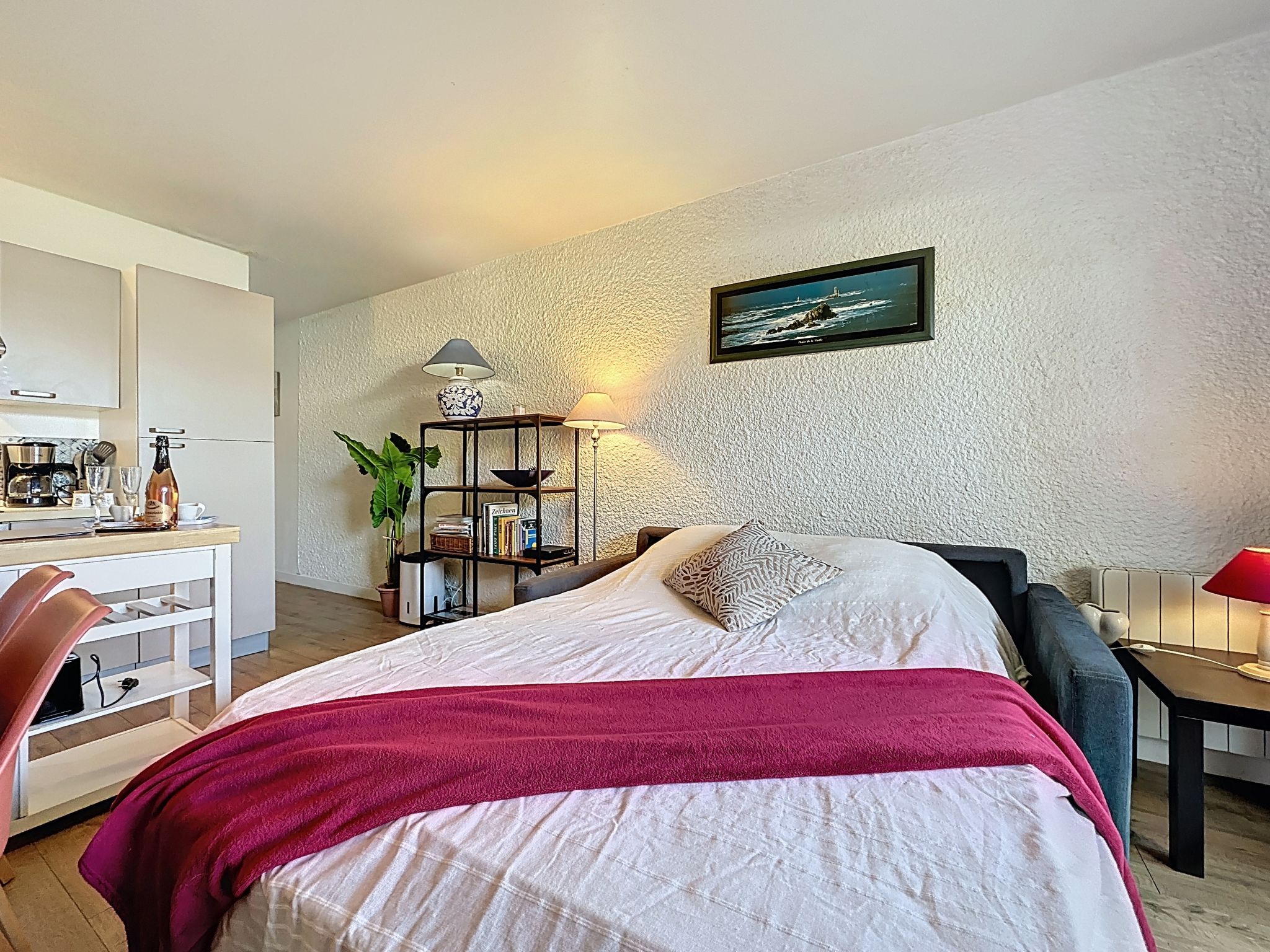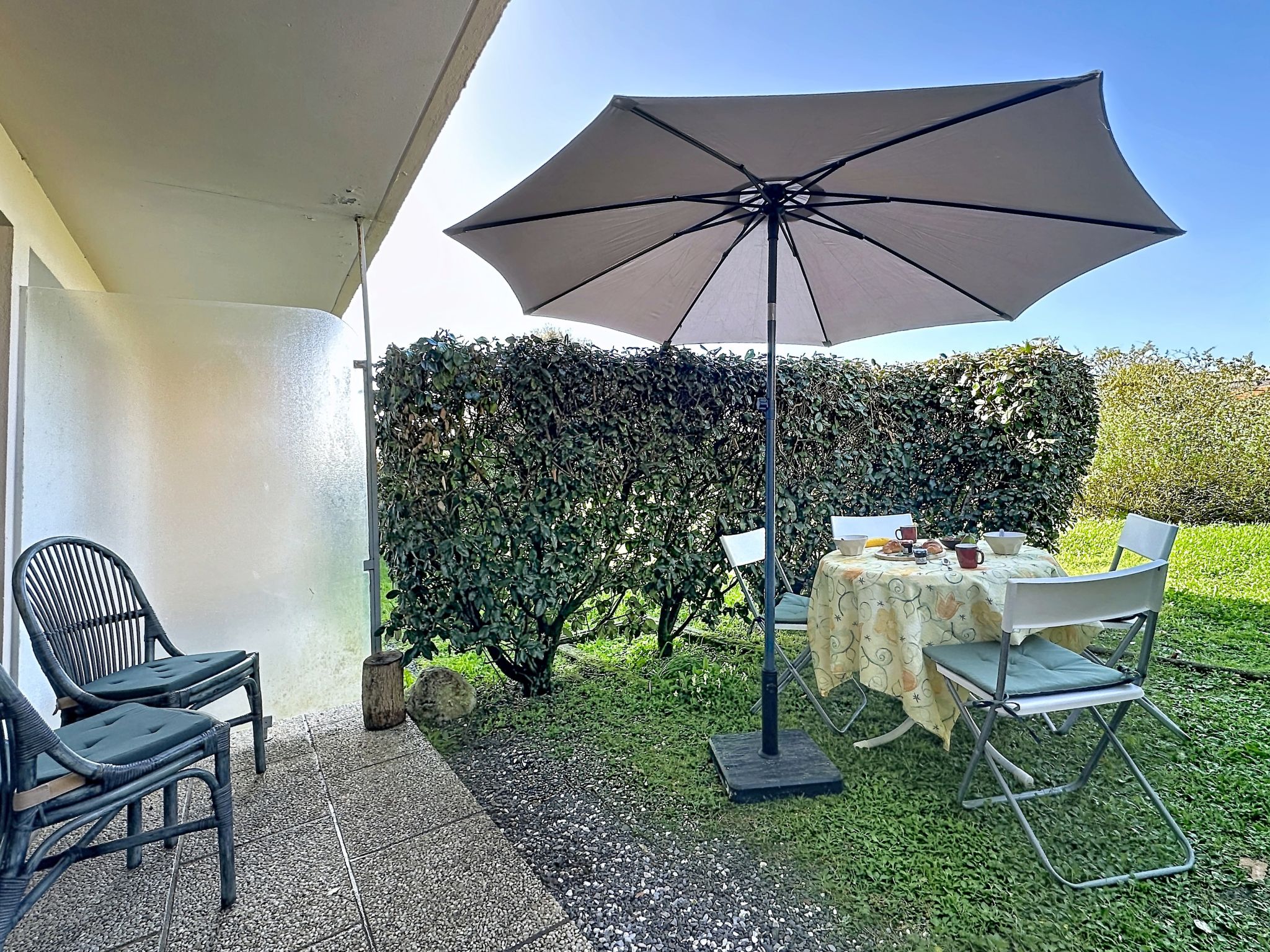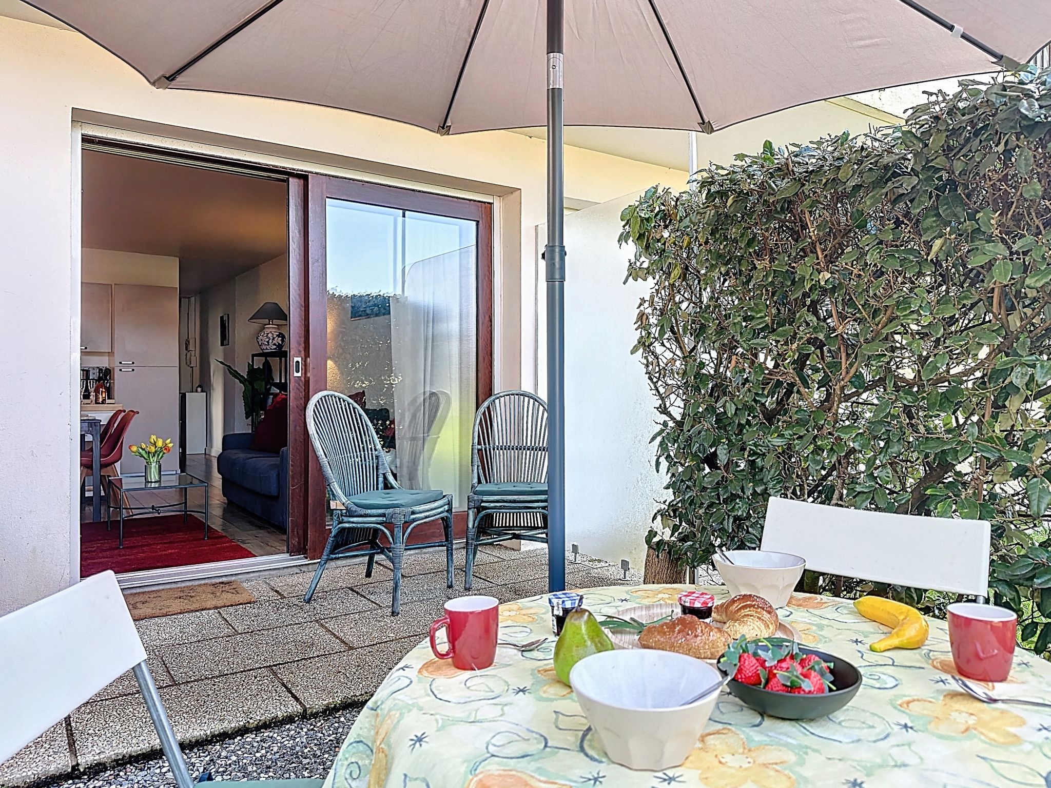 2-room apartment 40 m2, on the ground floor. Comfortable furnishings: living/dining room with 1 double sofabed (1 x 140 cm, length 190 cm), TV (flat screen). 1 room with 1 french bed (1 x 160 cm, length 200 cm). Open kitchen (oven, dishwasher, 1 induction hot plates, 4 gas rings, toaster, kettle, microwave, electric coffee machine, Capsules for coffee machine (Nespresso) extra). Shower/WC. Electric heating. Small terrace 5 m2, west facing position, small garden 10 m2. Terrace furniture. Facilities: washing machine, iron. Internet (WiFi, free). Parking space n 89 (1 car). Please note: non-smokers only. Maximum 1 small pet/ dog allowed. Smoke alarm. Offer by a private individual according to Art. 155, IV of CGI. 44182000427UI