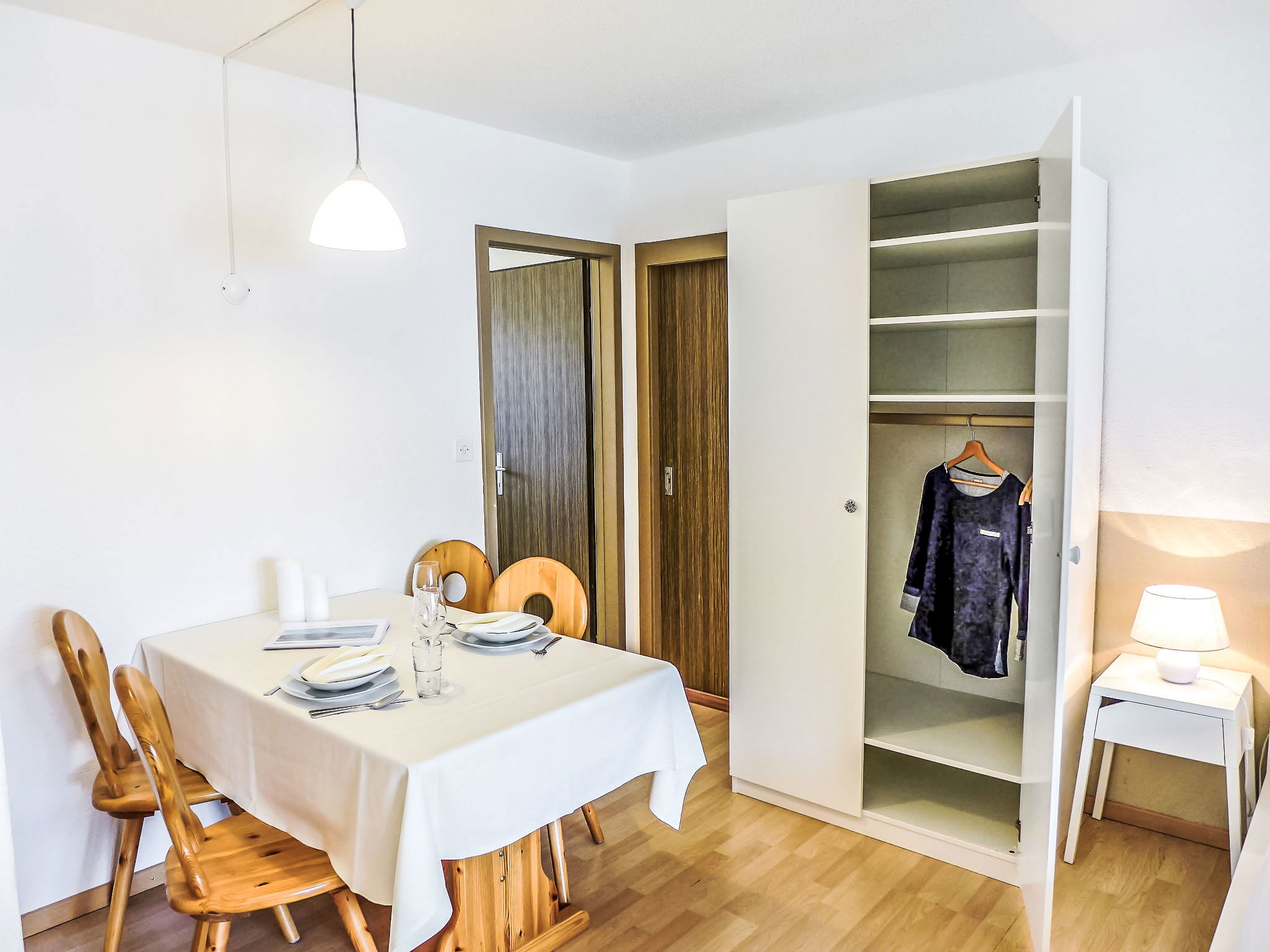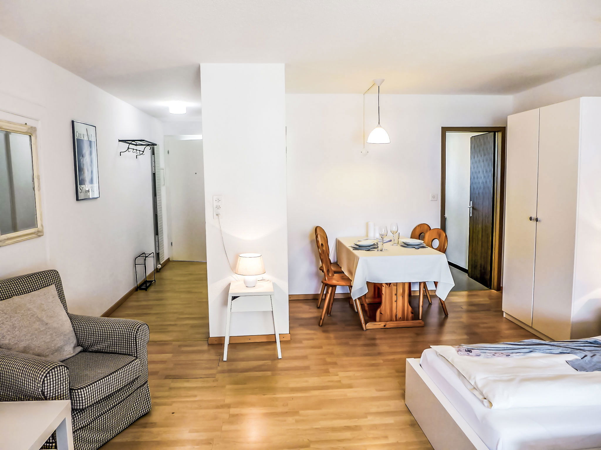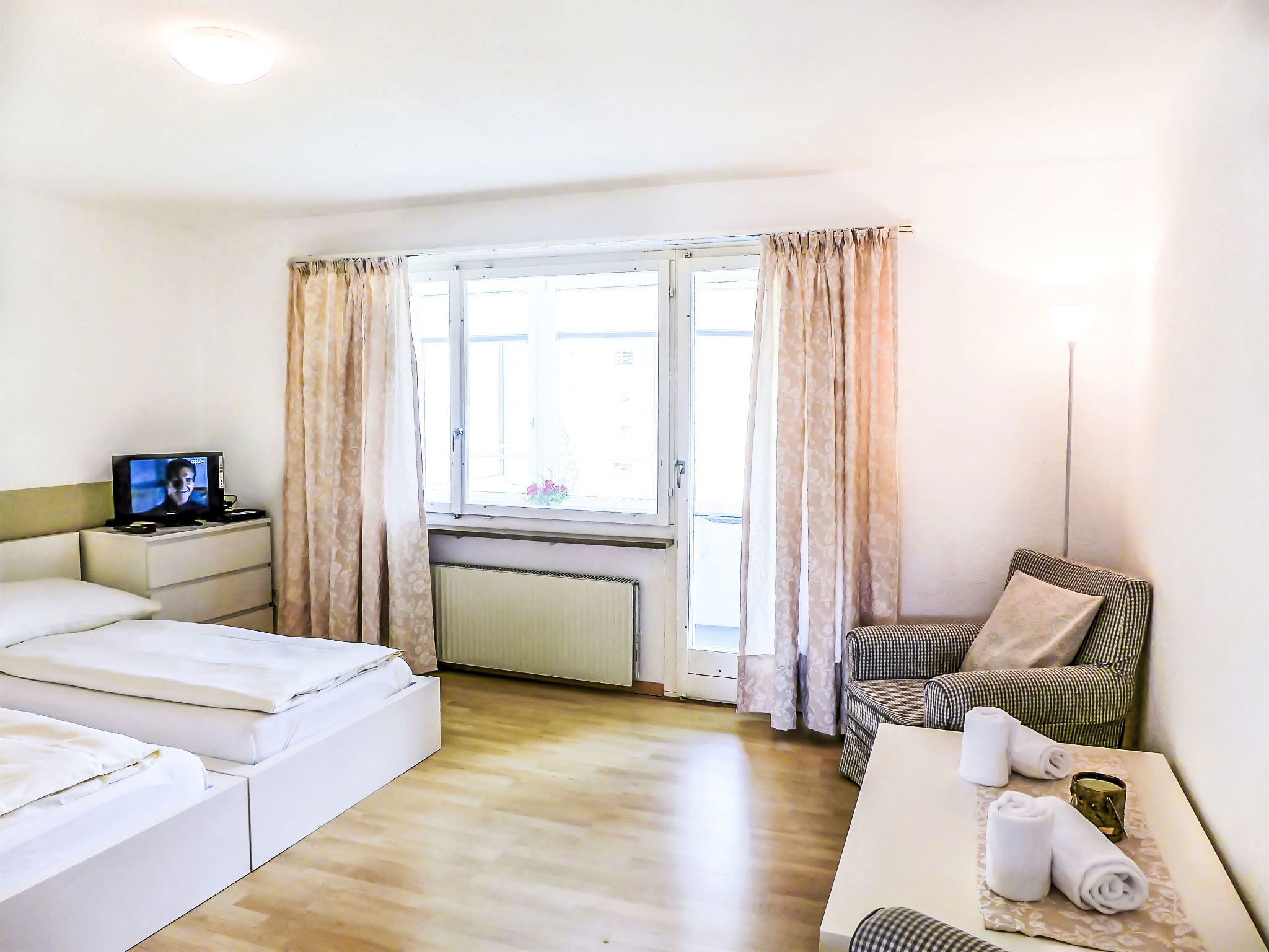 "Chesa Ova Cotschna 304", 1-room apartment 32 m2 on 3rd floor, west facing position. Modern and cosy furnishings: living/sleeping room with 1 double bed (2 x 90 cm, length 200 cm), dining table and TV (flat screen). Exit to the loggia. Small kitchen (oven, 4 ceramic glass hob hotplates, toaster, kettle, electric coffee machine). Bath/WC. Balcony furniture. View of the mountains and the resort. Facilities: hair dryer. Internet (WiFi, free). Please note: non-smokers only, no parking. Maximum 1 pet/ dog allowed.