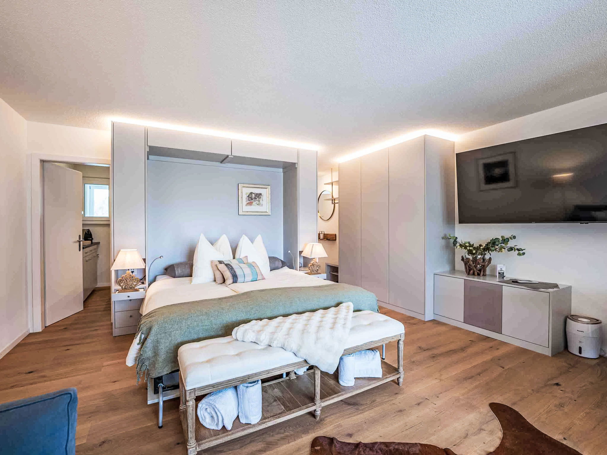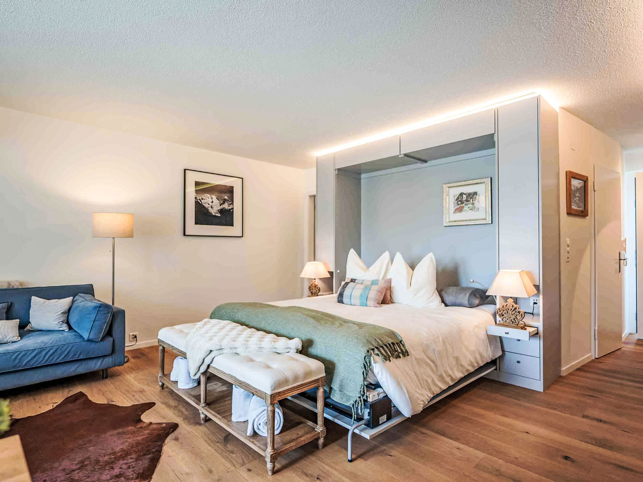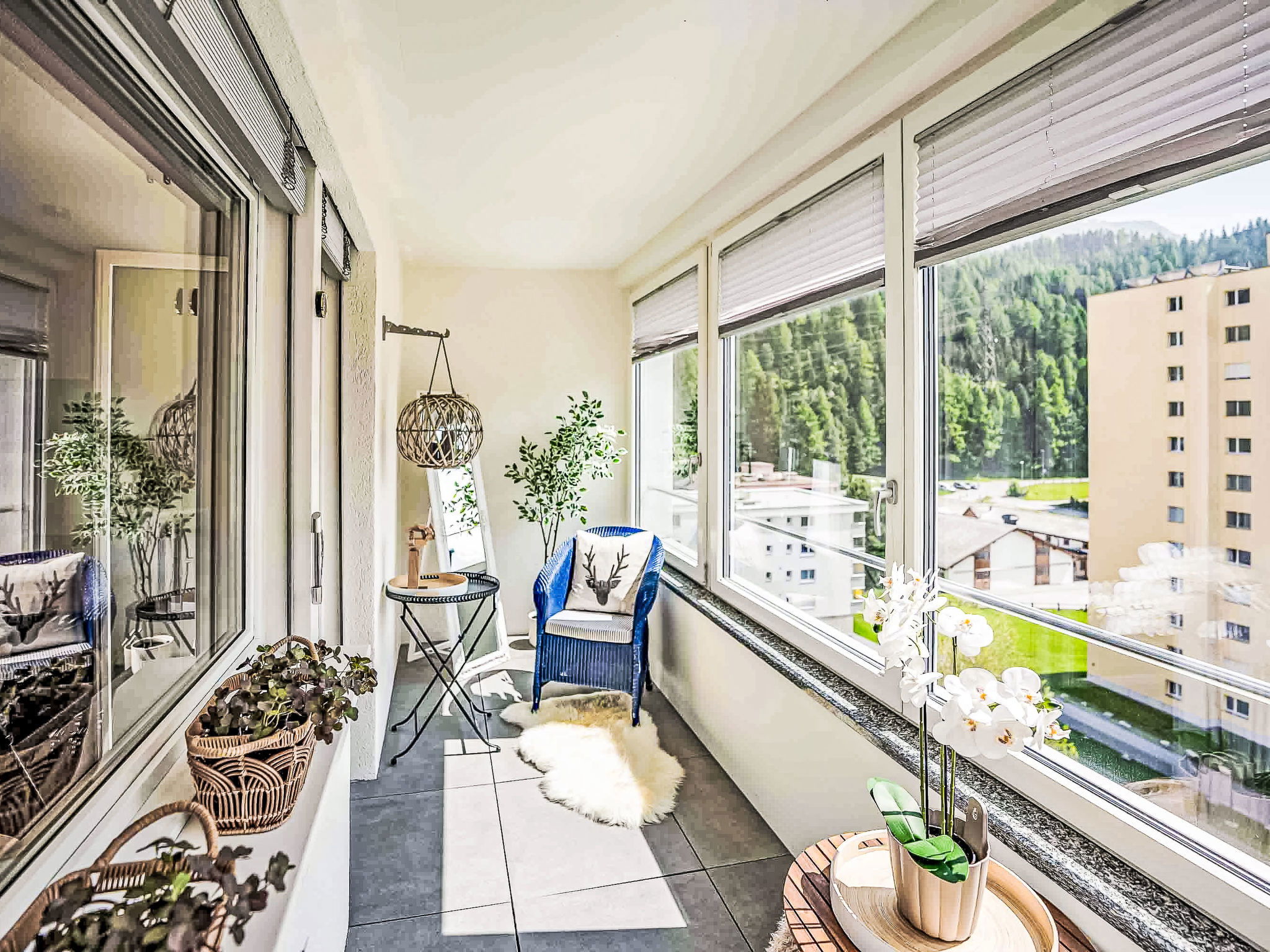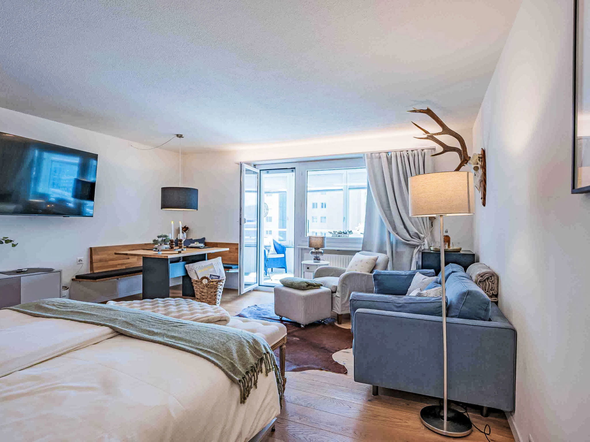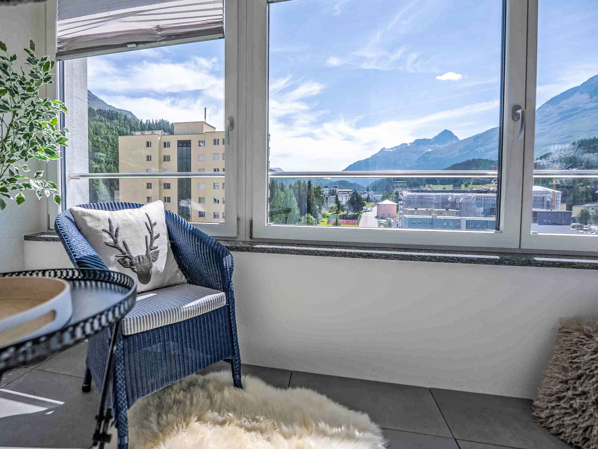 "Chesa Ova Cotschna 802", 1-room apartment 32 m2 on 8th floor, west facing position. Bright, renovated in 2024, beautiful and modern furnishings: open living/sleeping room with 2 fold-away beds (90 cm, length 200 cm), dining nook and TV (flat screen). Exit to the loggia. Small kitchen (oven, dishwasher, 4 ceramic glass hob hotplates, toaster, kettle, electric coffee machine, Capsules for coffee machine (Nespresso) extra, steamer, raclette grill, fondue Set (cheese)). Shower/WC. Heating. Beautiful view of the mountains and the countryside. Facilities: iron, hair dryer. Internet (WiFi, free). Garage space n 24 (1 car) at 300 m, height 205 cm, width 220 cm. Please note: non-smokers only, non-smoking house. Maximum 1 pet/ dog allowed.