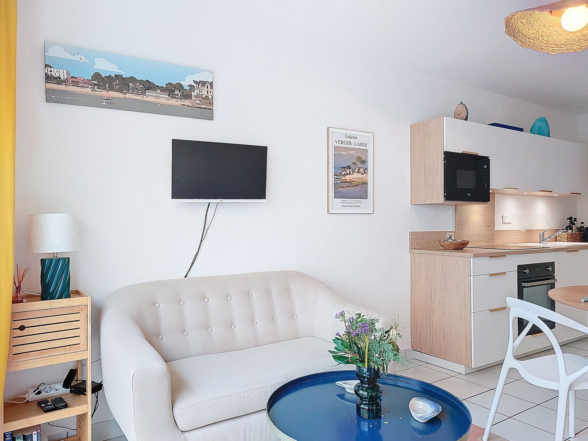 Residence "Les Hauts de Nauzan", 2 storeys. 18 apartments in the residence. In the resort, 600 m from the centre, 150 m from the sea, 150 m from the beach. Shop 600 m, supermarket 1 km, restaurant 200 m, bakery 900 m, bicycle rental 500 m, bus stop "Nauzan" 200 m, railway station "Royan" 6 km, sandy beach "Nauzan" 150 m, indoor swimming pool 6 km, thermal baths "Thalassothérapie Thalazur Royan" 4.5 km. Golf course (18 hole) 3 km, sailing school 200 m, tennis 2.5 km, indoor tennis centre 2.5 km, riding stable 3 km, cycle lane 20 m. Nearby attractions: Centre nautique de Saint Palais sur Mer 200 m, Tennis club et Padel - St Palais sur Mer 2.5 km, Golf de Royan 3 km, Centre équestre Maine Gaudin 3 km, Casino Barrière - Royan 3 km, Embarcadère Royan - Le Verdon 4.5 km. The keys‘ handover takes place by the agency in Vaux sur Mer, 3 km.