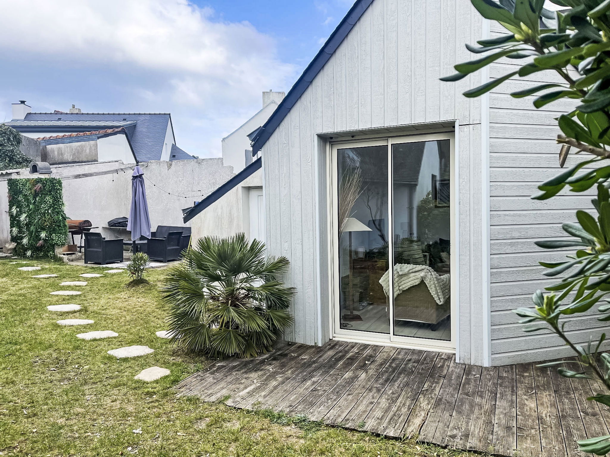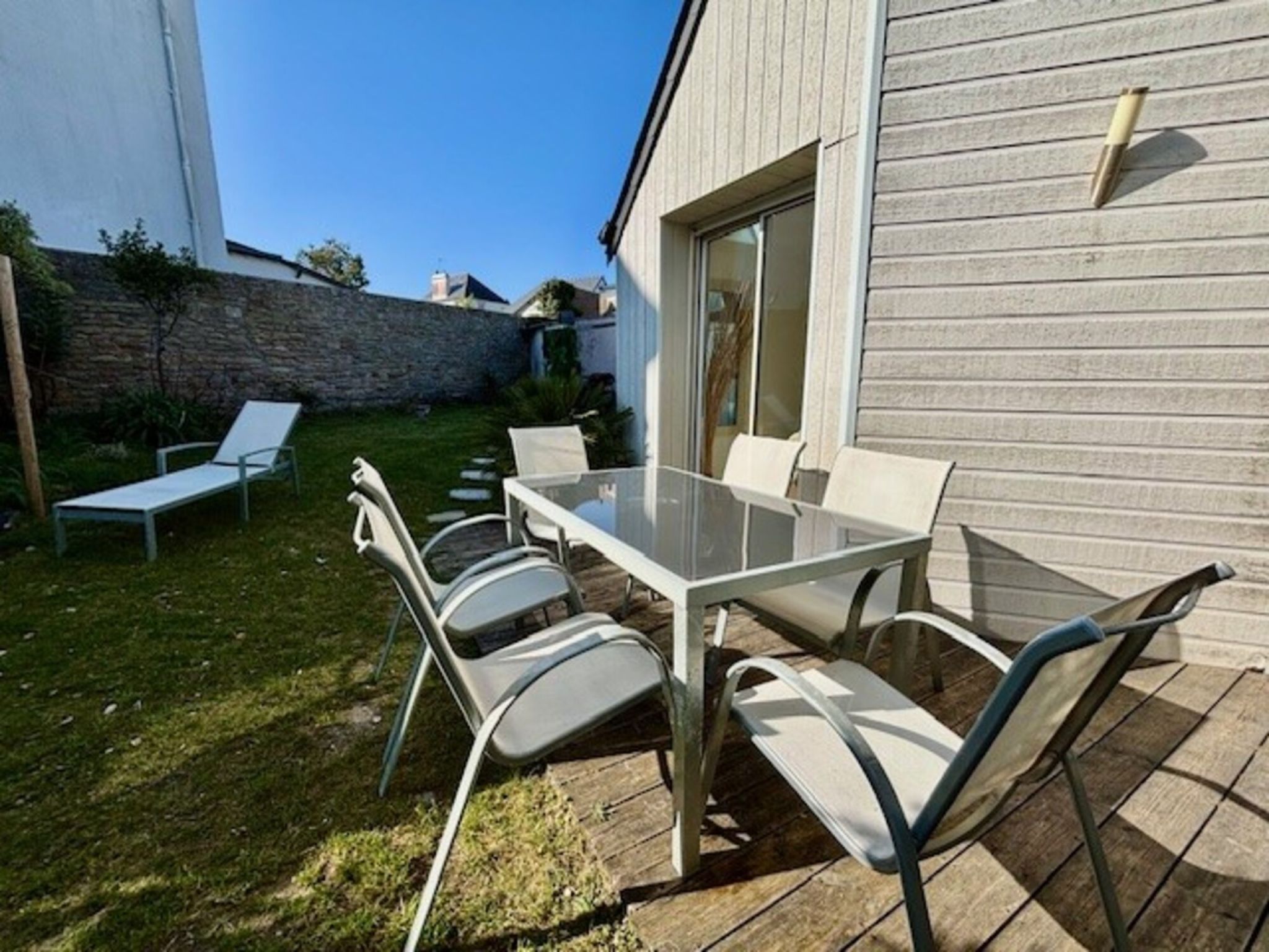 5-room apartment 90 m2, on the ground floor. Comfortable furnishings: living/dining room with TV (flat screen). Exit to the terrace. 4 rooms, each room with 1 french bed (1 x 140 cm, length 190 cm). Open kitchen (oven, dishwasher, 4 gas rings, toaster, kettle, electric coffee machine, Capsules for coffee machine (Magimiw Nespresso) extra). Shower, shower/WC, sep. WC. Terrace 15 m2, south facing position. Terrace furniture, barbecue, deck chairs (2). Facilities: washing machine, children's high chair, baby cot, hair dryer. Internet (WiFi, free). Please note: no parking. 1 small pet/ dog allowed. Smoke alarm. No internal connecting door between the separated properties. Offer by a private individual according to Art. 155, IV of CGI. 56186000401G3