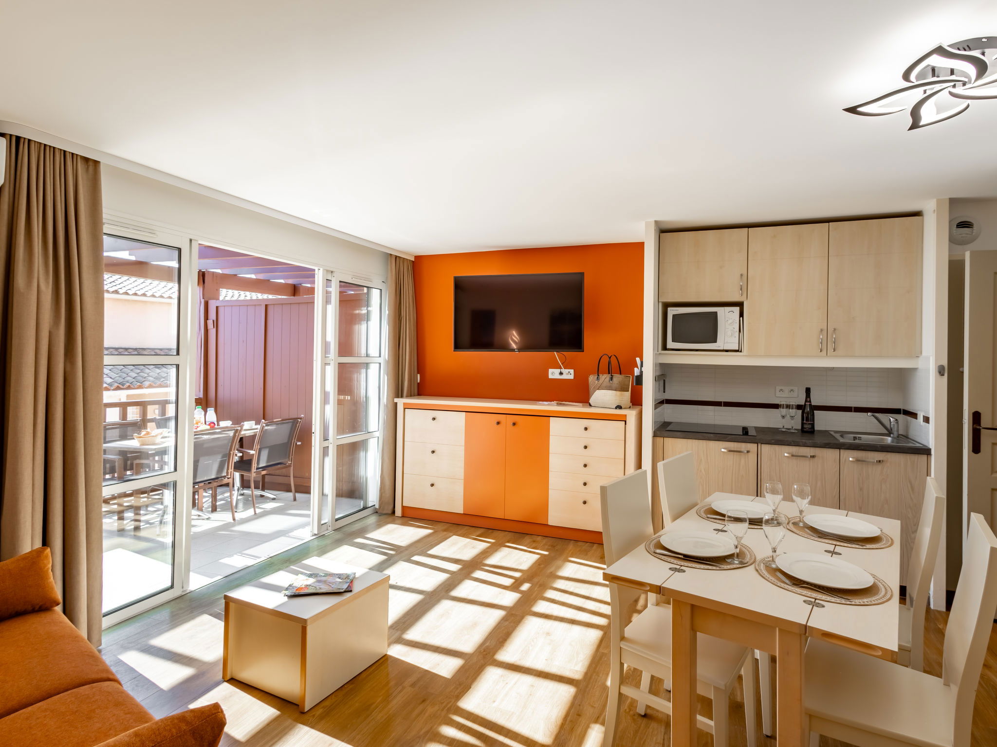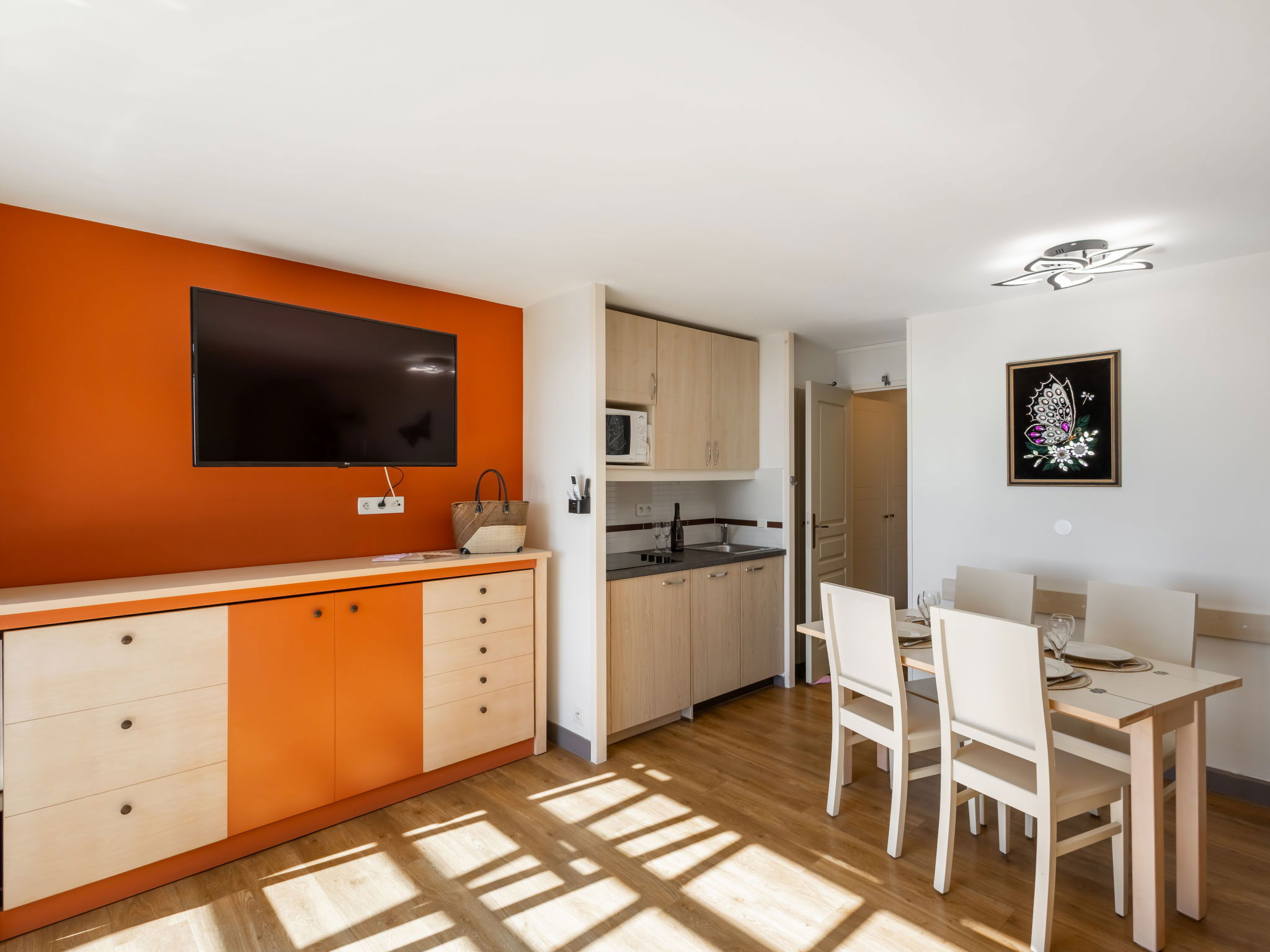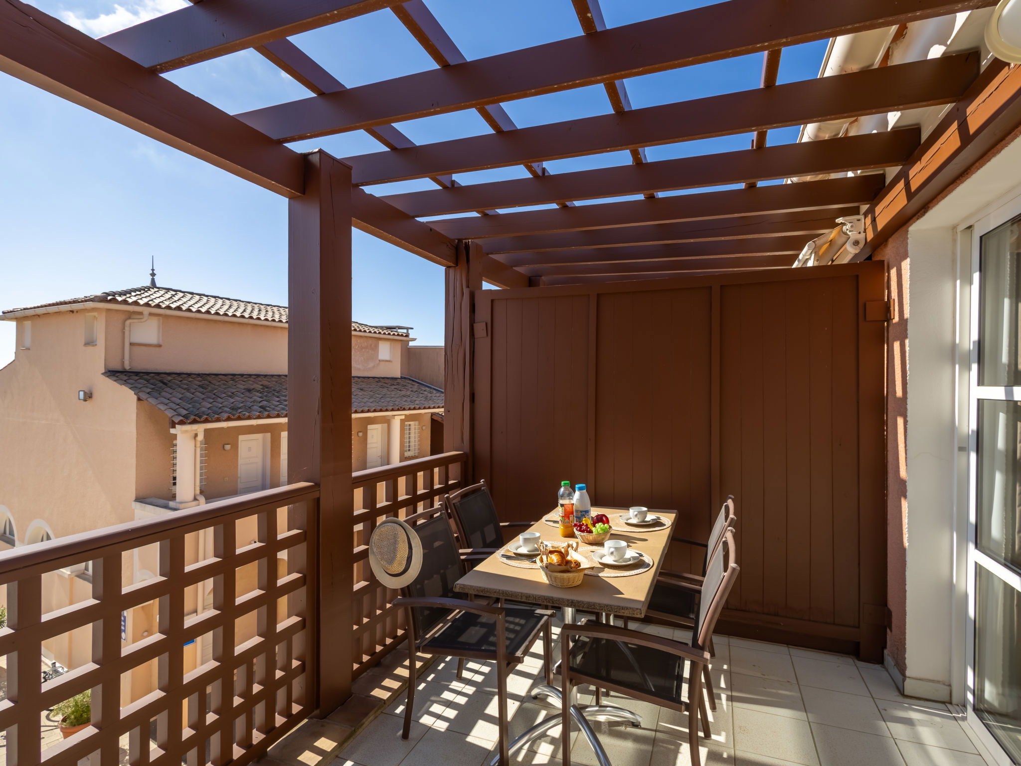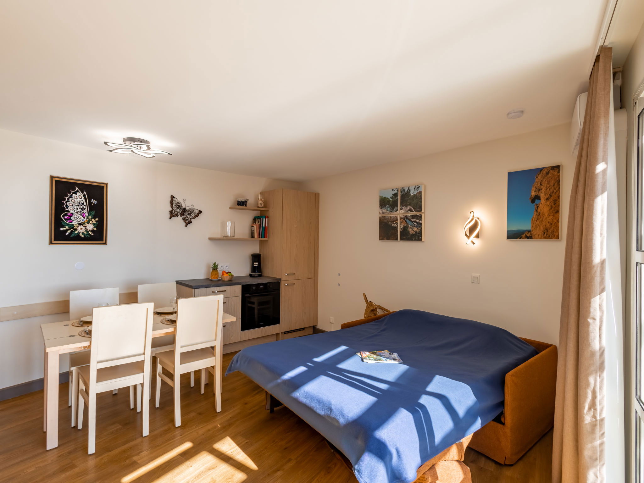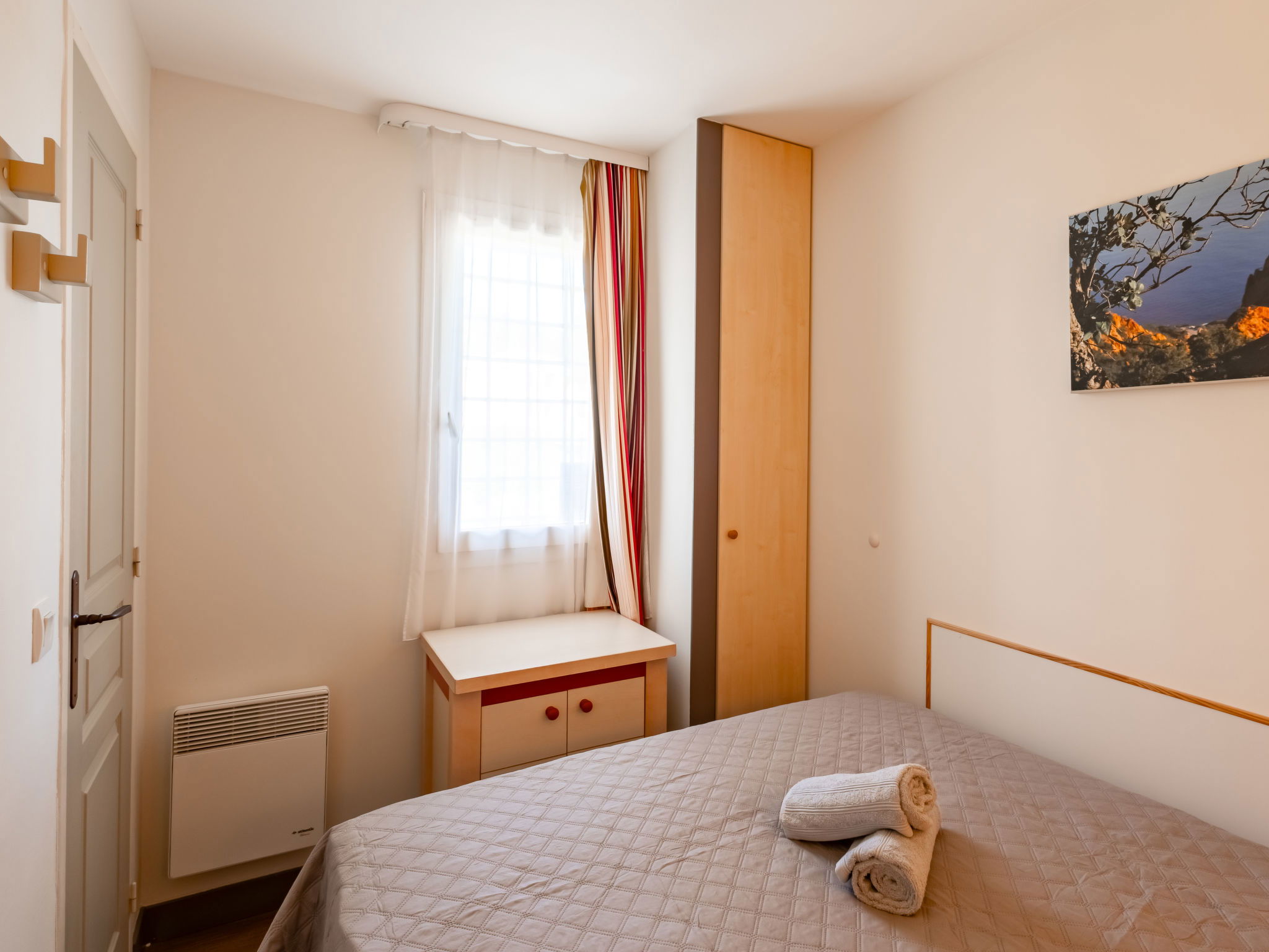 "L'Esquinade ", 2-room apartment 36 m2 on 2nd floor. Living room with 1 pull-out bed (2 x 80 cm, length 190 cm), TV (flat screen), air conditioning. Exit to the terrace. 1 room with 1 french bed (140 cm, length 190 cm). Kitchenette (4 hot plates, dishwasher, toaster, kettle, microwave, electric coffee machine, combination microwave). Bathroom, sep. WC. Electric heating. Terrace 8 m2. Terrace furniture. View of the sea. Parking space n 2166 (roofed, 1 car), height 180 cm. Please note: non-smokers only. Maximum 1 small pet/ dog allowed. Smoke alarm. Offer by a private individual according to Art. 155, IV of CGI. 831180624293