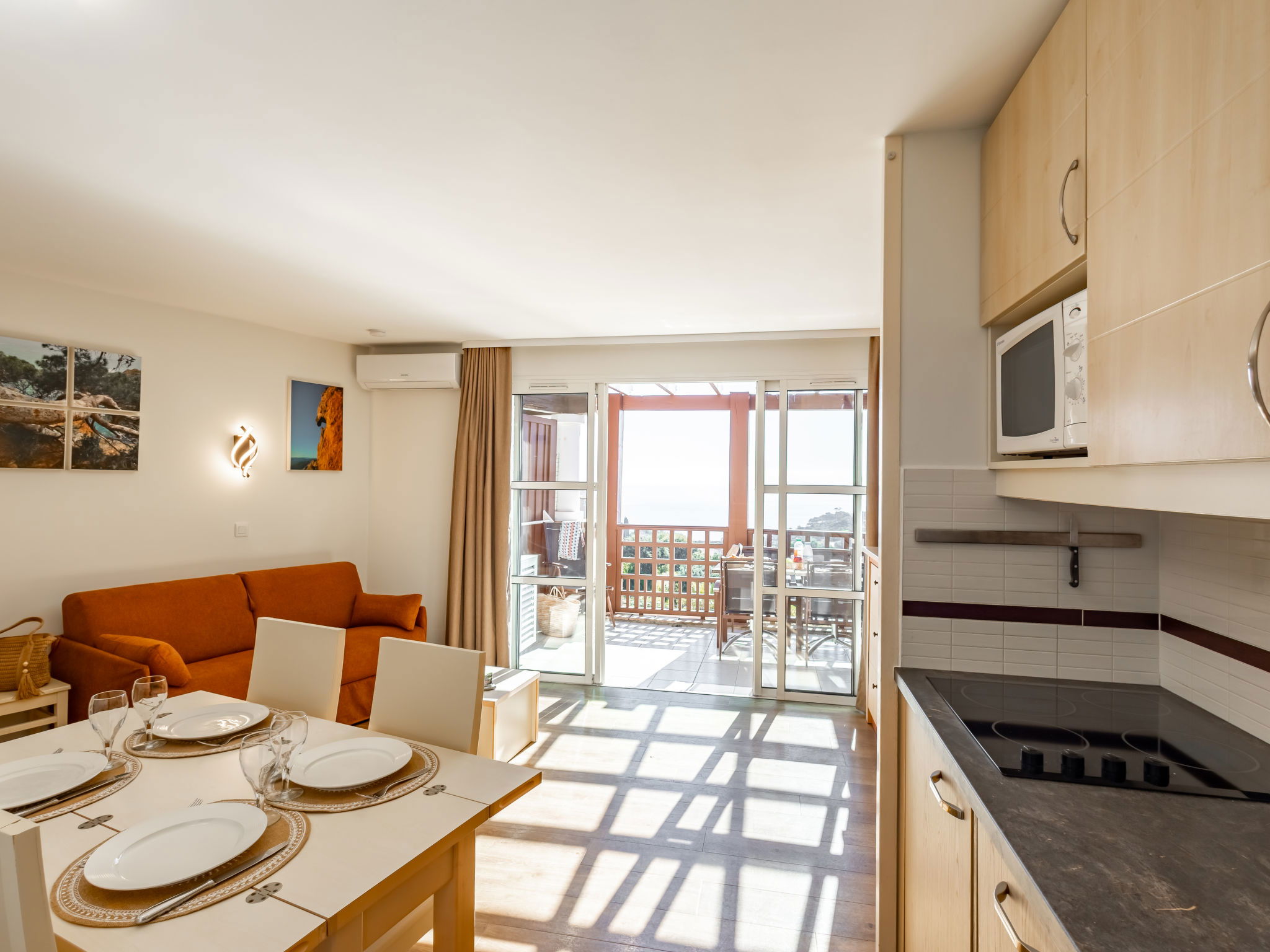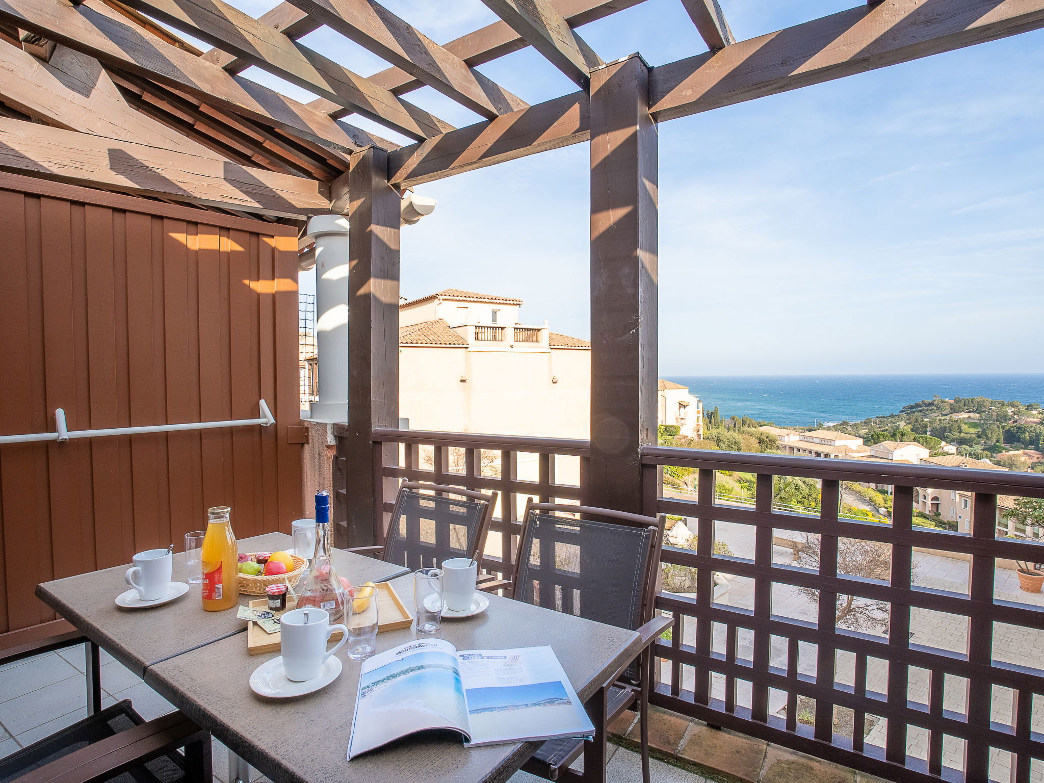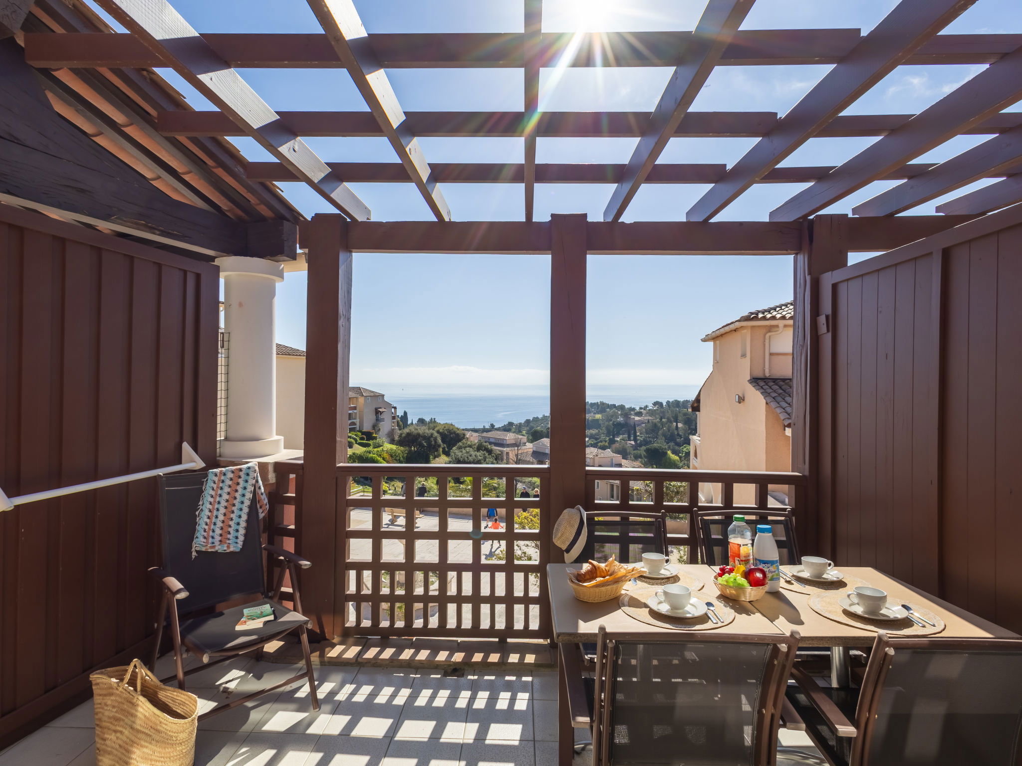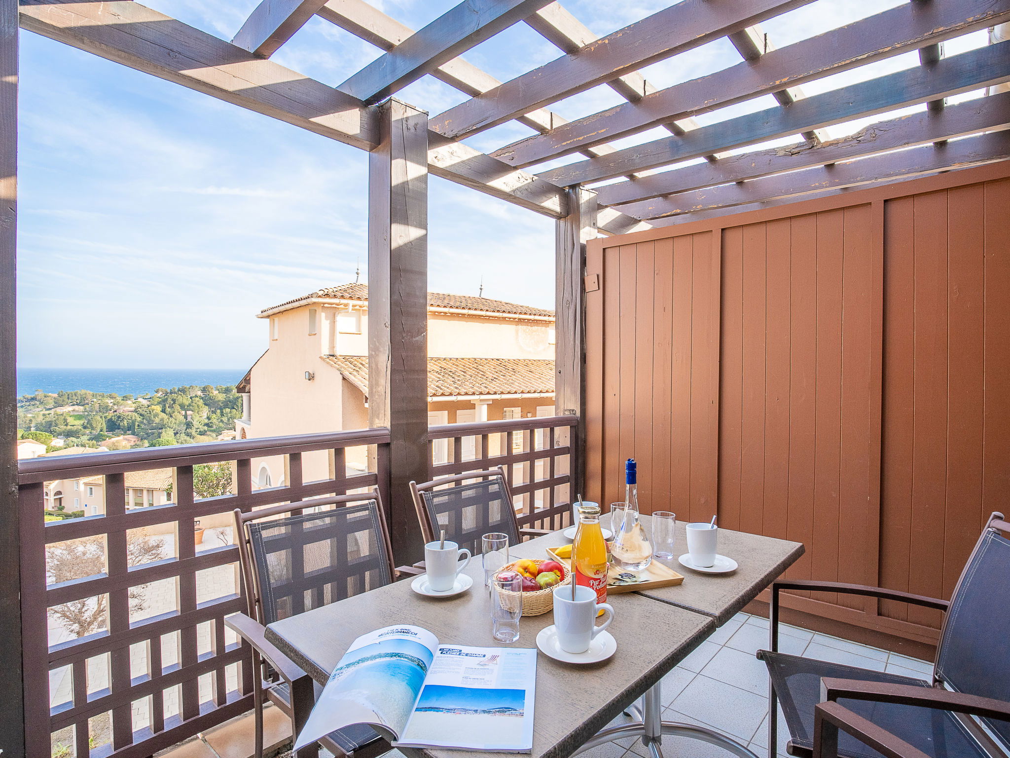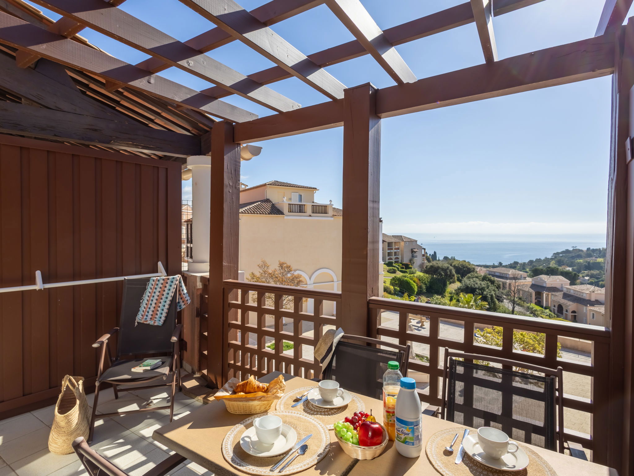 Large resort "Village Cap Estérel - L'Esquinade", built in 1990. On the outskirts, 2 km from the centre of Agay, on a slope, in the residential district, 900 m from the sea, 900 m from the beach, road to cross, on the golf course, in a pedestrian area. For shared use: park 210 ha, 5 swimming pools (seasonal availability: 06.Apr. - 03.Nov.). Children's pool, boccia, children's playground (slide, swing). In the complex: spa area (extra), shopping facilities, laundry (extra). Shop, grocery 500 m, supermarket 6 km, restaurant, bakery, café, bicycle rental 500 m, bus stop "Ligne 21" 300 m, railway station "Saint-Raphaël-Valescure - Agay" 9 km, sandy beach "Le Pourrousset" 800 m. Marina 1 km, golf course (9 hole) 300 m, tennis 500 m. Nearby attractions: Anthéor 8 km, Saint-Raphaël 9 km, Fréjus 13 km, Cannes 33 km, Saint-Tropez 50 km, Nice 76 km. Well-known lakes can easily be reached: Lac Saint-Cassien. Hiking paths: Massif de l'Estérel. Please note: car-free holiday complex, no lift. Entertainment in the season. Suitable for families, childminding in the season (extra). Guarded residence. The keys‘ handover takes place by the agency in Cap Estérel. The apartment is located in a zone with limited traffic. Additional accommodations can be booked. Access to the apartments is via steps, even on the ground floor.