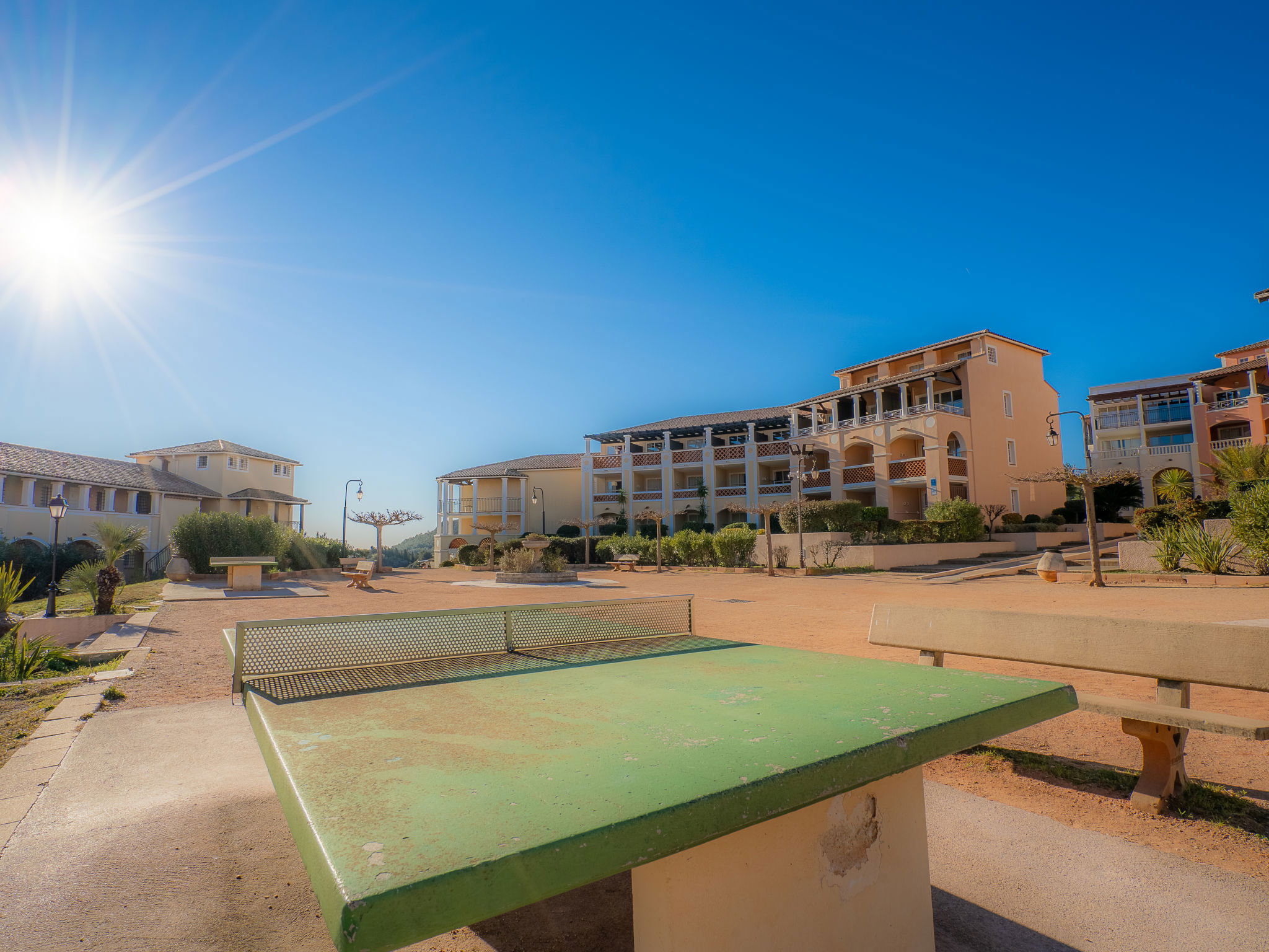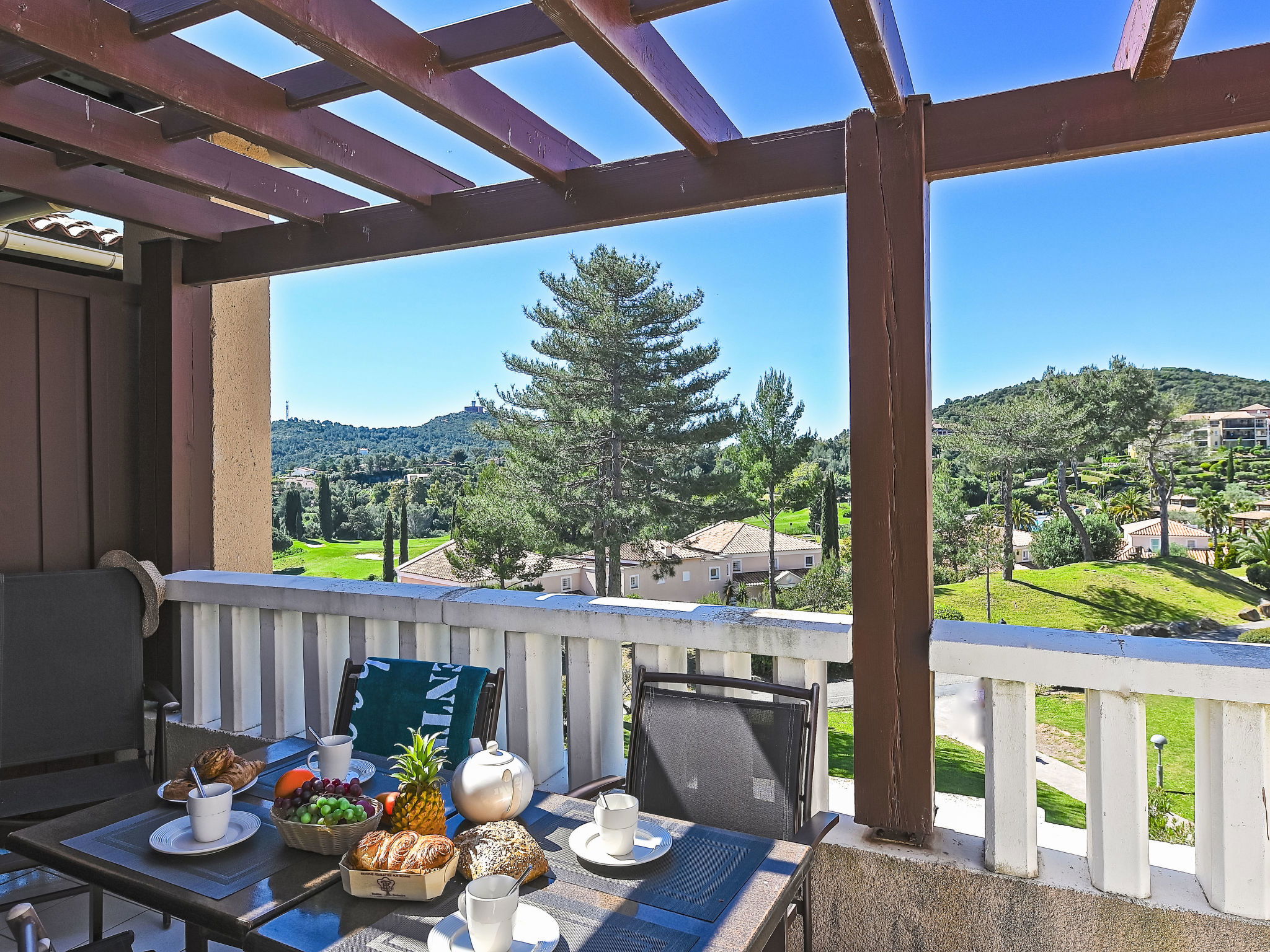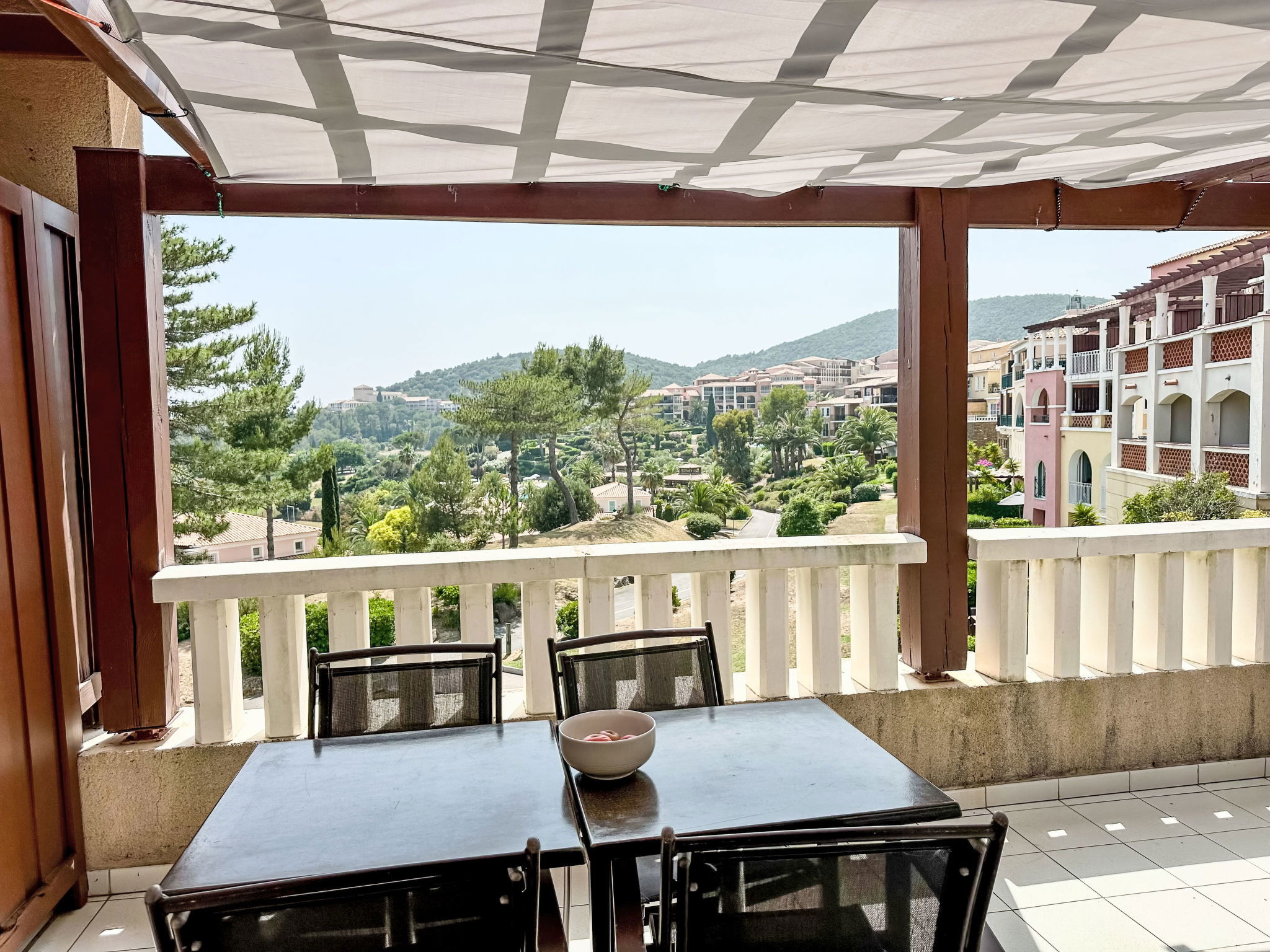 Large resort "Village Cap Estérel - Le Belvédère". On the outskirts, 2 km from the centre of Agay, on a slope, in the residential district, 400 m from the sea, 350 m from the beach, road to cross, on the golf course, in a pedestrian area. For shared use: park 210 ha, 5 swimming pools (seasonal availability: 06.Apr. - 03.Nov.). Children's pool, boccia, children's playground (slide, swing). In the complex: spa area (extra), shopping facilities, laundry (extra). Shop, grocery 200 m, supermarket 6 km, restaurant 150 m, bakery 500 m, bus stop "Ligne 21" 300 m, railway station "Saint-Raphaël-Valescure TGV" 9 km, sandy beach "Tiki Plage" 900 m. Marina 1 km, golf course (9 hole), tennis 500 m. Nearby attractions: Anthéor 8 km, Saint-Raphaël 9 km, Fréjus 13 km, Cannes 33 km, Saint-Tropez 50 km, Nice 76 km. Well-known lakes can easily be reached: Lac Saint-Cassien. Hiking paths: Massif de l'Estérel. Please note: car-free holiday complex, no lift. Entertainment in the season. Suitable for families, childminding in the season (extra). Guarded residence. The keys‘ handover takes place by the agency in Cap Estérel. Additional accommodations can be booked. Access to the apartments is via steps, even on the ground floor.
