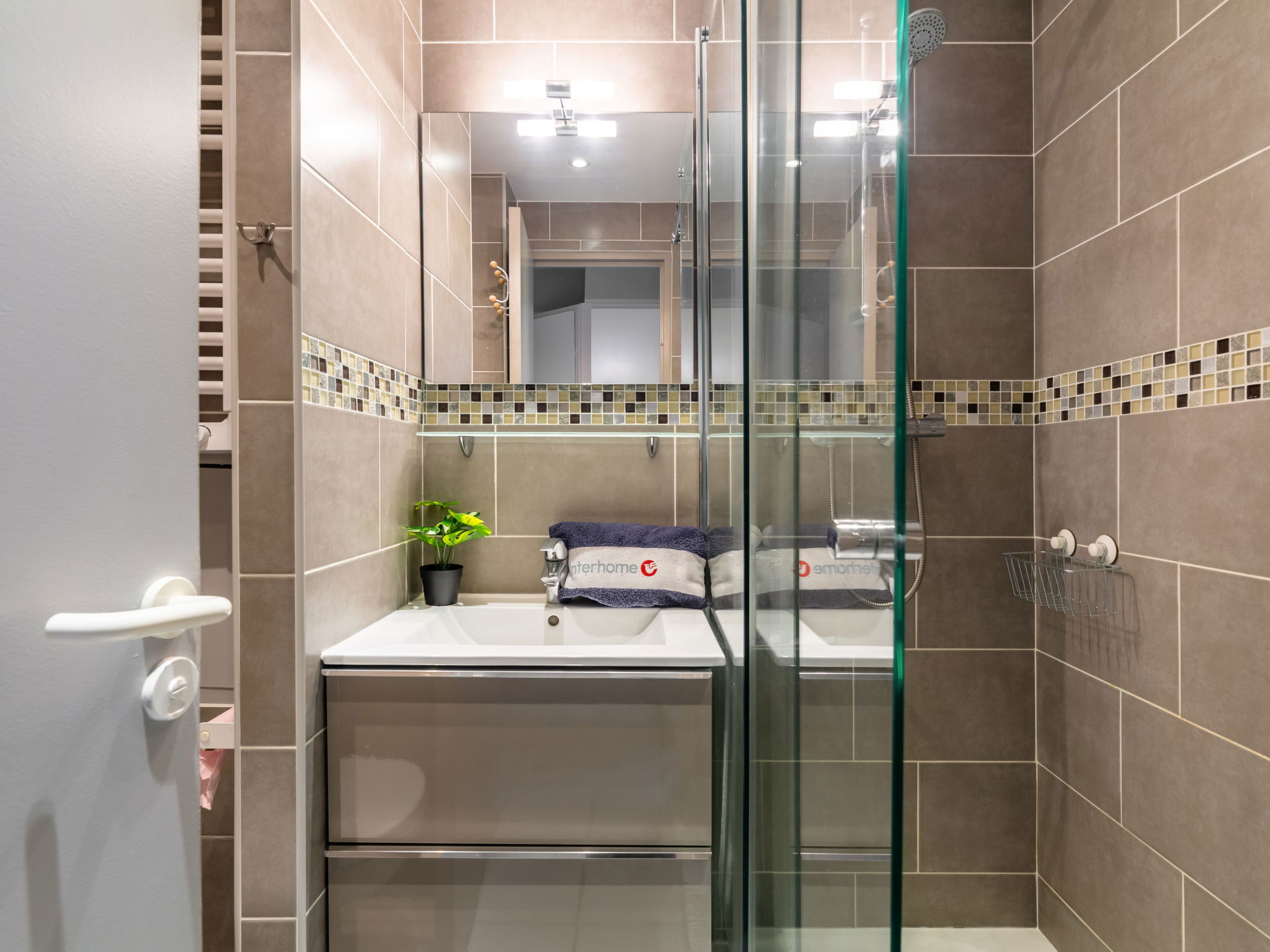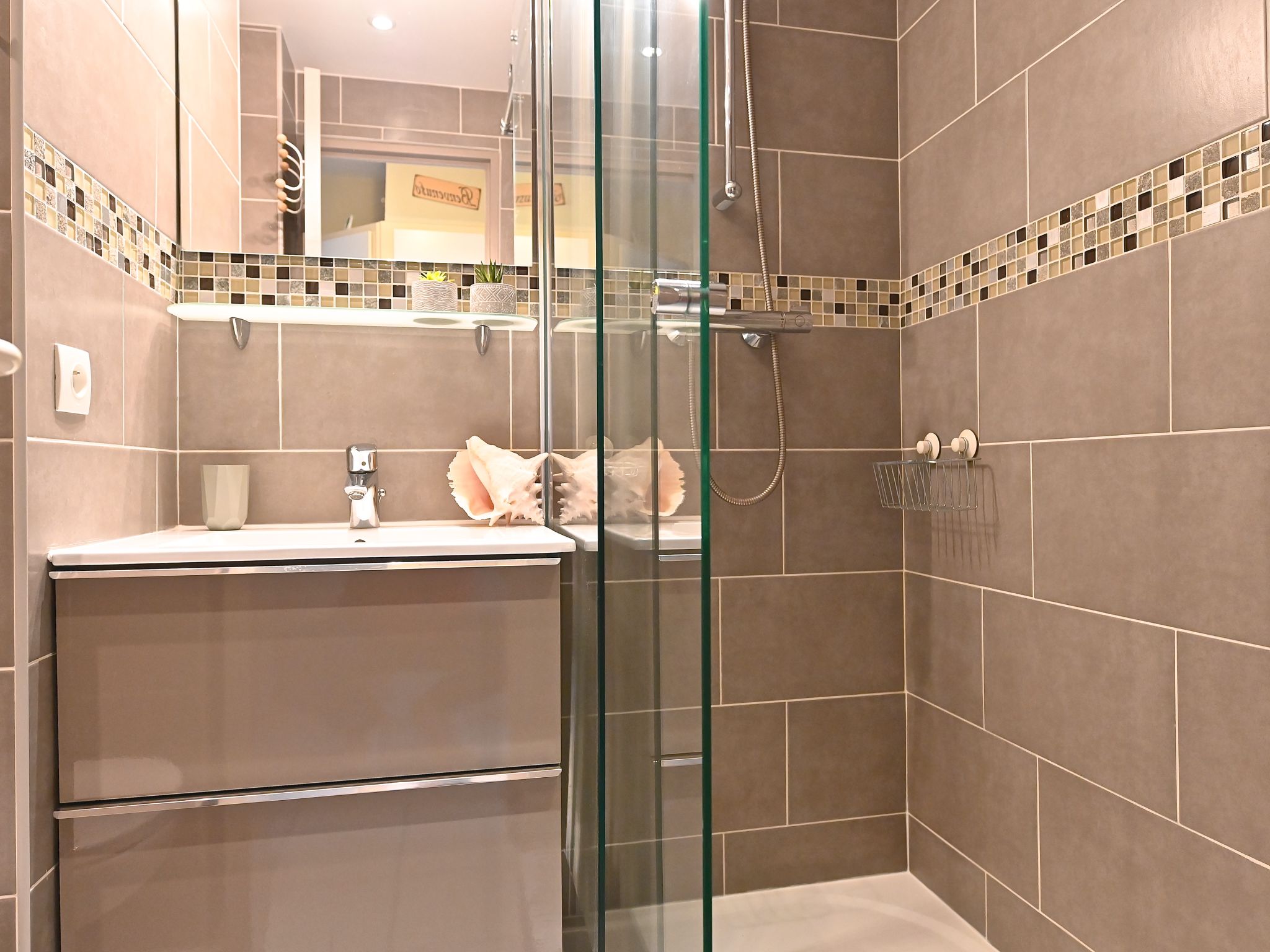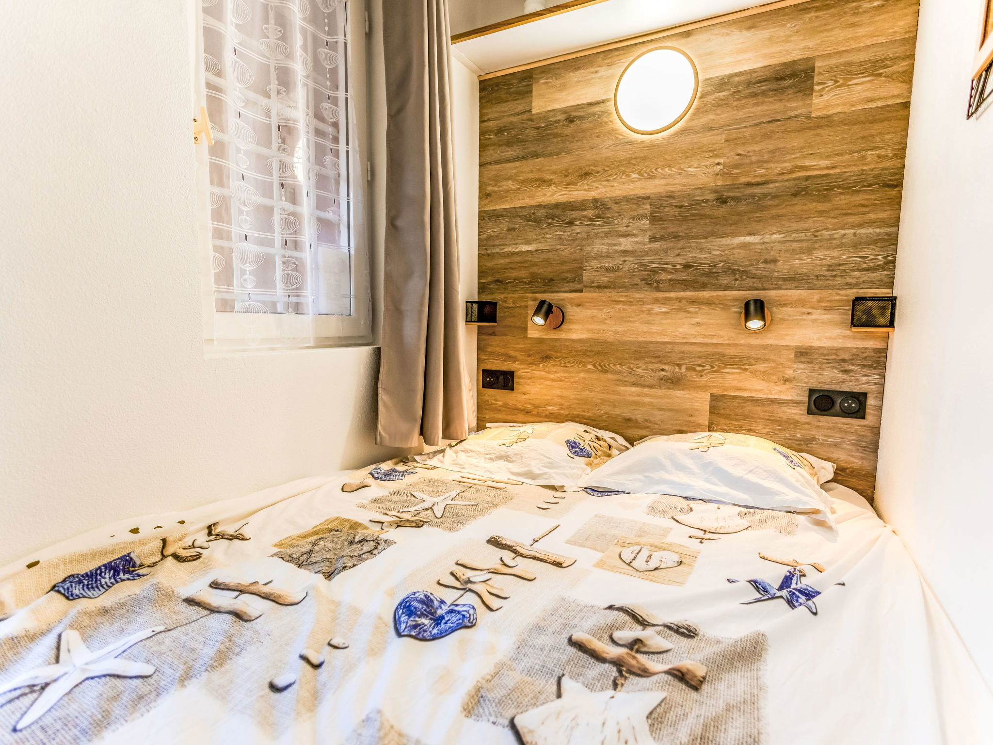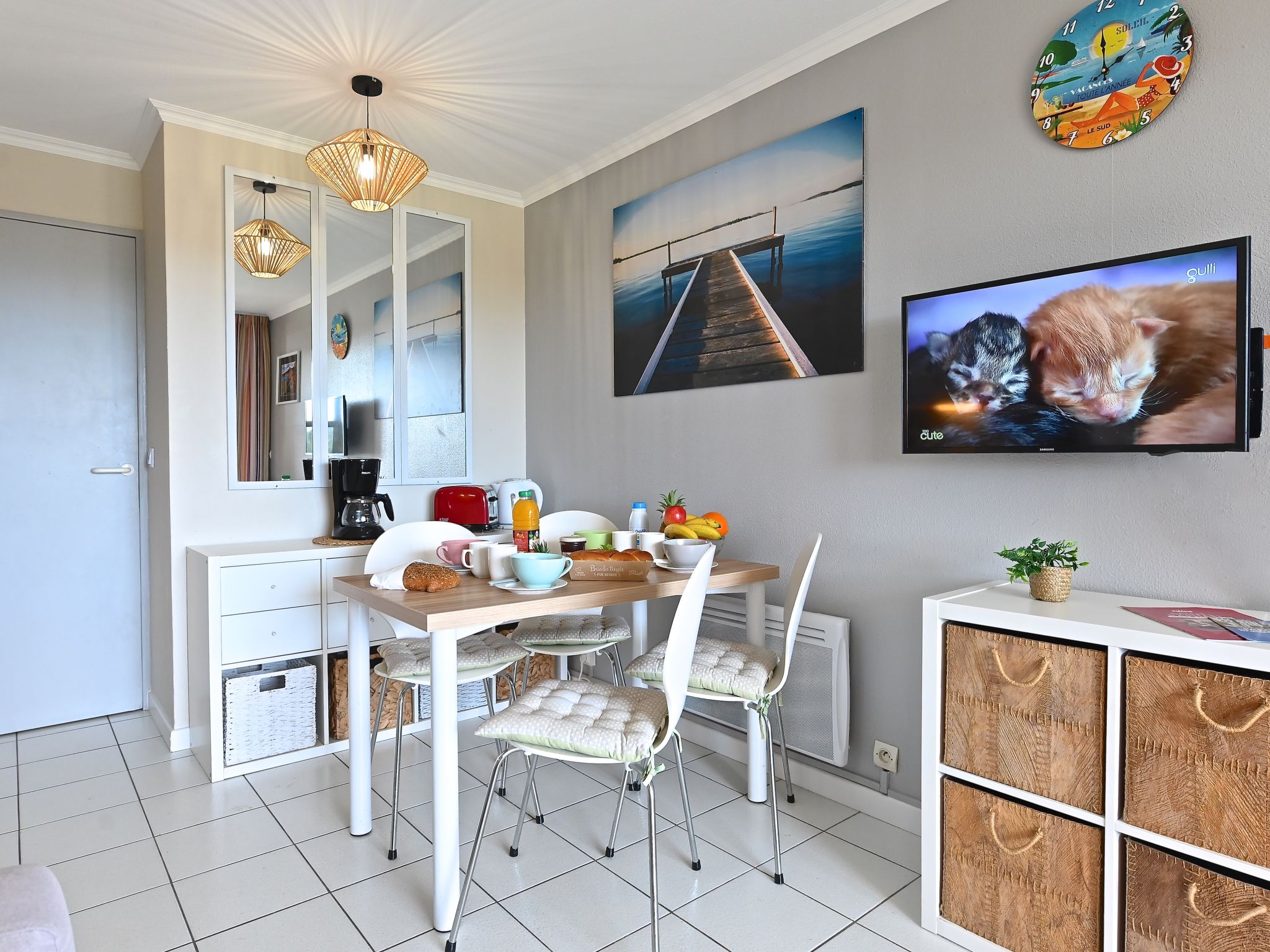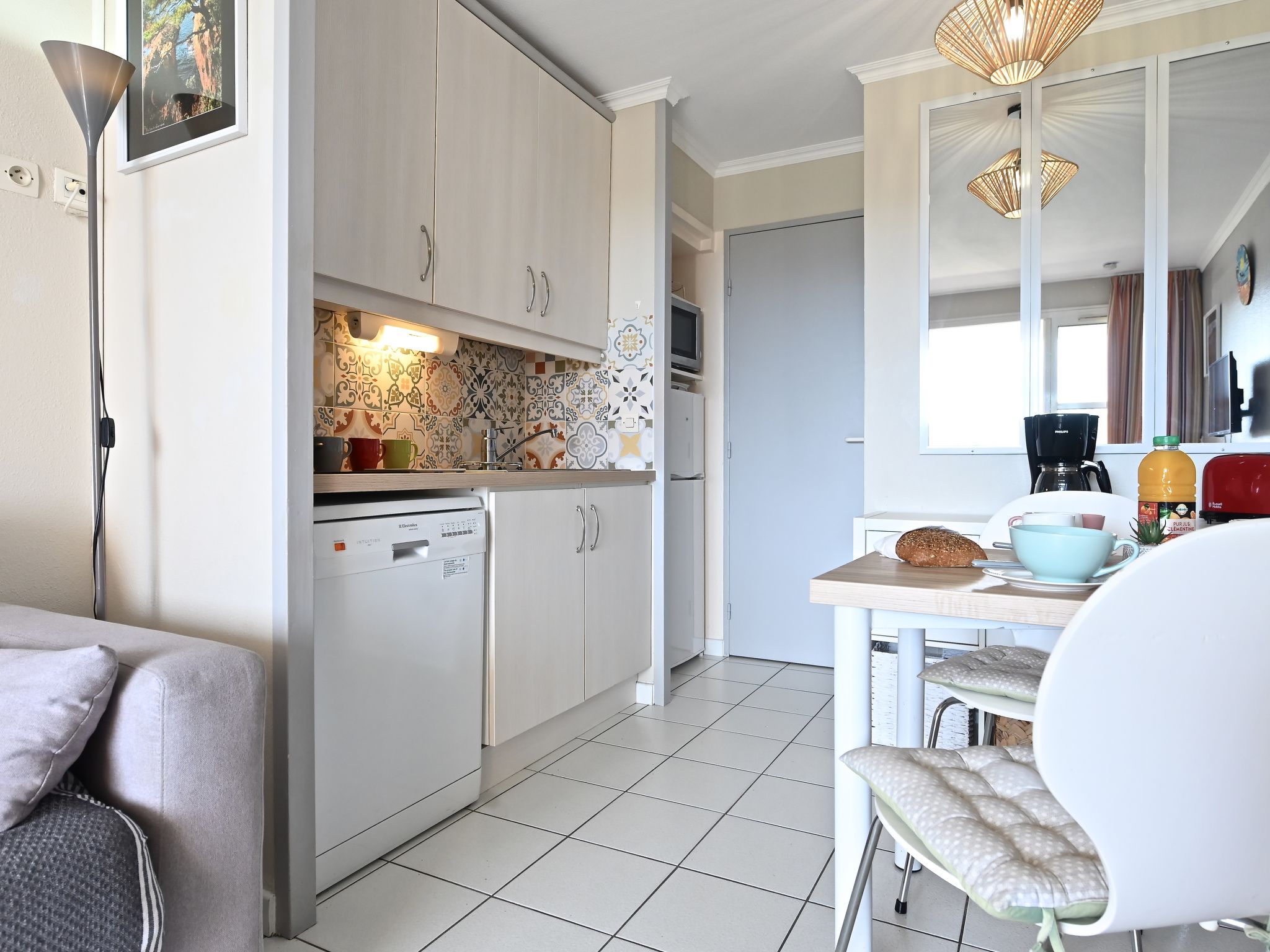"L'Esquinade ", 1-room studio 24 m2, on the ground floor. Bright, renovated in 2022, comfortable furnishings: living room with 1 sofabed (140 cm, length 190 cm), TV (flat screen), air conditioning and fan. Exit to the terrace. Alcove with 1 french bed (1 x 140 cm, length 190 cm). Kitchenette (2 hot plates, dishwasher, toaster, kettle, freezer, electric coffee machine, combination microwave). Shower/WC. Electric heating. Terrace 8 m2, roofed. Terrace furniture, electric barbecue. Beautiful view of the sea and golf course. Facilities: Internet (WiFi, extra). Parking (1 car). Please note: non-smokers only. 1 small pet/ dog allowed. Smoke alarm. Instead of an enclosed bedroom, some sleeping areas are located in an open-plan area (gallery, alcove, etc.). Offer by a private individual according to Art. 155, IV of CGI.