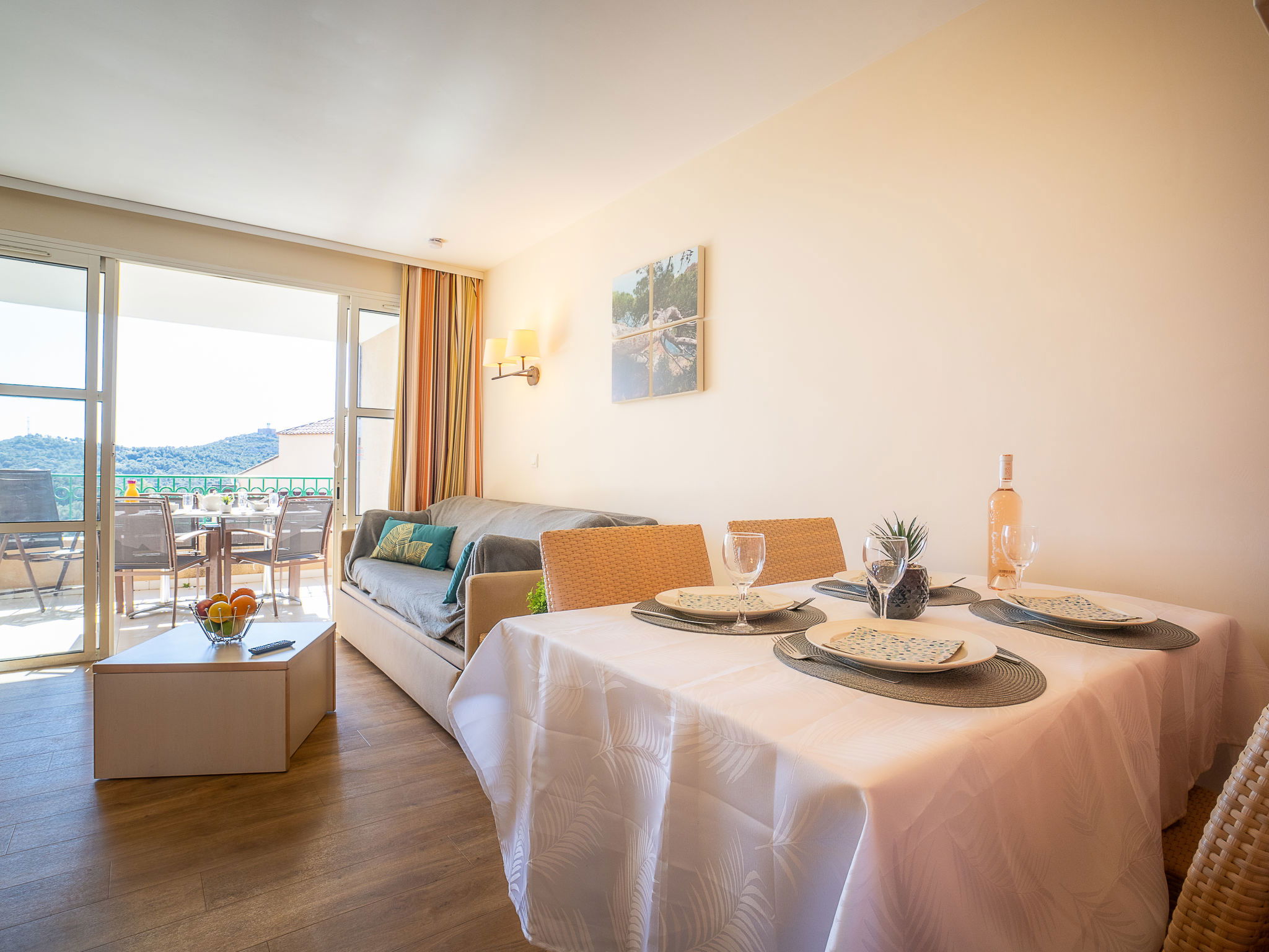 Large resort "Village Cap Estérel - L'Esquinade", built in 1990. On the outskirts, 2 km from the centre of Agay, on a slope, in the residential district, 900 m from the sea, 900 m from the beach, road to cross, on the golf course, in a pedestrian area. For shared use: park 210 ha, 5 swimming pools (seasonal availability: 06.Apr. - 03.Nov.). Children's pool, boccia, children's playground (slide, swing). In the complex: spa area (extra), shopping facilities, laundry (extra). Shop, grocery 500 m, supermarket 6 km, restaurant, bakery, café, bicycle rental 500 m, bus stop "Ligne 21" 300 m, railway station "Saint-Raphaël-Valescure - Agay" 9 km, sandy beach "Le Pourrousset" 800 m. Marina 1 km, golf course (9 hole) 300 m, tennis 500 m. Nearby attractions: Anthéor 8 km, Saint-Raphaël 9 km, Fréjus 13 km, Cannes 33 km, Saint-Tropez 50 km, Nice 76 km. Well-known lakes can easily be reached: Lac Saint-Cassien. Hiking paths: Massif de l'Estérel. Please note: car-free holiday complex, no lift. Entertainment in the season. Suitable for families, childminding in the season (extra). Guarded residence. The keys‘ handover takes place by the agency in Cap Estérel. The apartment is located in a zone with limited traffic. Additional accommodations can be booked. Access to the apartments is via steps, even on the ground floor.