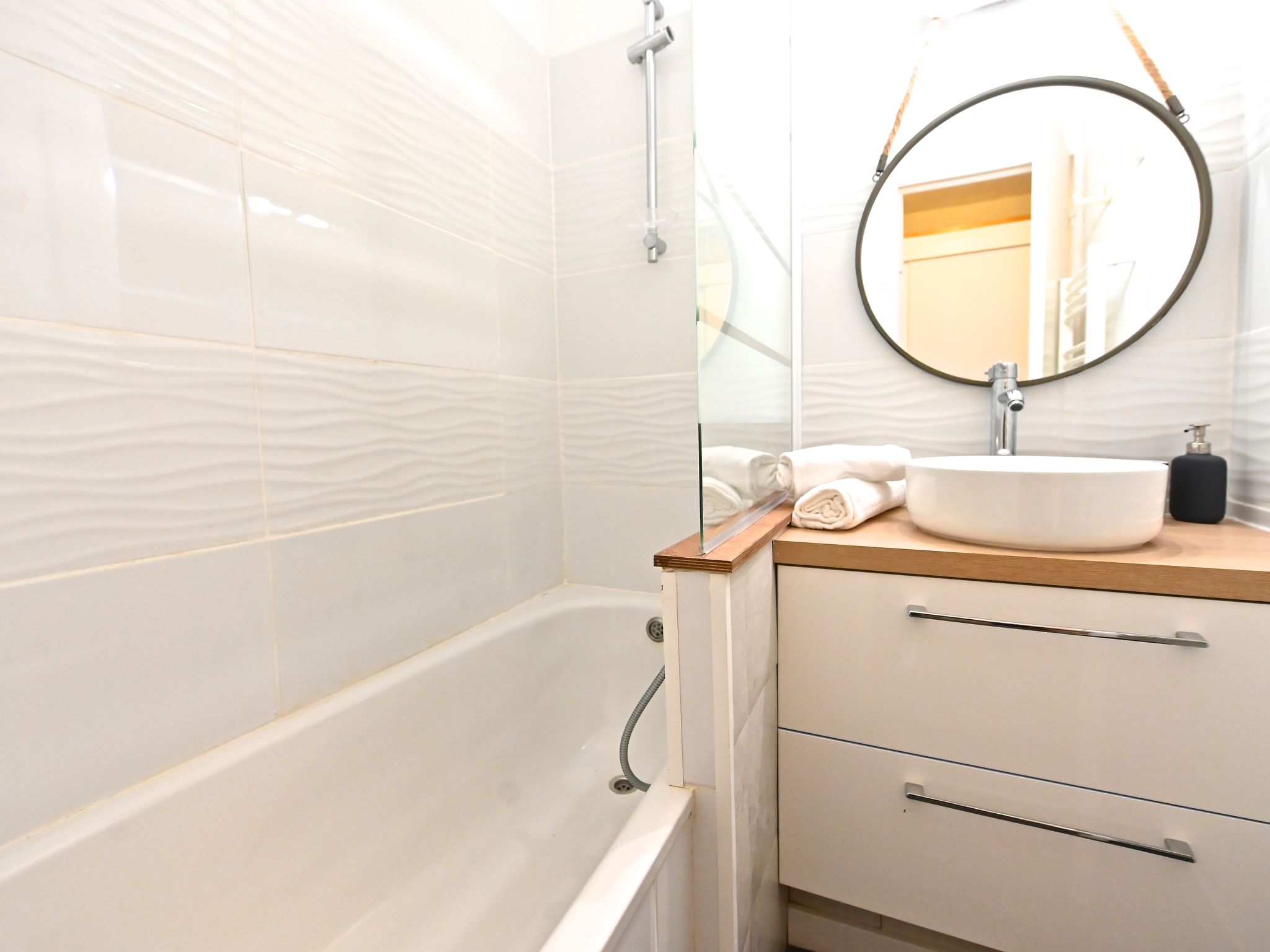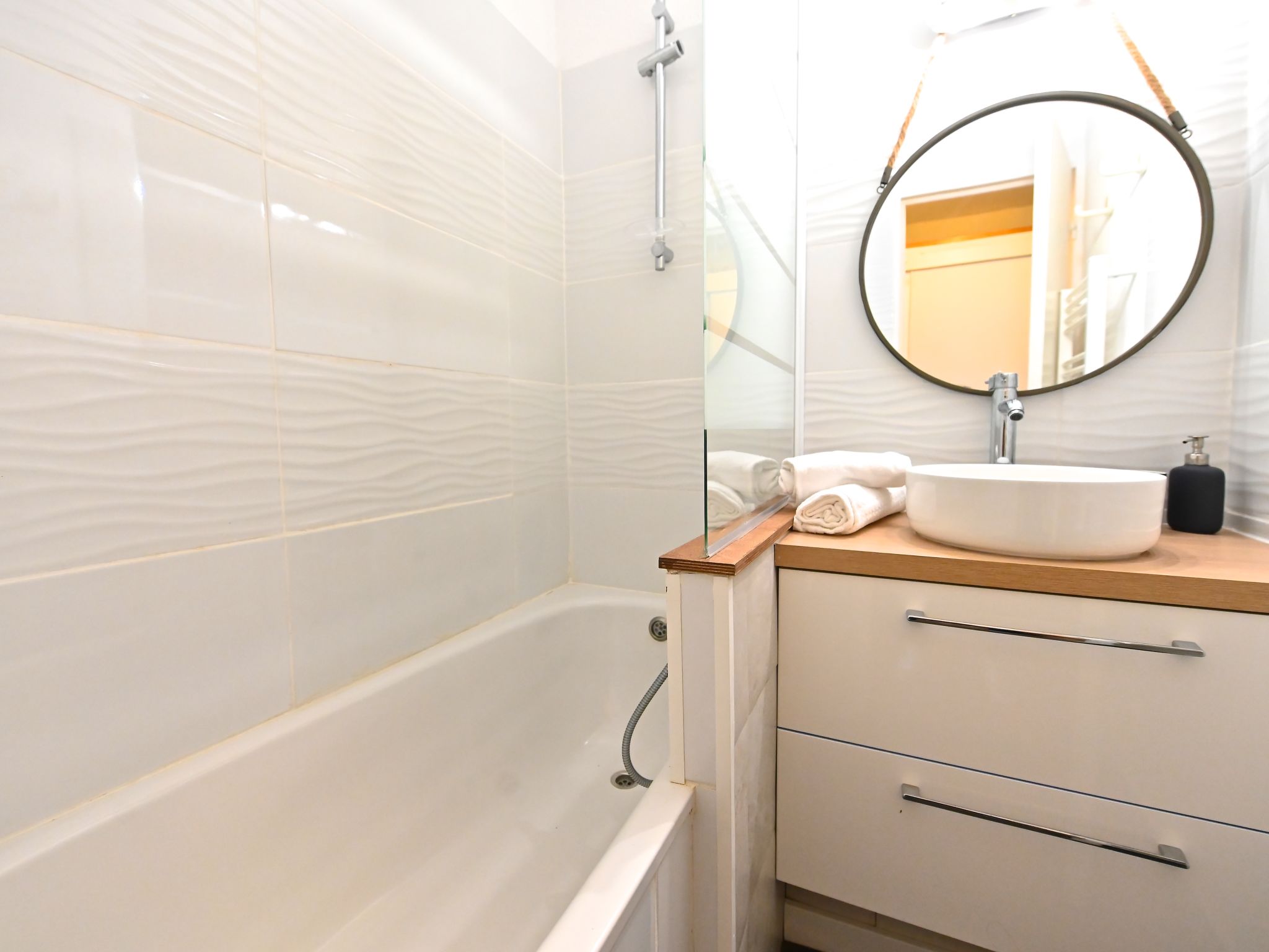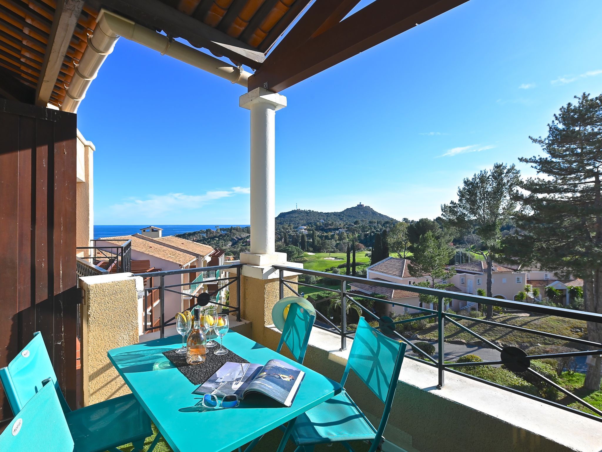 "Le Belvédère R4 320", 2-room apartment 30 m2 on 2nd floor. Renovated in 2023, comfortable furnishings: living room with 1 pull-out bed (2 pers. 2 x 90 cm, length 190 cm), TV (flat screen), fan. Exit to the terrace. 1 room with 1 french bed (1 x 140 cm, length 190 cm). Kitchenette (dishwasher, 2 induction hot plates, toaster, kettle, microwave, freezer, electric coffee machine, Capsules for coffee machine (Nespresso) extra). Bathroom, sep. WC. Terrace 9 m2, south facing position and west facing position. Terrace furniture. Side view of the sea, the garden and golf course. Facilities: washing machine. Internet (WiFi, extra). Parking (1 car). Please note: non-smokers only. Maximum 1 small pet/ dog allowed. Smoke alarm. Offer by a private individual according to Art. 155, IV of CGI.
