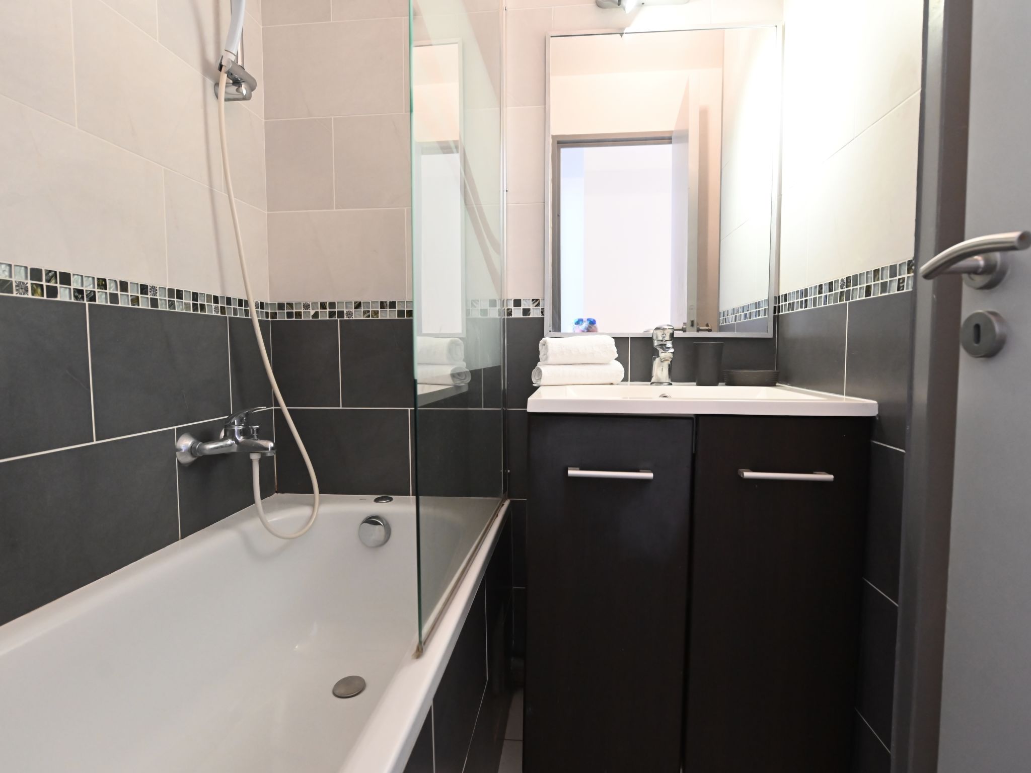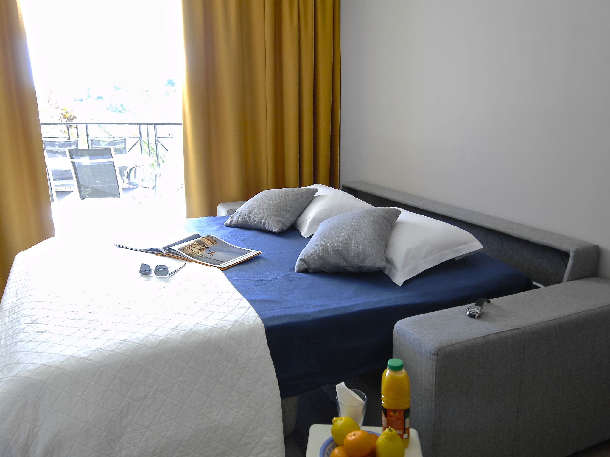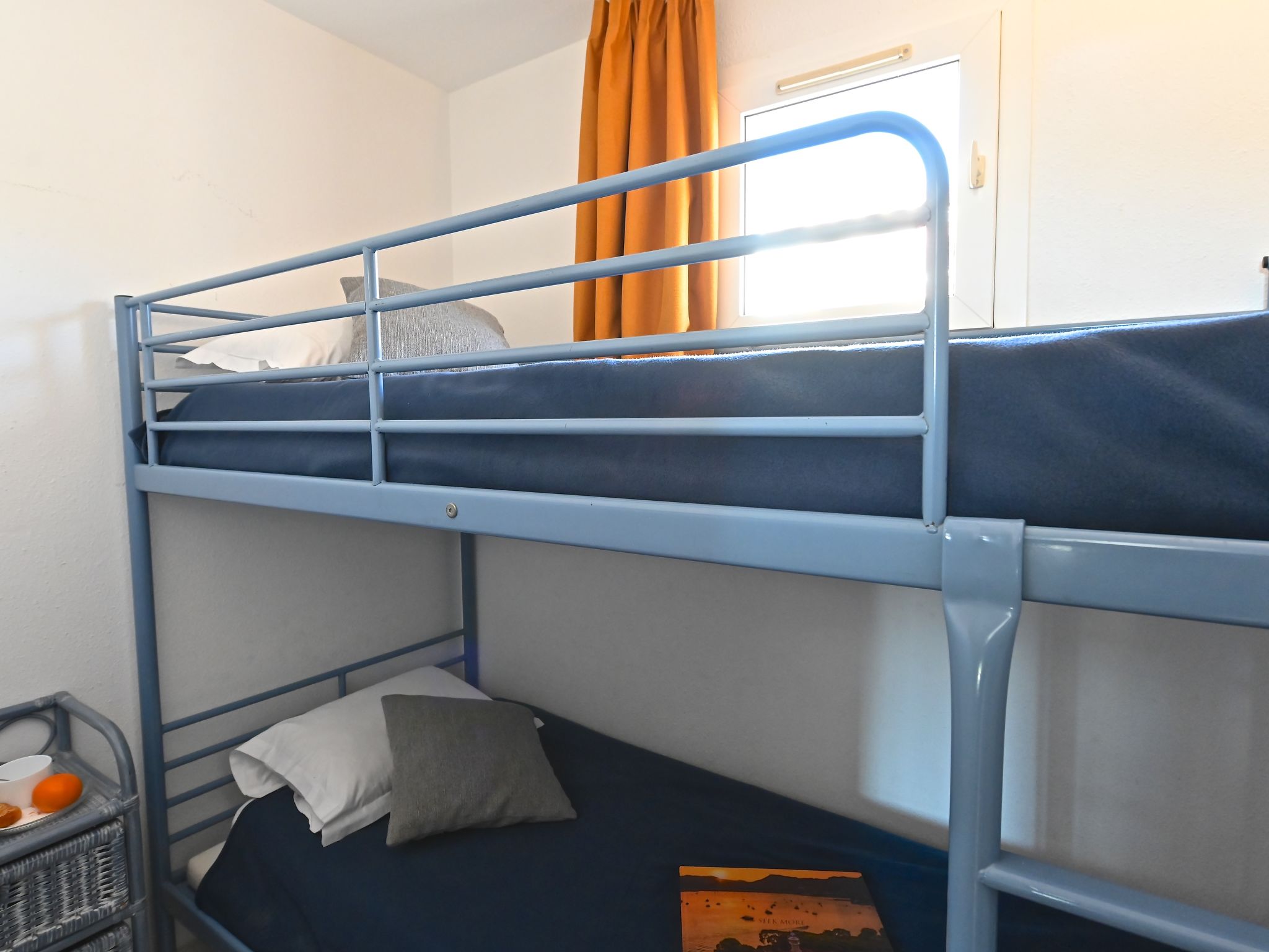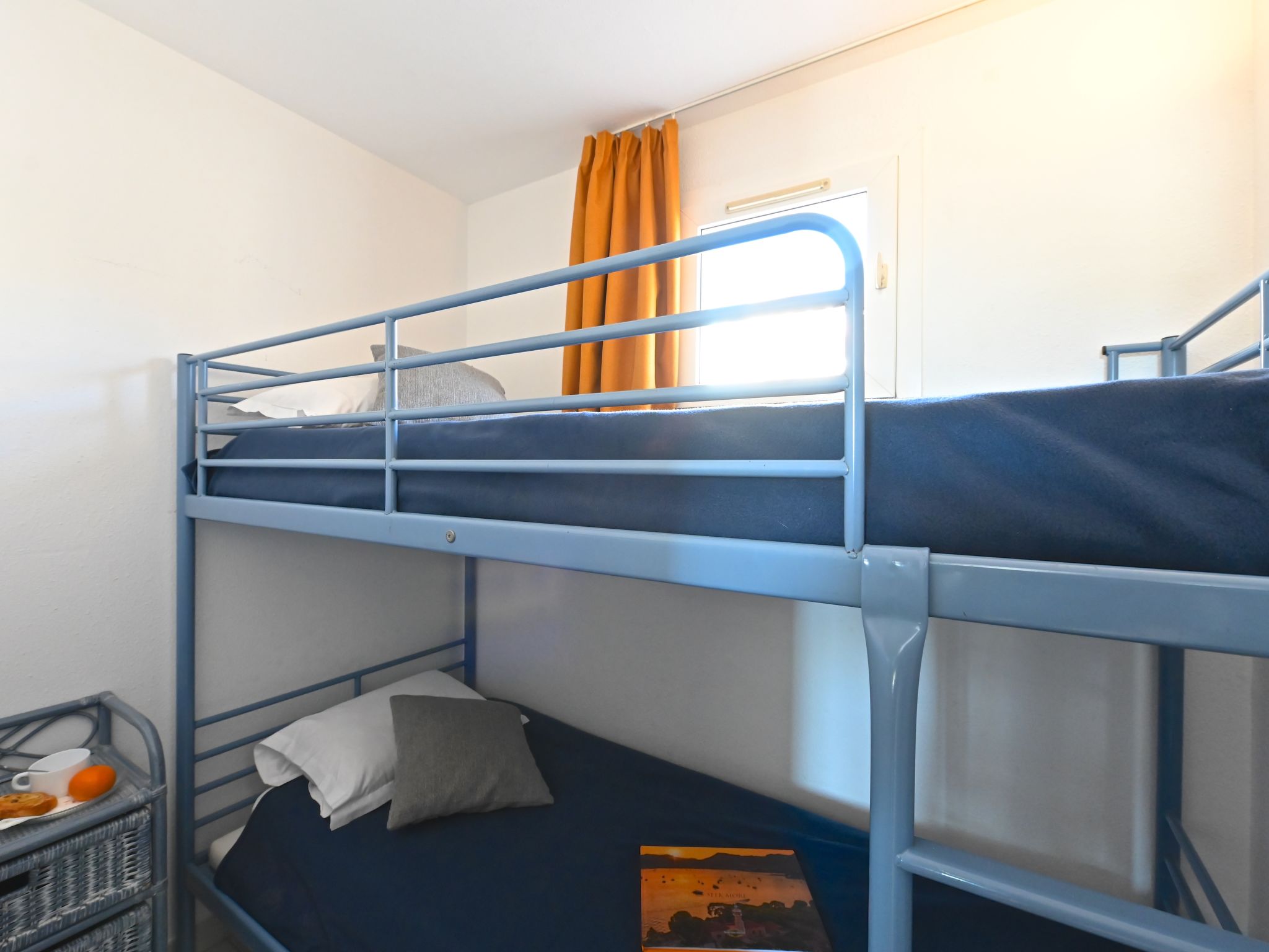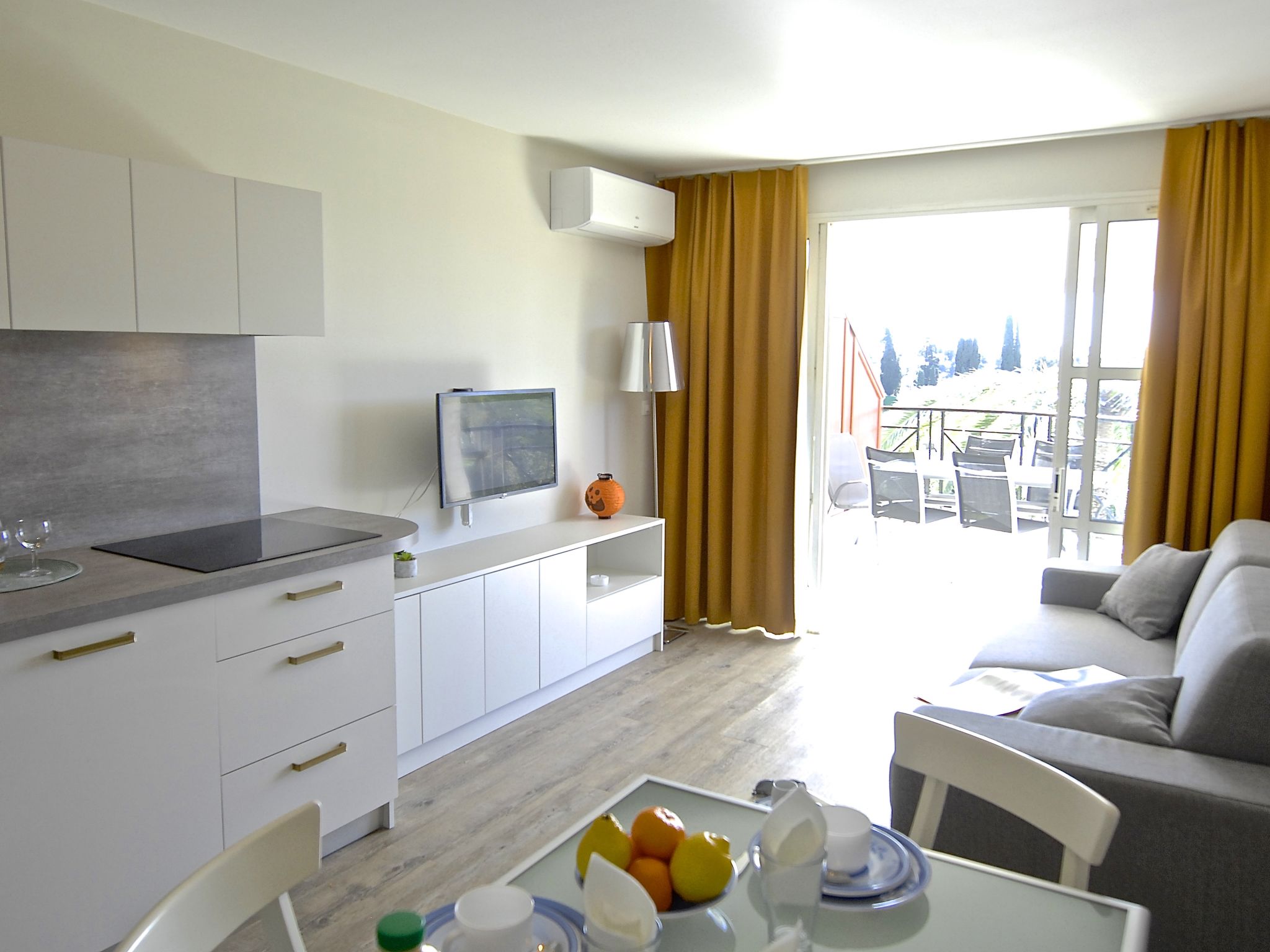 "Le Village ", 3-room apartment 39 m2 on 2 levels, on the ground floor, south-west facing position. Spacious and bright, fully renovated in 2022, modern and tasteful furnishings: living room with sliding door south facing position with 1 double sofabed (160 cm, length 200 cm), TV (flat screen), air conditioning and forced-air heating. Exit to the terrace. Kitchenette (4 hot plates, oven, dishwasher, toaster, kettle, microwave, freezer, electric coffee machine, Capsules for coffee machine (Nespresso) extra). Shower/WC. Upper floor: sleeping alcove with 1 x 2 bunk beds (80 cm, length 190 cm). 1 room with panoramic window south facing position with 1 bed (160 cm, length 200 cm), air conditioning. Exit to the terrace. Bath/WC. Electric heating. Terrace 16 m2, south facing position and west facing position. Terrace furniture. View of the sea and golf course. Facilities: washing machine, baby cot for up to 2 year olds (extra). Internet (WiFi, extra). Parking space n 2525 (roofed). Please note: non-smokers only. 1 small pet/ dog allowed. Smoke alarm. Offer by a commercial proprietor according to Art. 155, IV, CGI