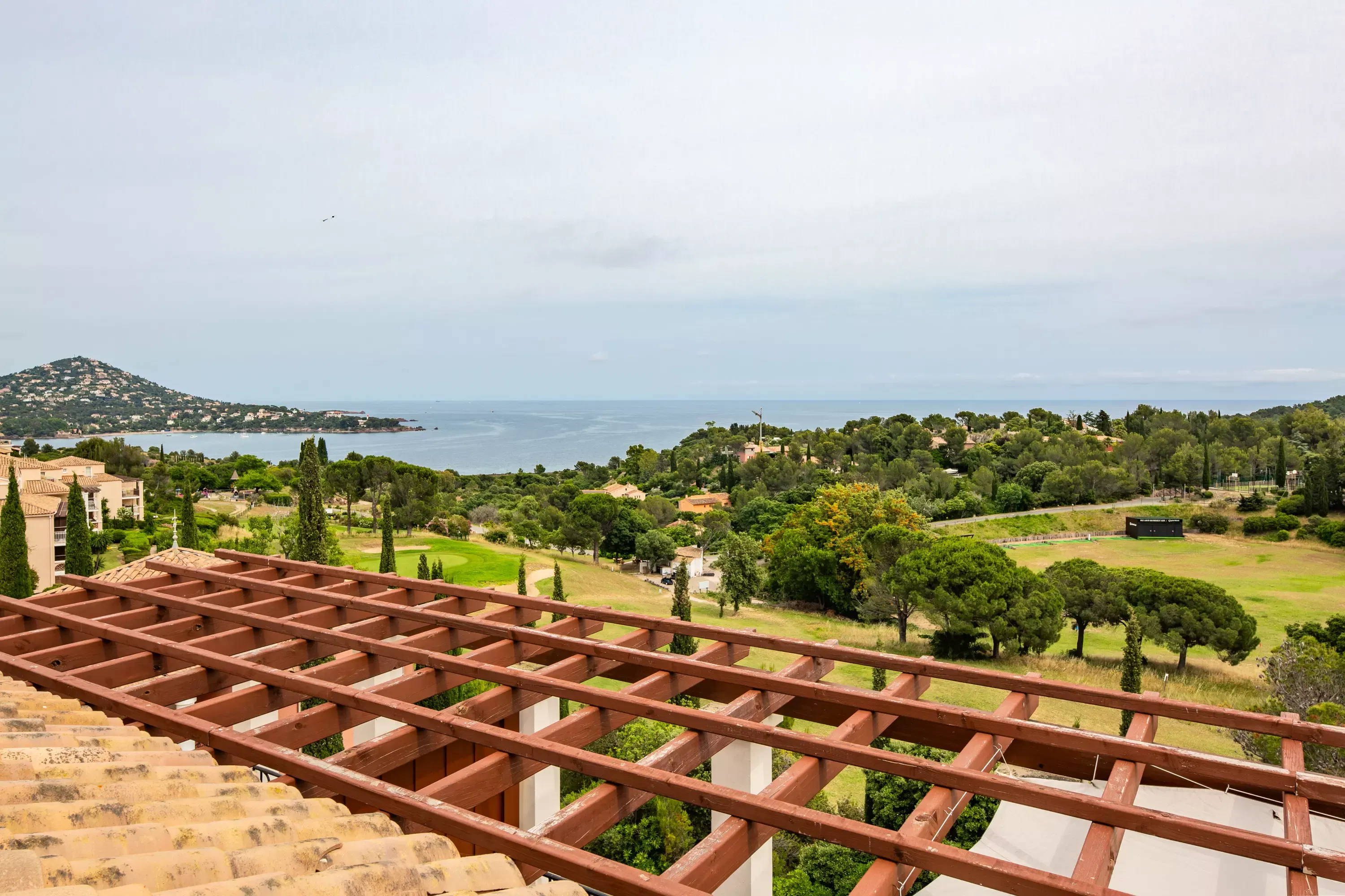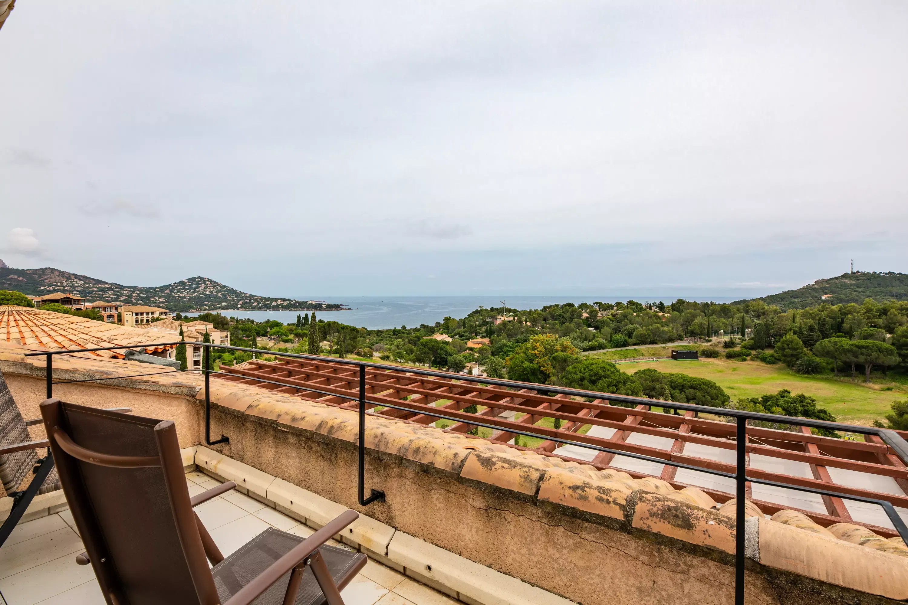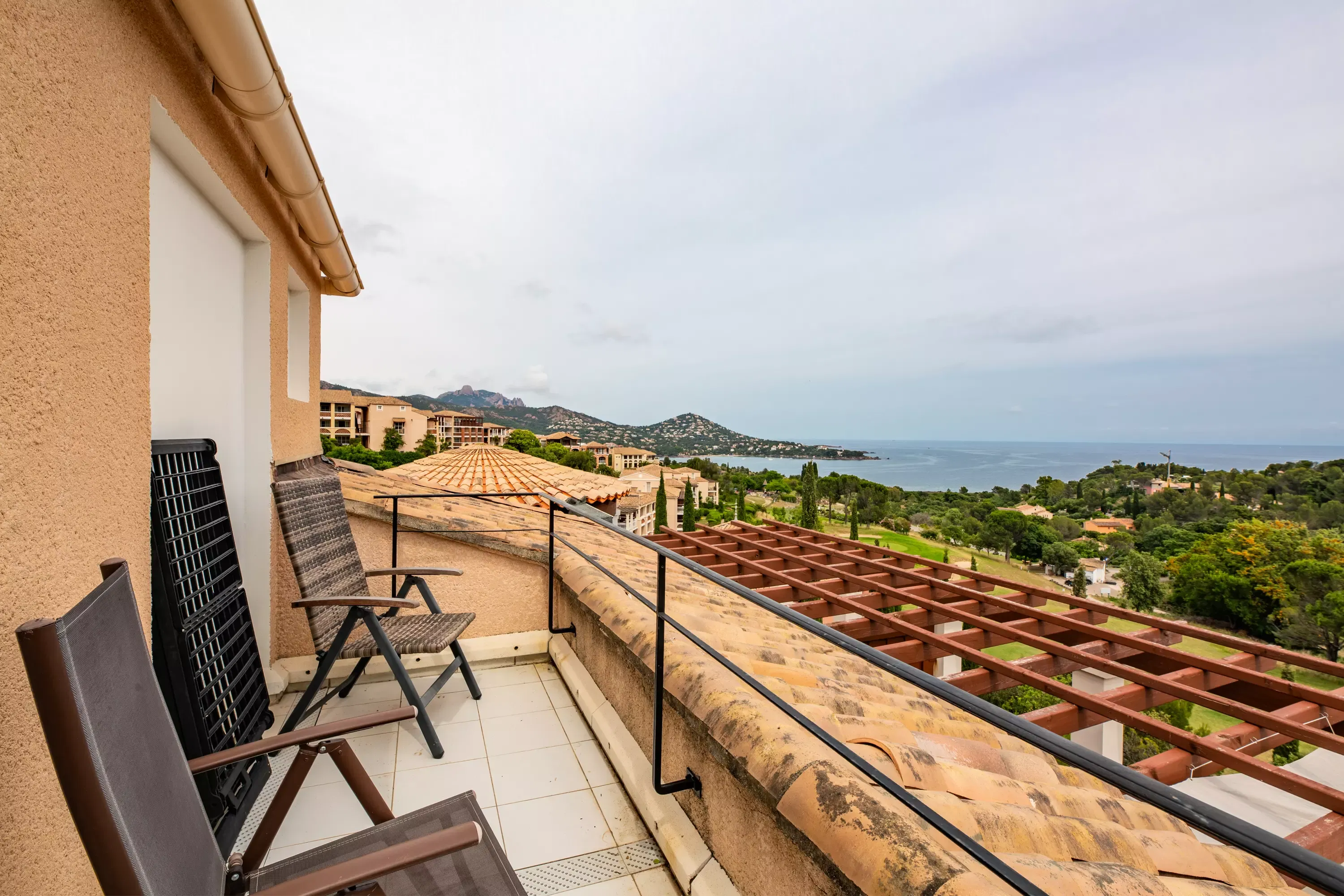 Bedroom 1 (upstairs): 1 double bed. Adjoining solarium, not overlooked, with magnificent views of the sea, the golf course and the Dramont.