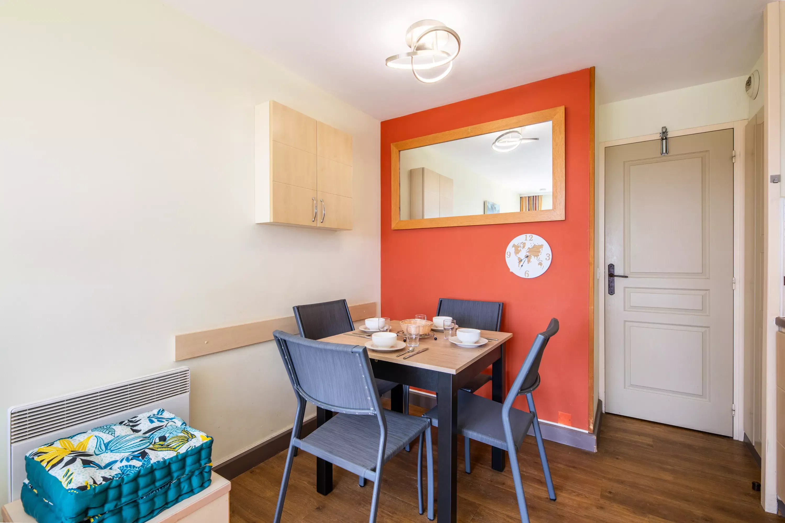 Living room composition: 2 sofa beds, 1 with a pull-out bed (sleeps 3, 1 of which is recommended for children), 2 reclining armchairs. Dining area: 1 table with 5 chairs + 1 stool.