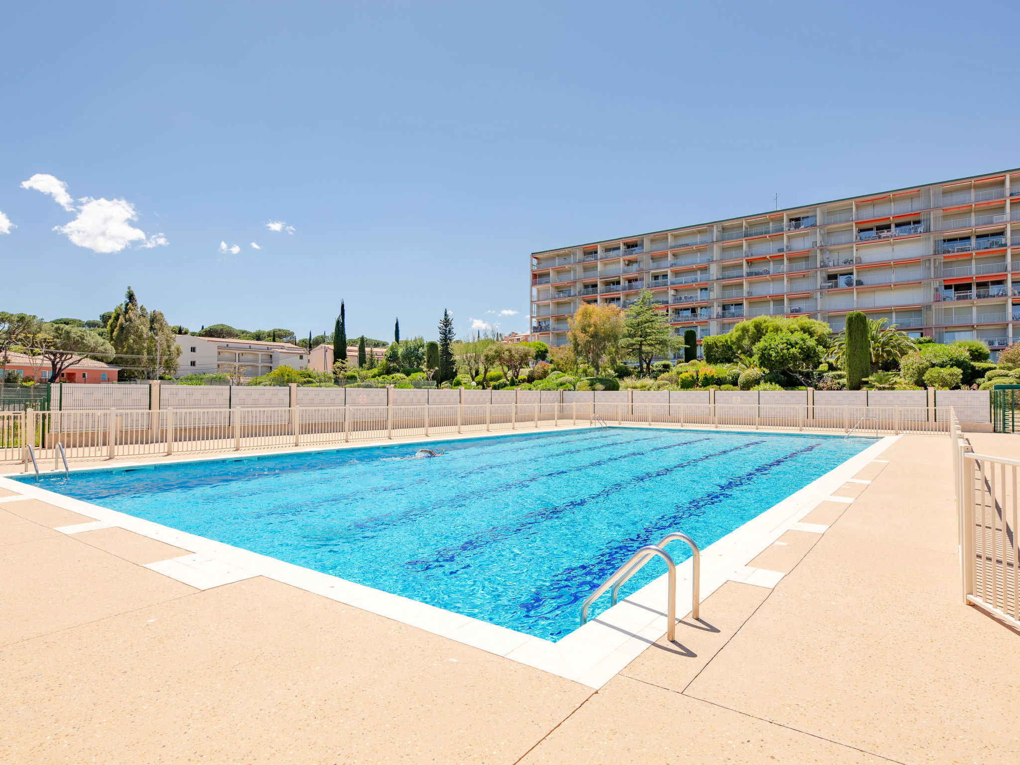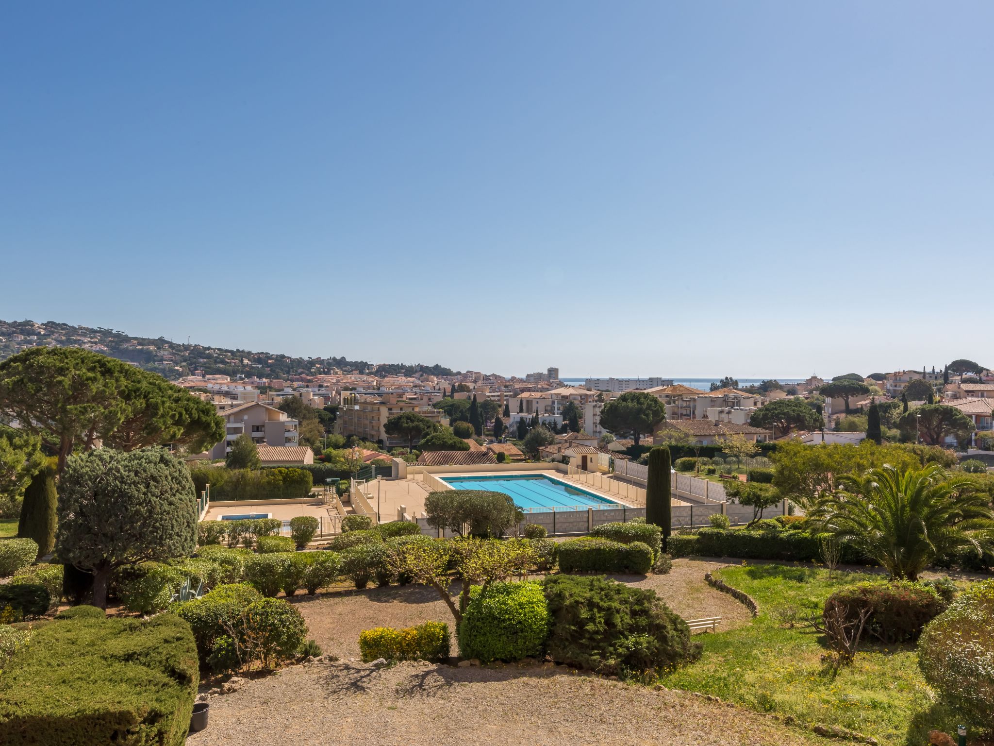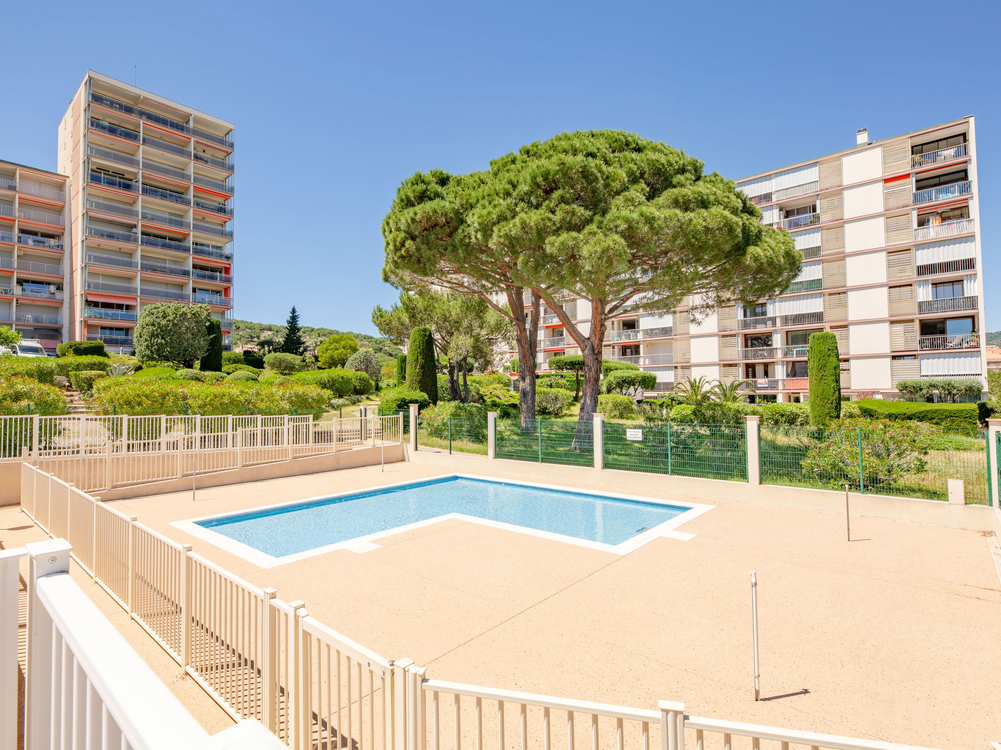 Animals are prohibited in the condominium, the garden and the swimming pool. Elevators stop at 1/2 floors. Residence "Les Côteaux du Préconil". In the resort 800 m from the centre of Sainte Maxime, in a sunny position, 800 m from the sea, 800 m from the beach. For shared use: large, well-kept garden, swimming pool angular (25 x 10 m, depth 200 - 120 cm, seasonal availability: 15.Jun. - 30.Sep.). Children's pool, outdoor shower, tennis, boccia. In the complex: lift, storage room for bicycles. Parking (limited number of spaces). E-charging station. Shop 500 m, grocery 450 m, supermarket 1.2 km, bus stop 1 km, railway station "TGV Saint-Raphaël" 20 km, sandy beach "Centre ville" 800 m, thermal baths "Thalassothérapie Les Issambres" 7 km. Sports harbour 1.2 km, golf course (18 hole) 5 km, sailing school 1 km, tennis 50 m. Nearby attractions: Aqualand waterpark 2.5 km, St Tropez,Ramatuelle 15 km, Port Grimaud 8 km, Gorges du Verdon 75 km, Navette / shuttle boat St-Tropez 15min 1.2 km. Hiking paths: Massif des Maures 5 km, Massif de l'Estérel 20 km. Please note: residence with electric gates. Airfield 60 km from the property.