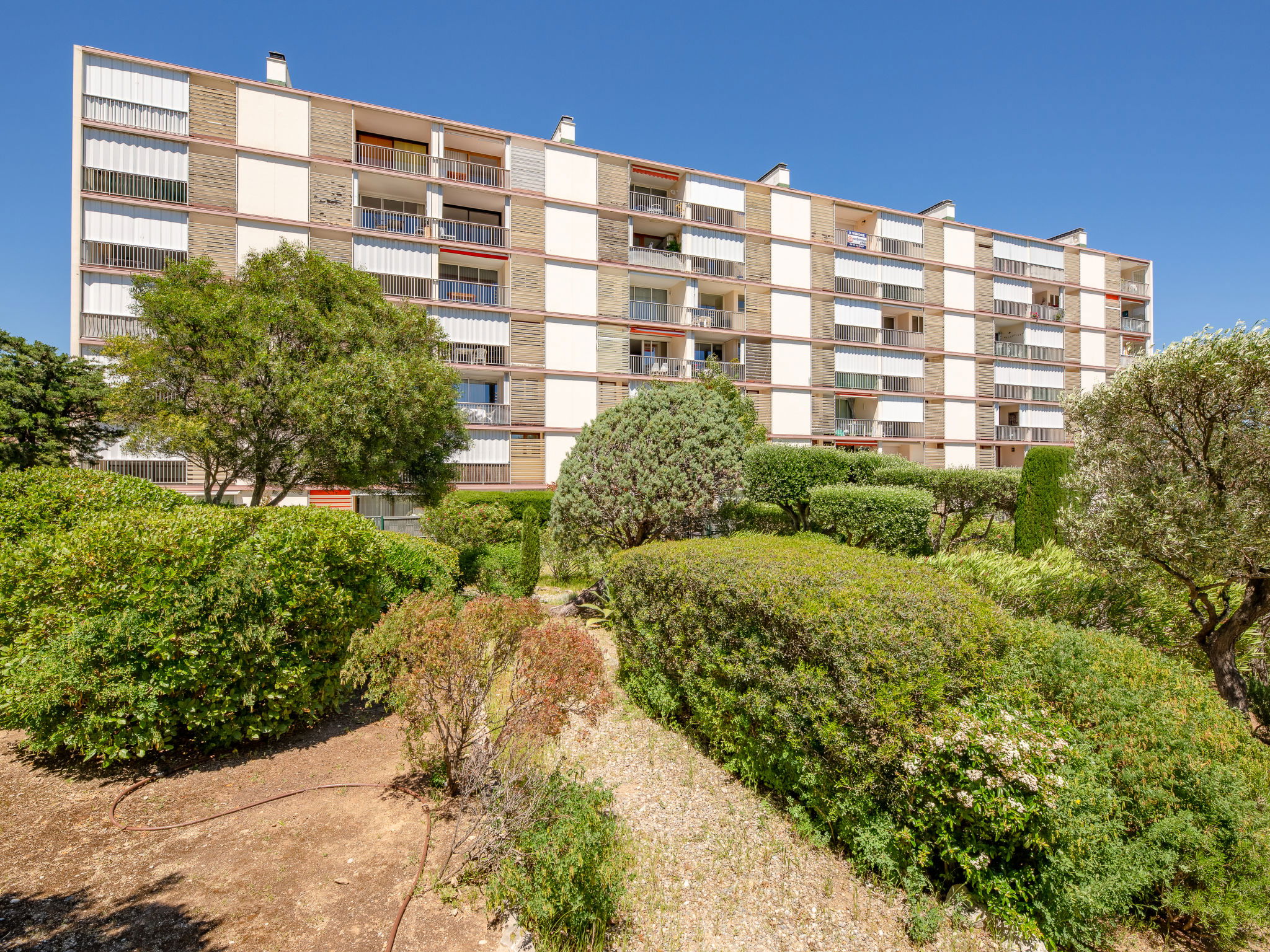2-room apartment 46 m2 on 1st floor, south-east facing position. Bright, renovated, comfortable and beautiful furnishings: entrance hall. Living/dining room with 1 double sofabed (1 x 140 cm, length 190 cm), TV (flat screen), air conditioning. Exit to the terrace. 1 room, west facing position with 1 french bed (1 x 140 cm, length 190 cm), fan. Kitchen (oven, dishwasher, 3 induction hot plates, toaster, kettle, microwave, freezer, electric coffee machine). Shower, sep. WC. Electric heating. Terrace 10 m2. Terrace furniture. View of the sea, the swimming pool and the garden. Facilities: washing machine, iron. Internet (WiFi, extra). Parking space n 702. Please note: non-smokers only. Maximum 1 small pet/ dog allowed. Smoke alarm. 83115003459NH
