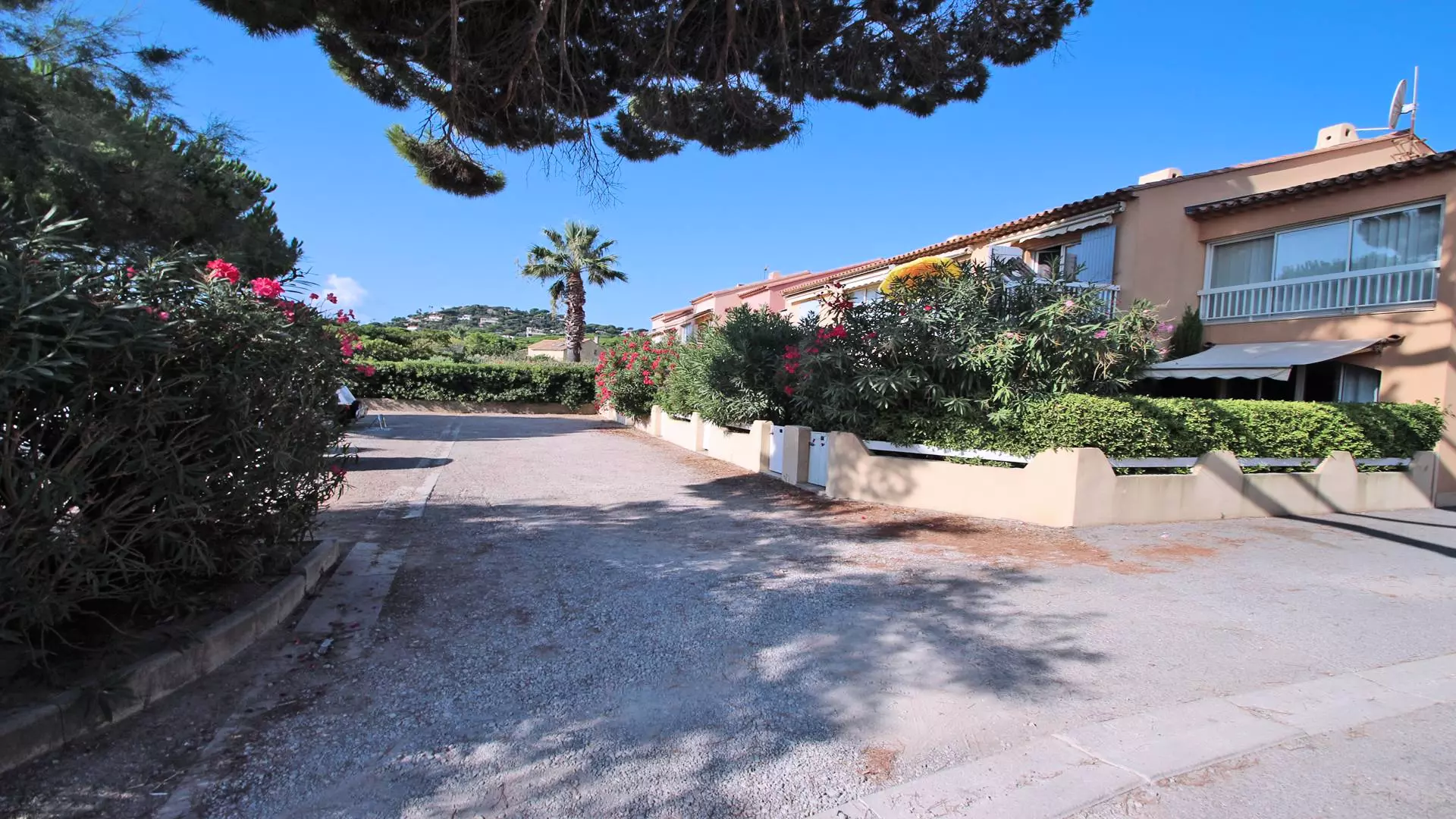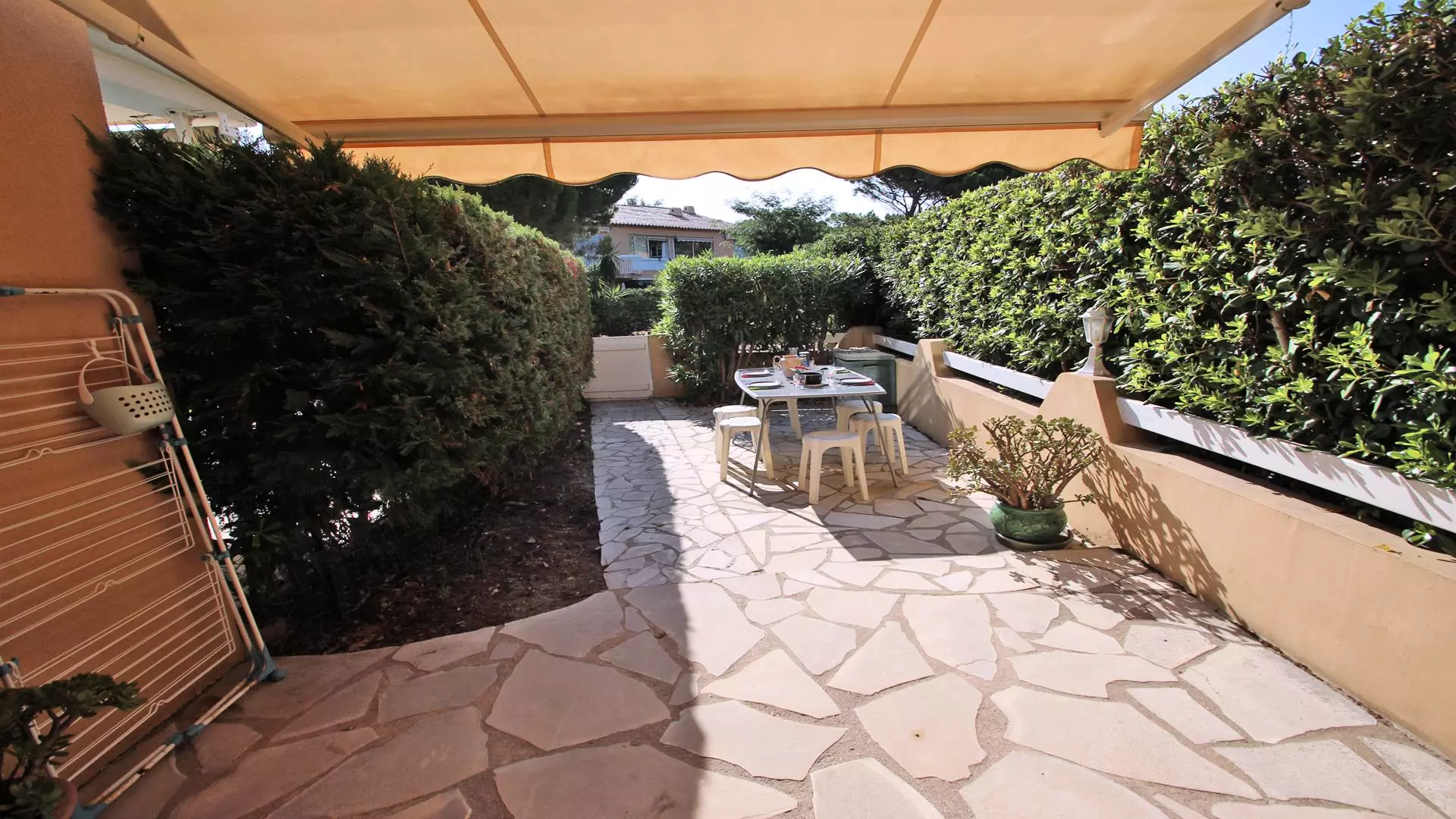 - 20m² terrace with dining furniture, manual awning, clothes horse, gate