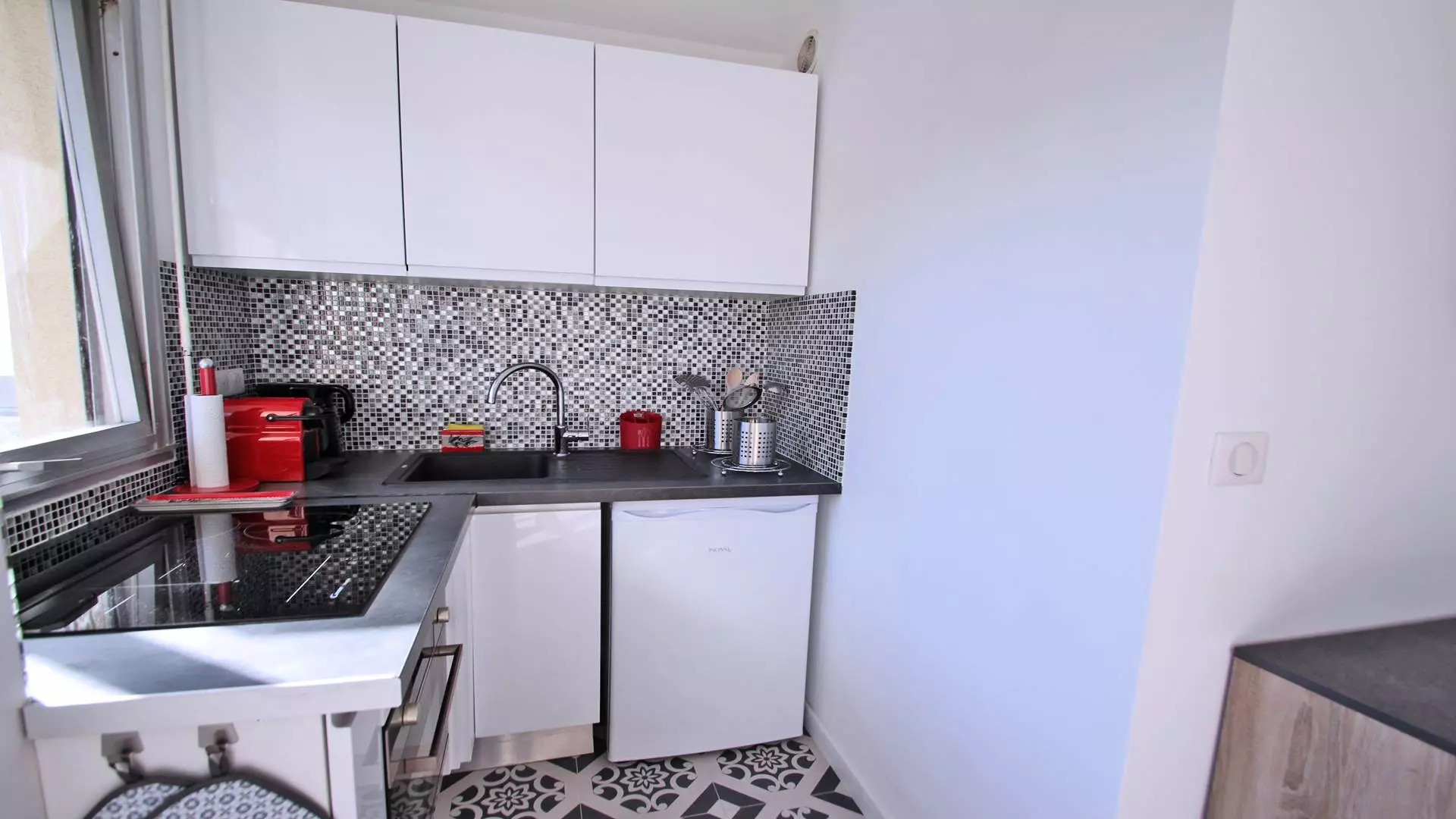 - Open kitchenette with oven, top refrigerator, Nespresso coffee machine, kettle, toaster, 4-burner induction hob, various dishes