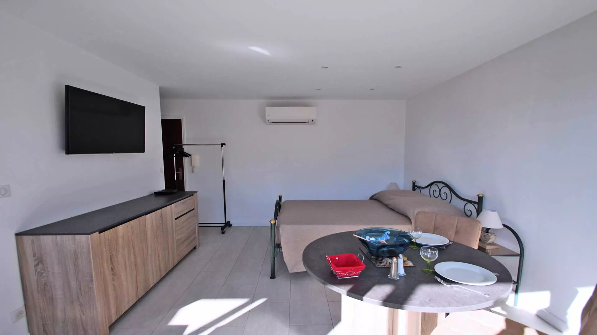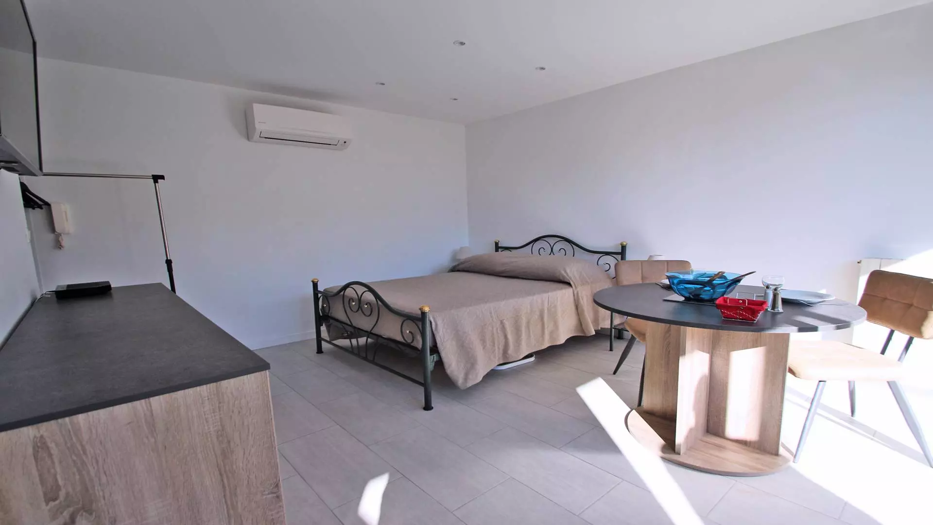 - Air-conditioned living room with 140cm double bed, dining table and chairs, flat screen television, terrace access