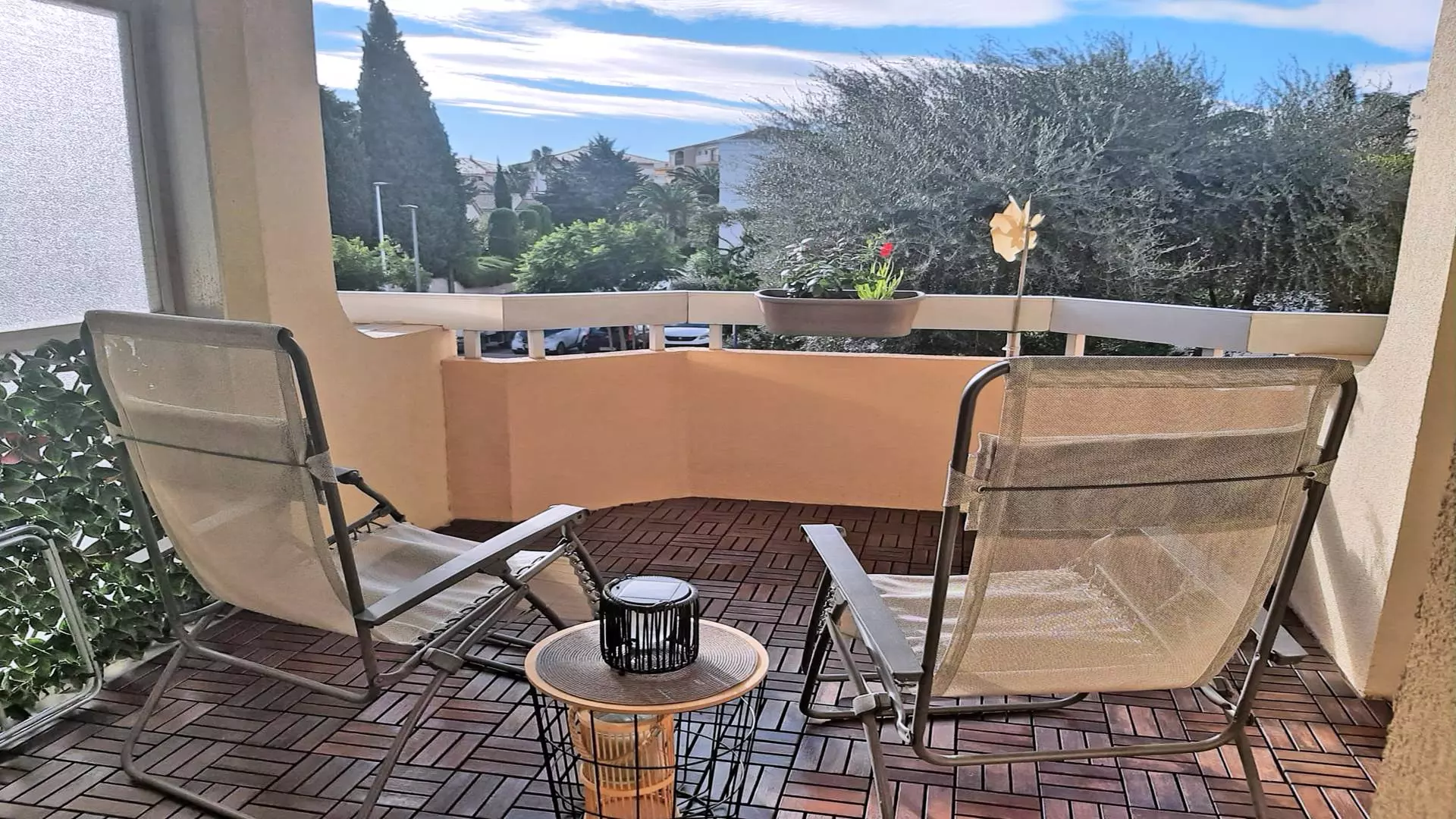 - Beautiful air-conditioned living room with lounge area including a 140cm convertible sofa bed, a flat screen television and a dining area for 4 people giving access to the large equipped terrace of 28m²