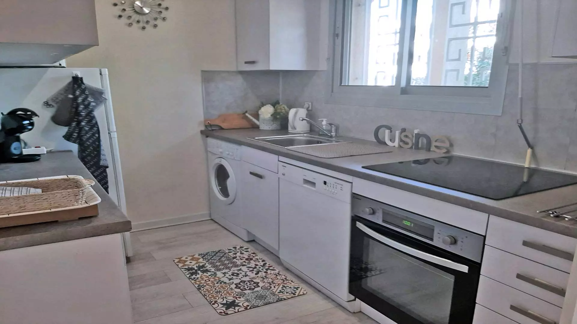 - Separate kitchen, equipped with fridge-freezer, washing machine, dishwasher, oven, microwave, kettle, toaster, Dolce Gusto coffee machine, 4-burner hob