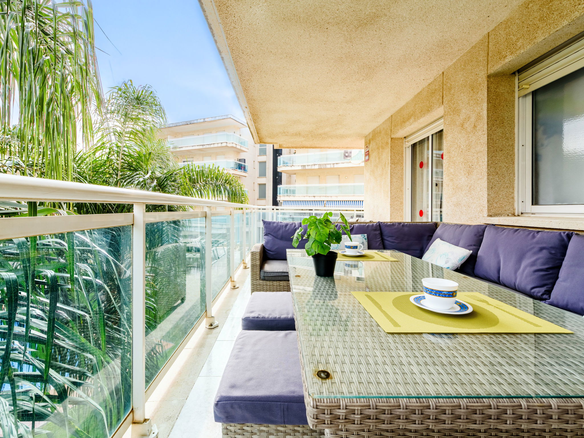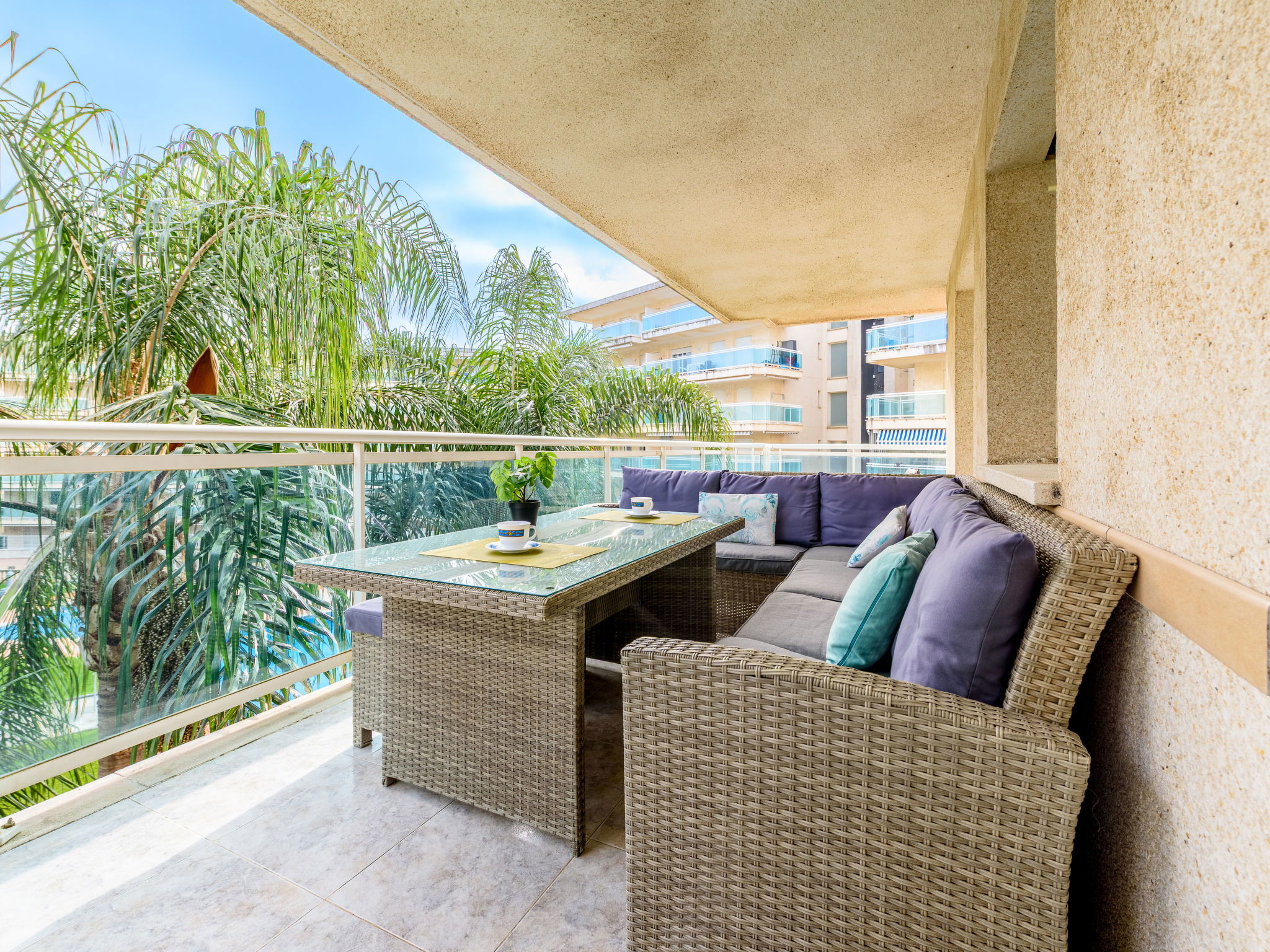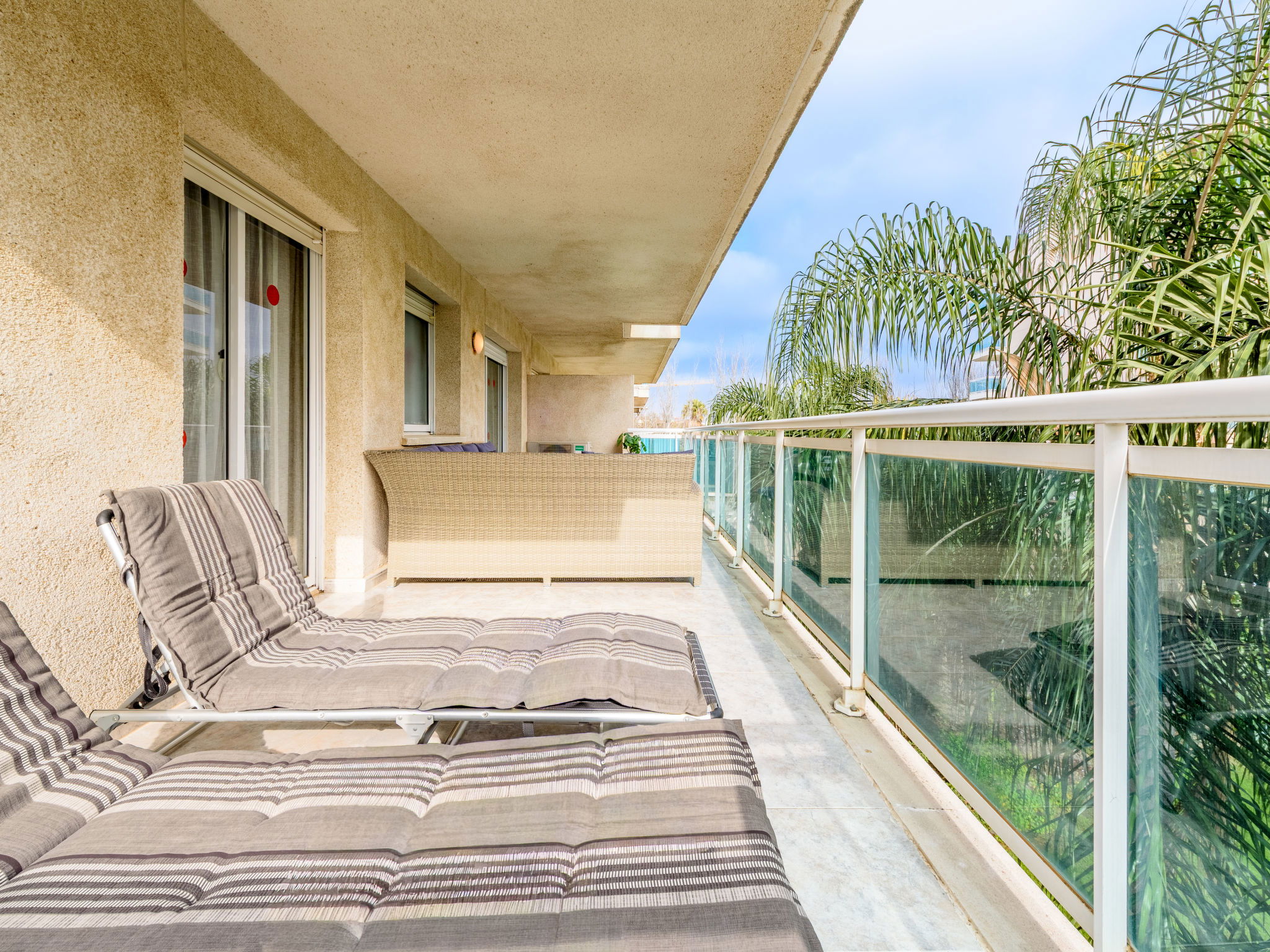 "Villa Park", 3-room apartment 60 m2 on 3rd floor. Practical and cosy furnishings: living/dining room with TV and digital TV (flat screen). Exit to the terrace. 1 room with 1 french bed (150 cm, length 190 cm). Exit to the terrace. 1 room with 2 beds (90 cm, length 190 cm). Kitchen (oven, dishwasher, 4 ceramic glass hob hotplates, microwave, electric coffee machine, Capsules for coffee machine (Dolce Gusto) extra) with boiler (50 litres). Bath/WC, shower/WC. Air-conditioning, forced-air heating. Large terrace 24 m2. Balcony furniture, deck chairs (2). View of the swimming pool. Facilities: washing machine, iron, hair dryer. Internet (WiFi, free). Please note: non-smokers only. Maximum 1 small pet/ dog allowed. HUTT-049909 // Reg. Nr.: ESFCTU00004302400064847000000000000000HUTT-049909-721
