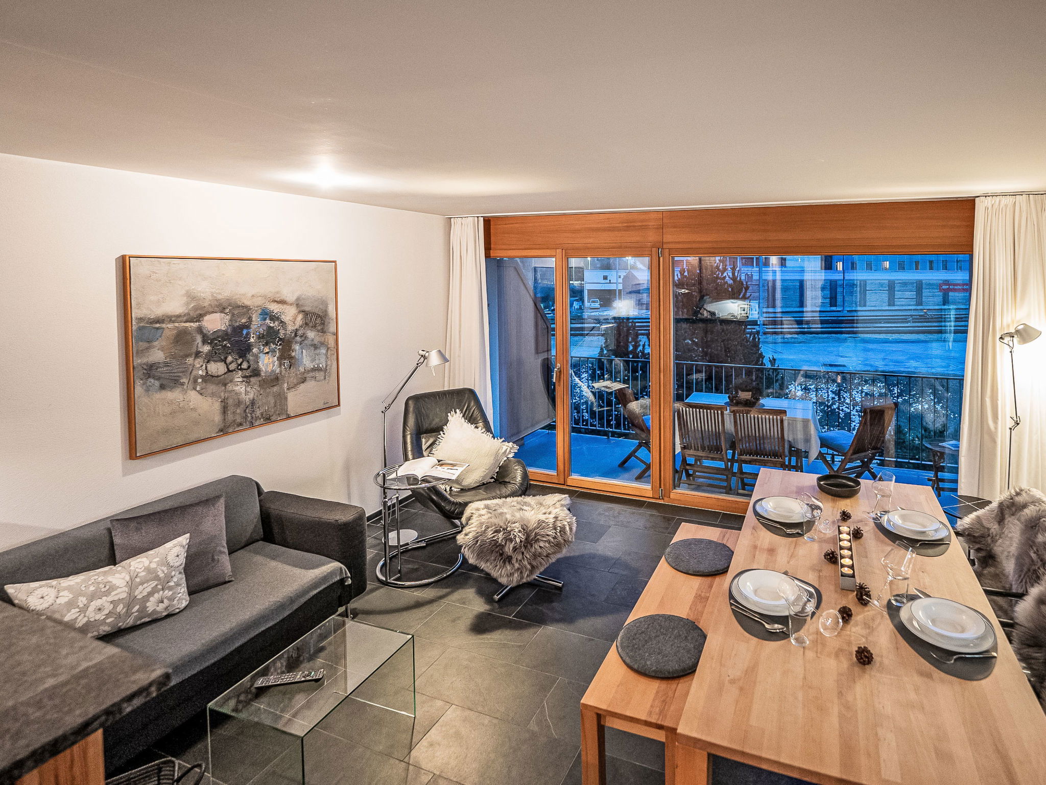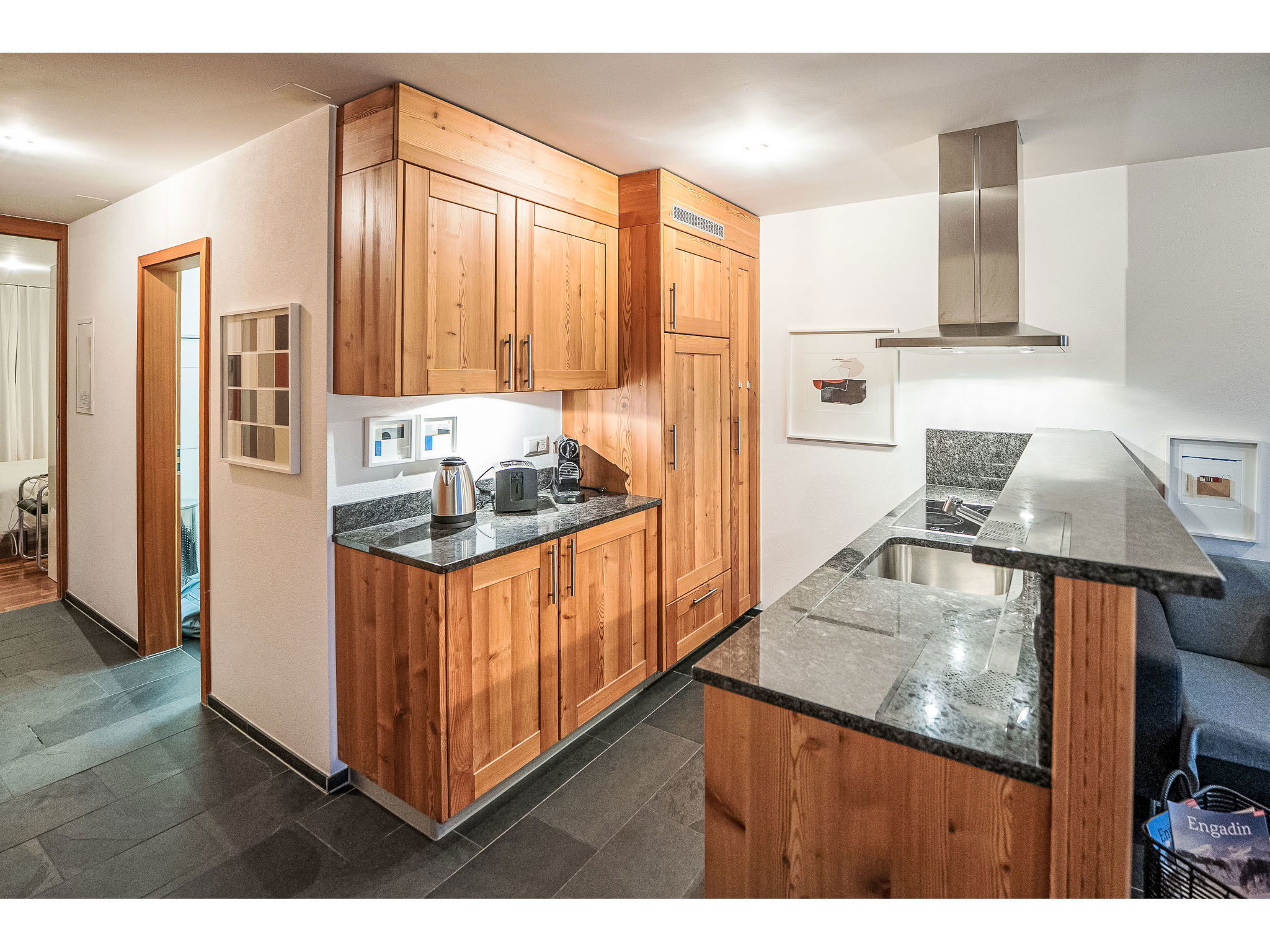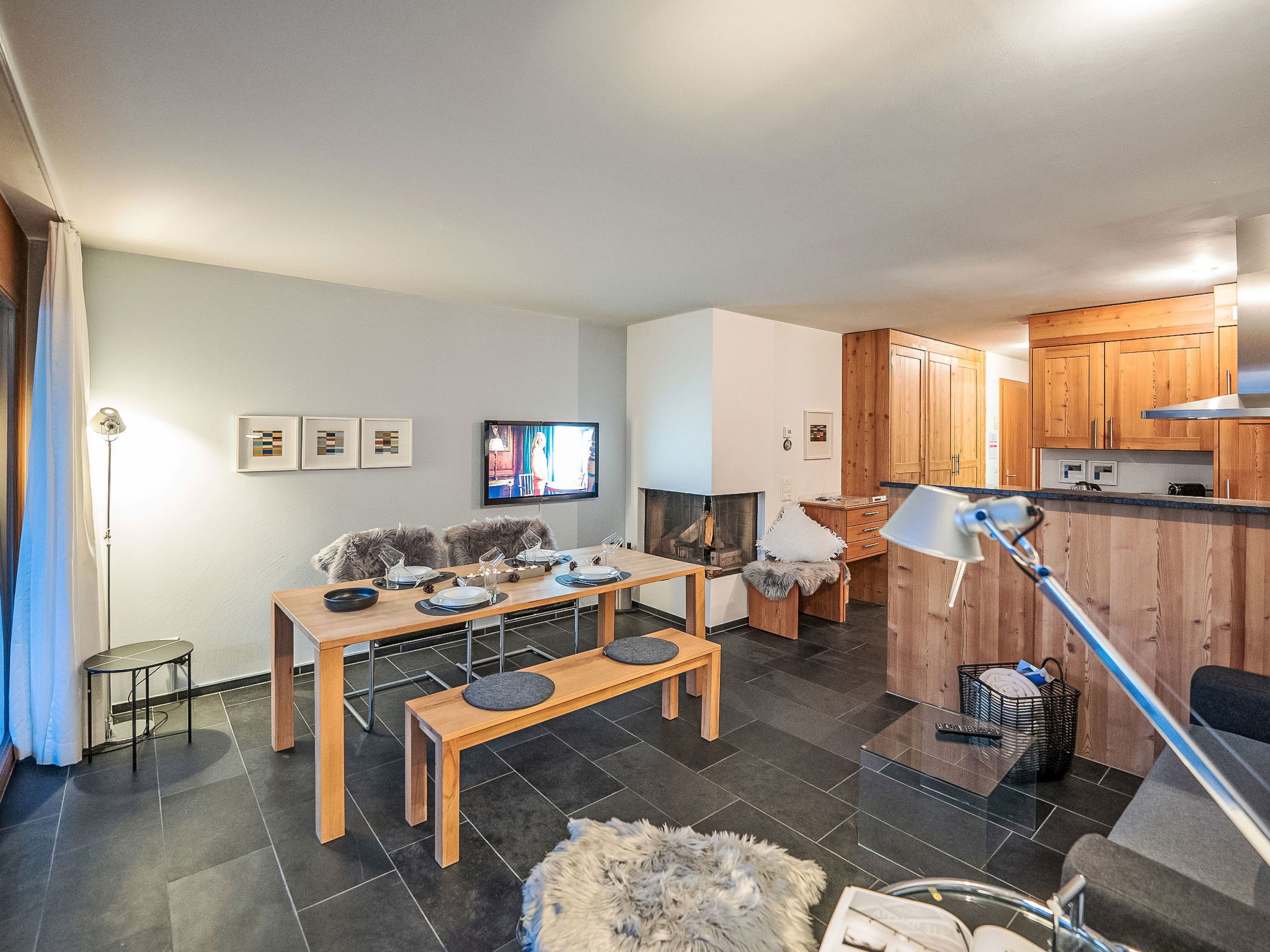 "Chesa Promulins", 2-room apartment 50 m2 on 2nd floor. Bright, comfortable and beautiful furnishings: living/dining room with panoramic window with open-hearth fireplace and TV (flat screen). Exit to the balcony. 1 double bedroom with 1 double bed (2 x 90 cm, length 200 cm), TV (flat screen). Open kitchen (oven, dishwasher, 4 ceramic glass hob hotplates, toaster, kettle, electric coffee machine, Capsules for coffee machine (Nespresso) extra). Bath/WC. Heating. Balcony 6 m2. Balcony furniture. View of the mountains and the resort. Facilities: hair dryer. Internet (WiFi). Garage space n 28 (1 car), height 200 cm, width 230 cm. Please note: non-smokers only, non-smoking house. Maximum 2 pets/ dogs allowed.