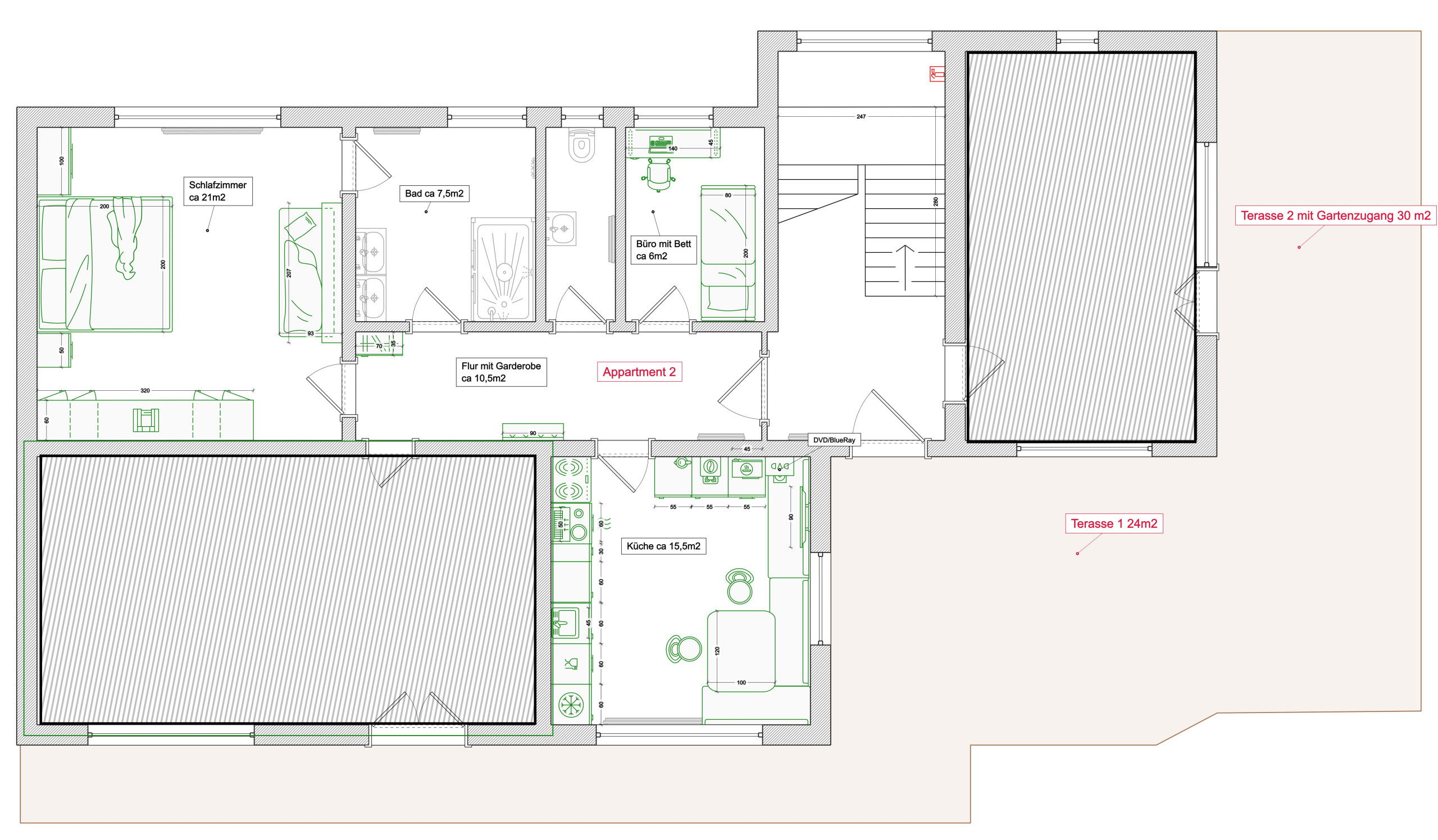 The kitchen is fully equipped, so that shared meals are easy to prepare even on holiday. A modern bathroom with rain shower and a separate toilet provide additional comfort.