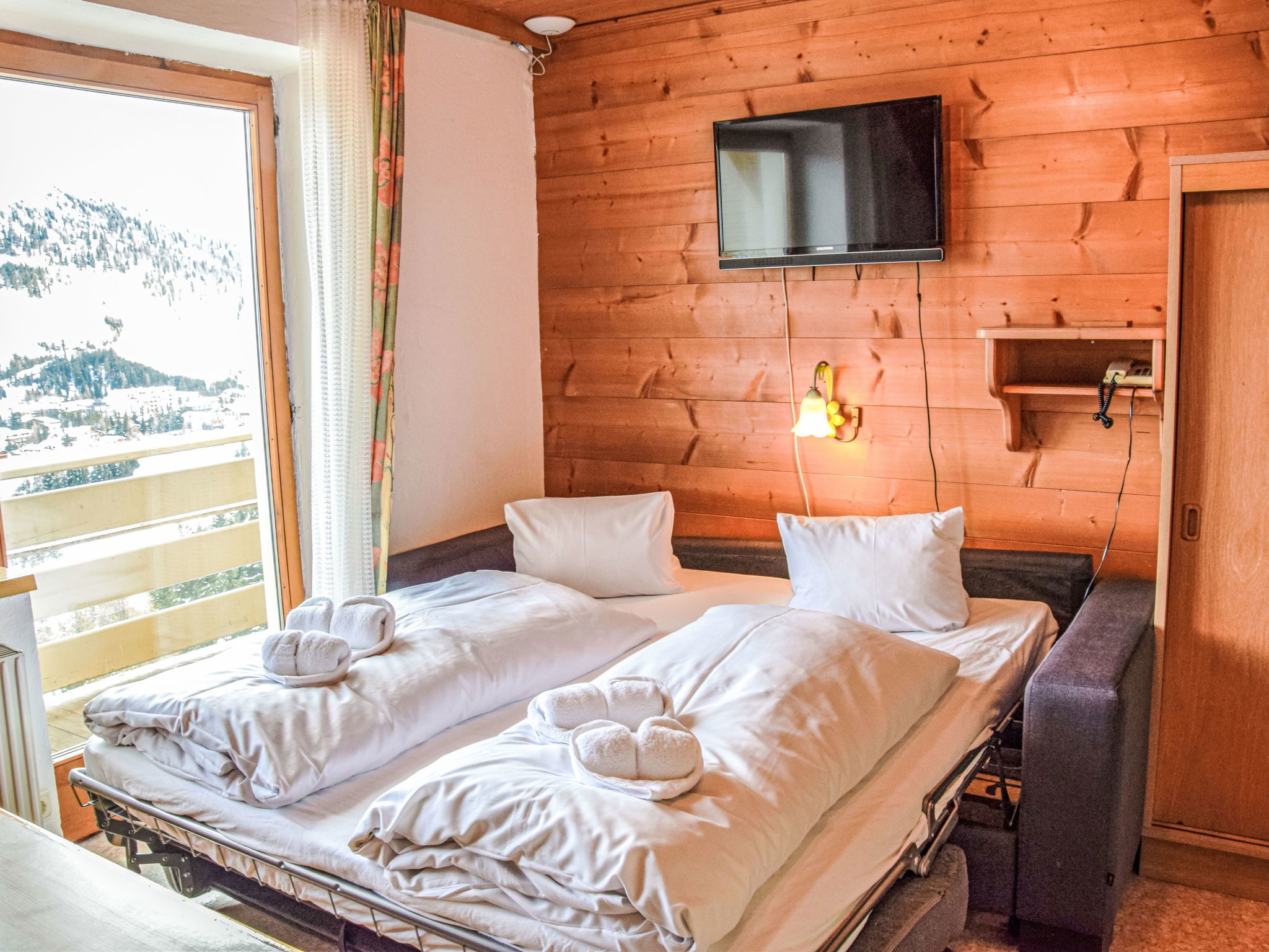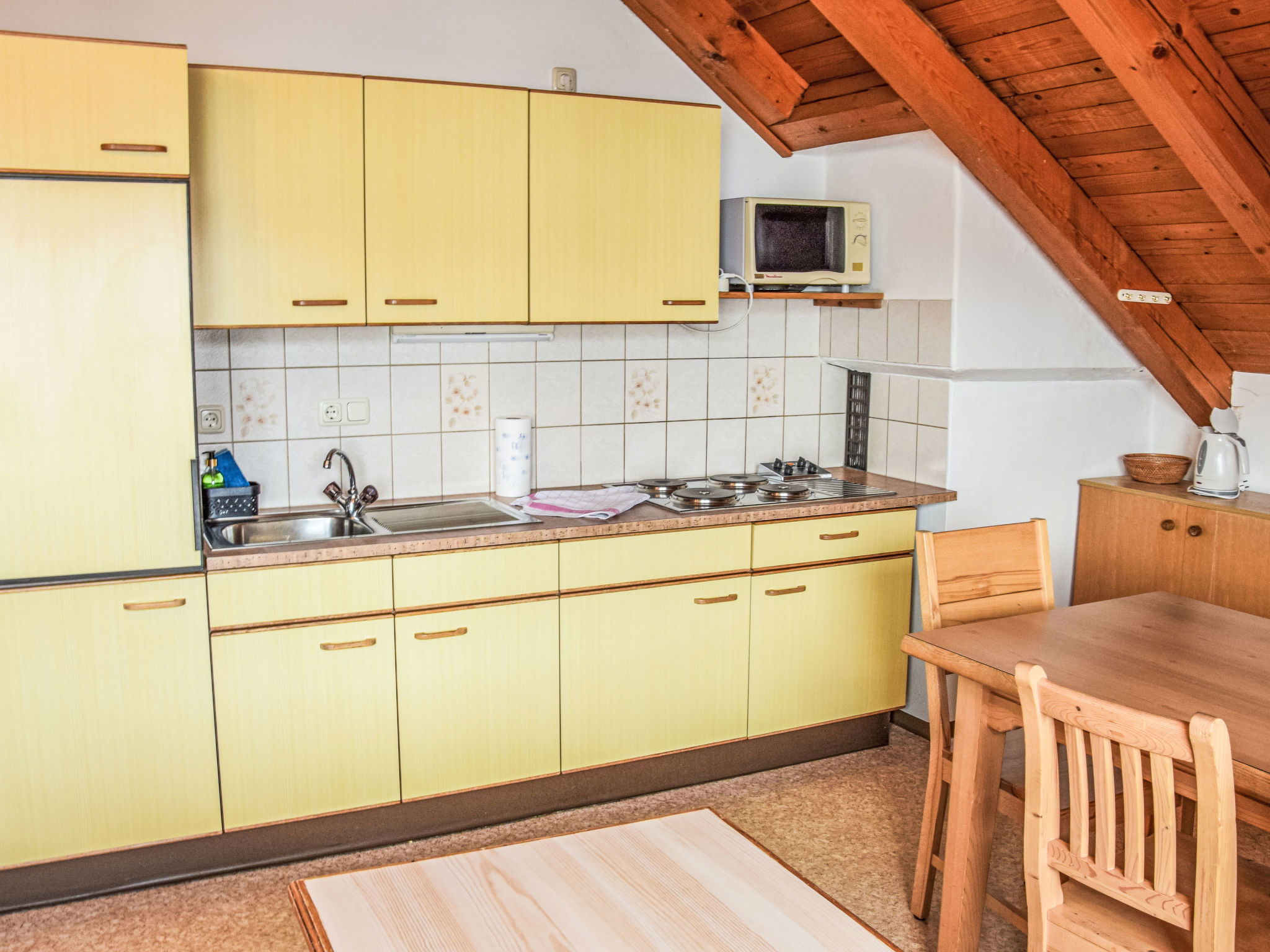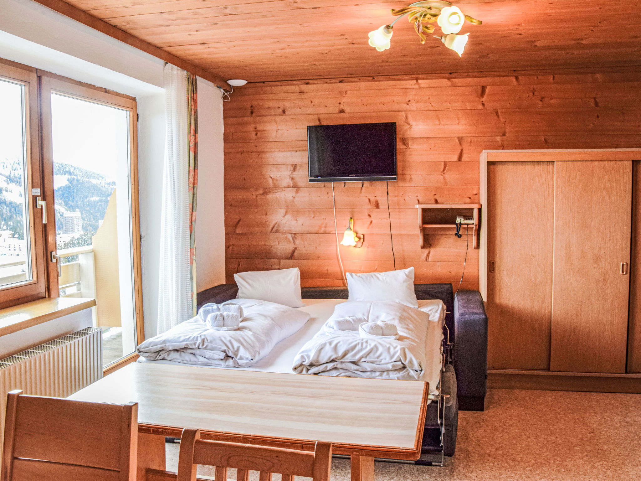 "Katschberg 25", 3-room apartment 55 m2 on 3rd floor. Comfortable and cosy furnishings: living/sleeping room with 1 sofabed, dining table and satellite TV (flat screen). 1 double bedroom. 1 room. Open kitchen (4 hot plates, kettle, microwave, electric coffee machine). Shower/WC. Solar power. Balcony. Balcony furniture. Facilities: Internet (WiFi, free). Please note: non-smokers only. Maximum 1 pet/ dog allowed. 50509-000437-2025