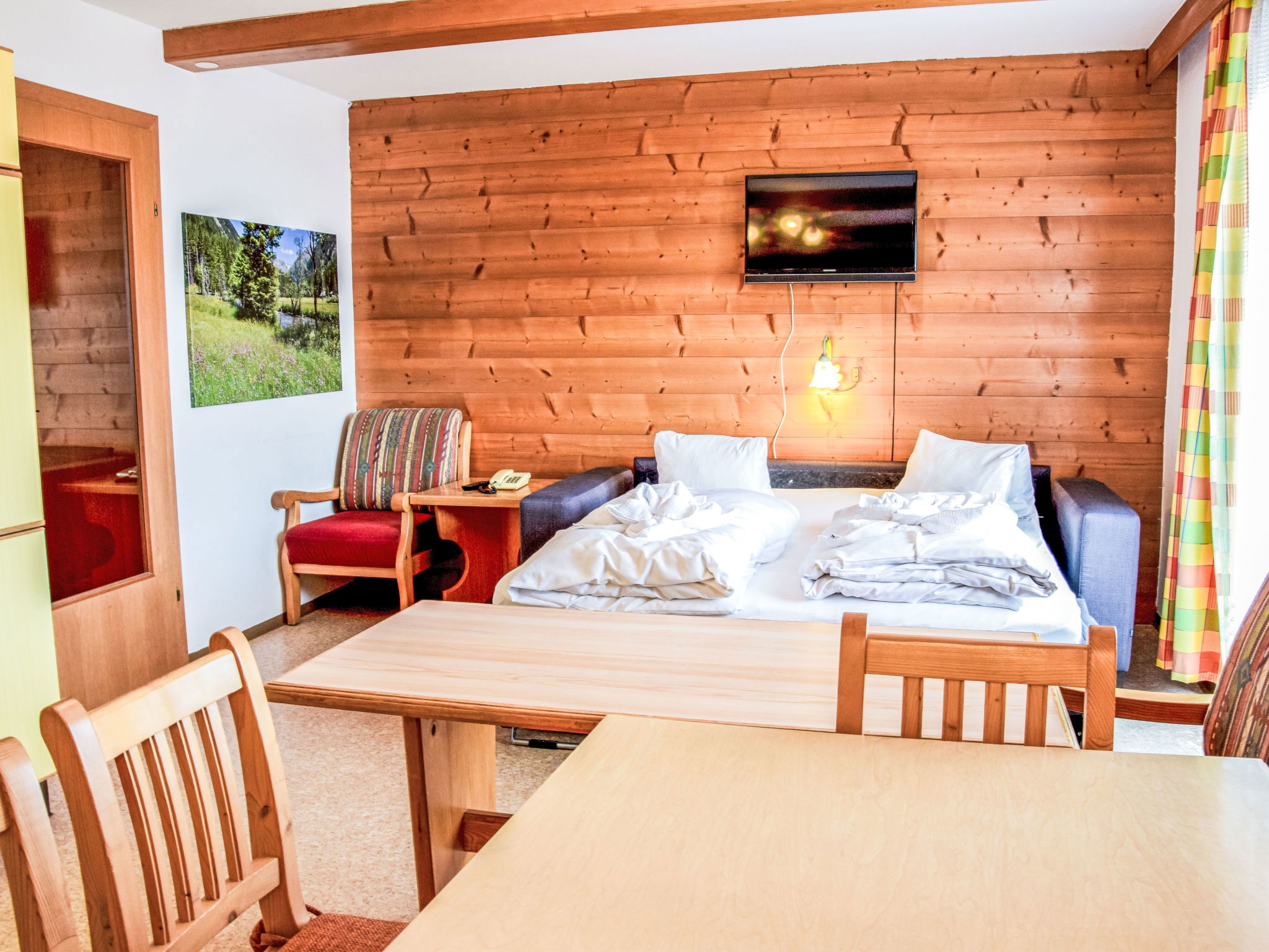 "TOP 24", 3-room apartment 55 m2 on 2nd floor. Comfortable and cosy furnishings: living/sleeping room with 1 double sofabed, dining table and satellite TV (flat screen). 2 double bedrooms. Open kitchen (4 hot plates, dishwasher, kettle, electric coffee machine). Shower/WC. Solar power. Balcony. Balcony furniture. Facilities: Internet (WiFi, free). Please note: non-smokers only. Maximum 1 pet/ dog allowed. 50509-000437-2025