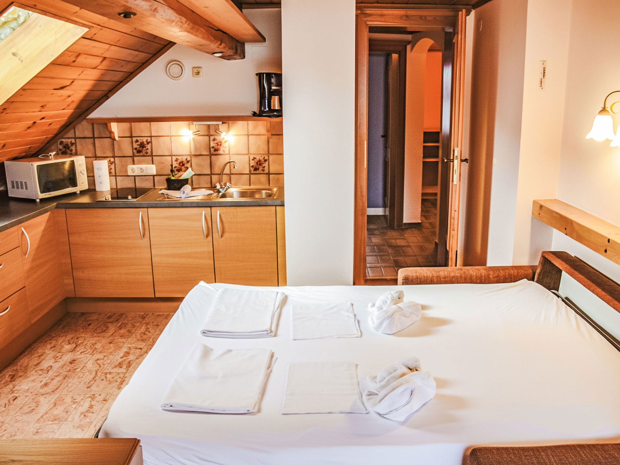 "Katschberg 21", 2-room apartment 35 m2 on 3rd floor. Comfortable and cosy furnishings: living/sleeping room with sloping ceilings with 1 double sofabed, dining table and satellite TV (flat screen). With sloping ceilings, 1 room with 2 beds. Open kitchen (2 ceramic glass hob hotplates, kettle, electric coffee machine). Shower/WC. Solar power. Balcony. Balcony furniture. Facilities: Internet (WiFi, free). Please note: non-smokers only. Maximum 1 pet/ dog allowed. 50509-000437-2025