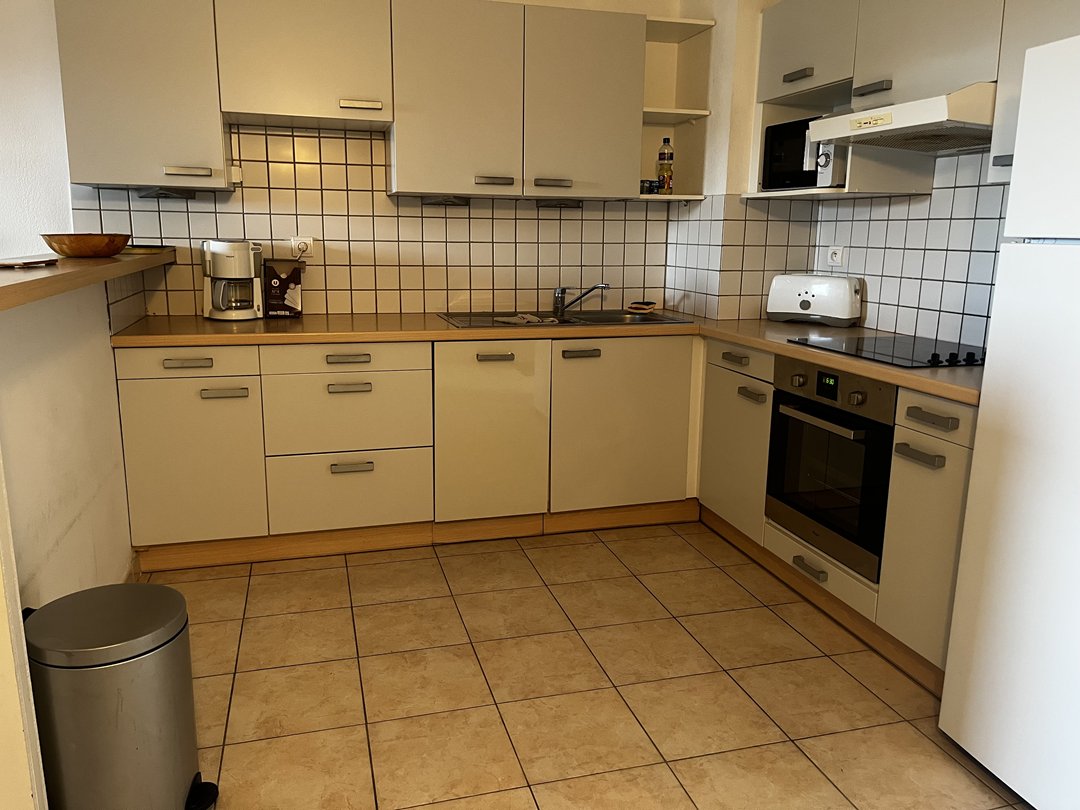 kitchen with oven, hob, fridge with freeze compartment, dishwasher, washing machine, storage space, microwave, coffee maker, bar overlooking stay.