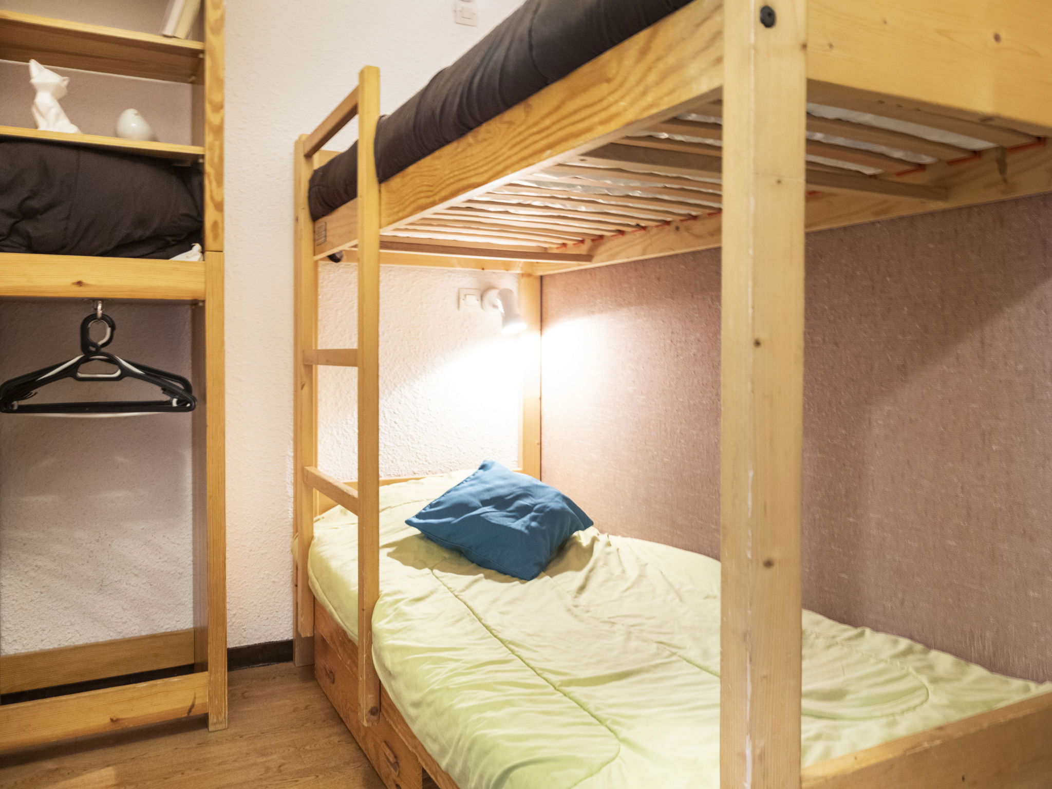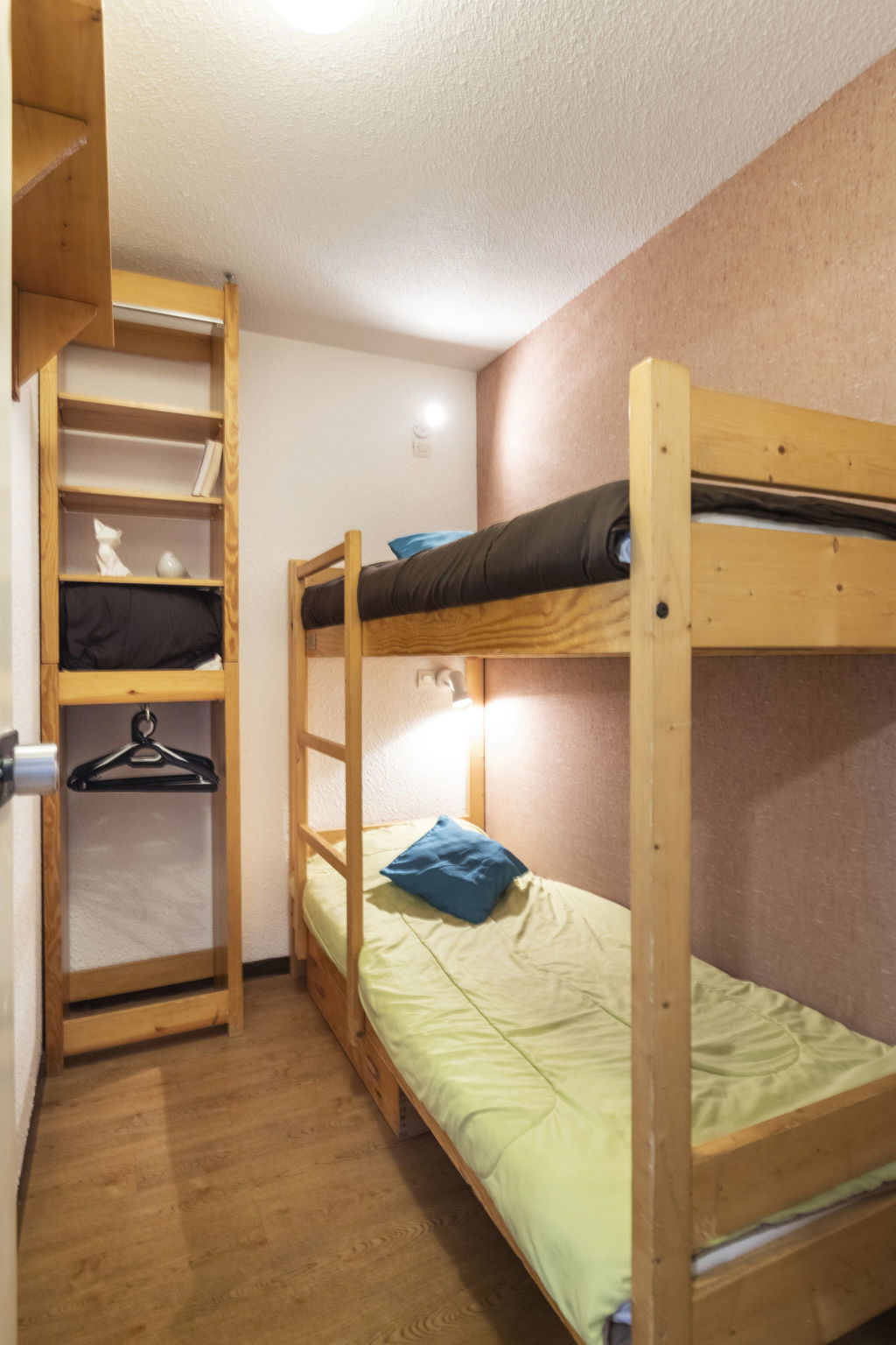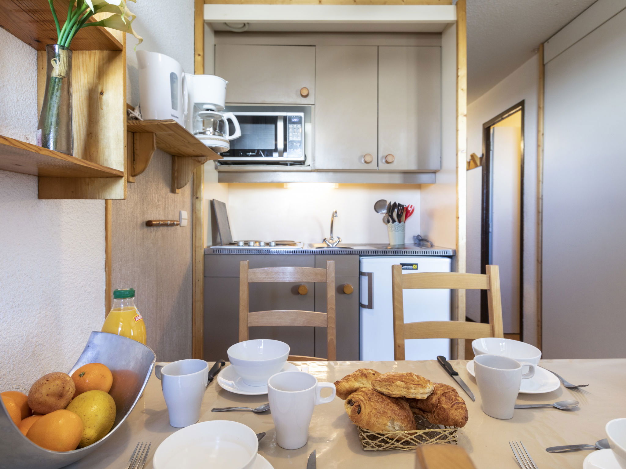 "Arcelle 308", 2-room apartment 22 m2 on 3rd floor, south-west facing position. Bright, partly renovated in 2024: living/dining room with electric heater. 1 small room 6 m2 with sliding door with 1 pull-out bed (2 pers. 2 x 80 cm, length 190 cm), TV (flat screen). Exit to the veranda, south-west facing position. Sleeping alcove with 1 x 2 bunk beds (80 cm, length 190 cm). Kitchenette (4 hot plates, kettle, electric coffee machine, combination microwave) with dining table, electric heater. Shower, sep. WC. Beautiful view. Facilities: Internet (WiFi, extra). Please note: non-smokers only. Maximum 1 pet/ dog allowed. Smoke alarm. Instead of an enclosed bedroom, some sleeping areas are located in an open-plan area (gallery, alcove, etc.). 73257008410SB