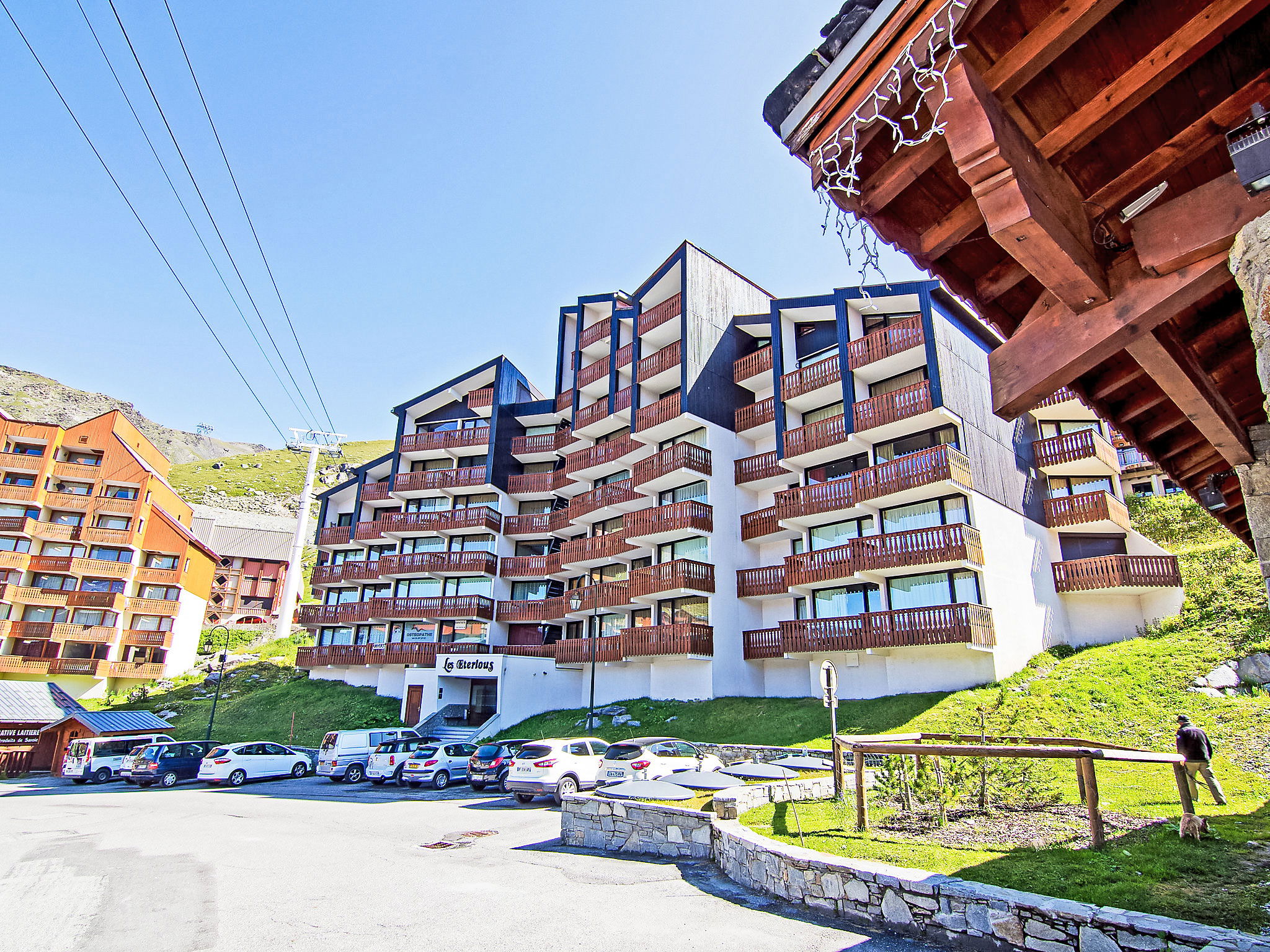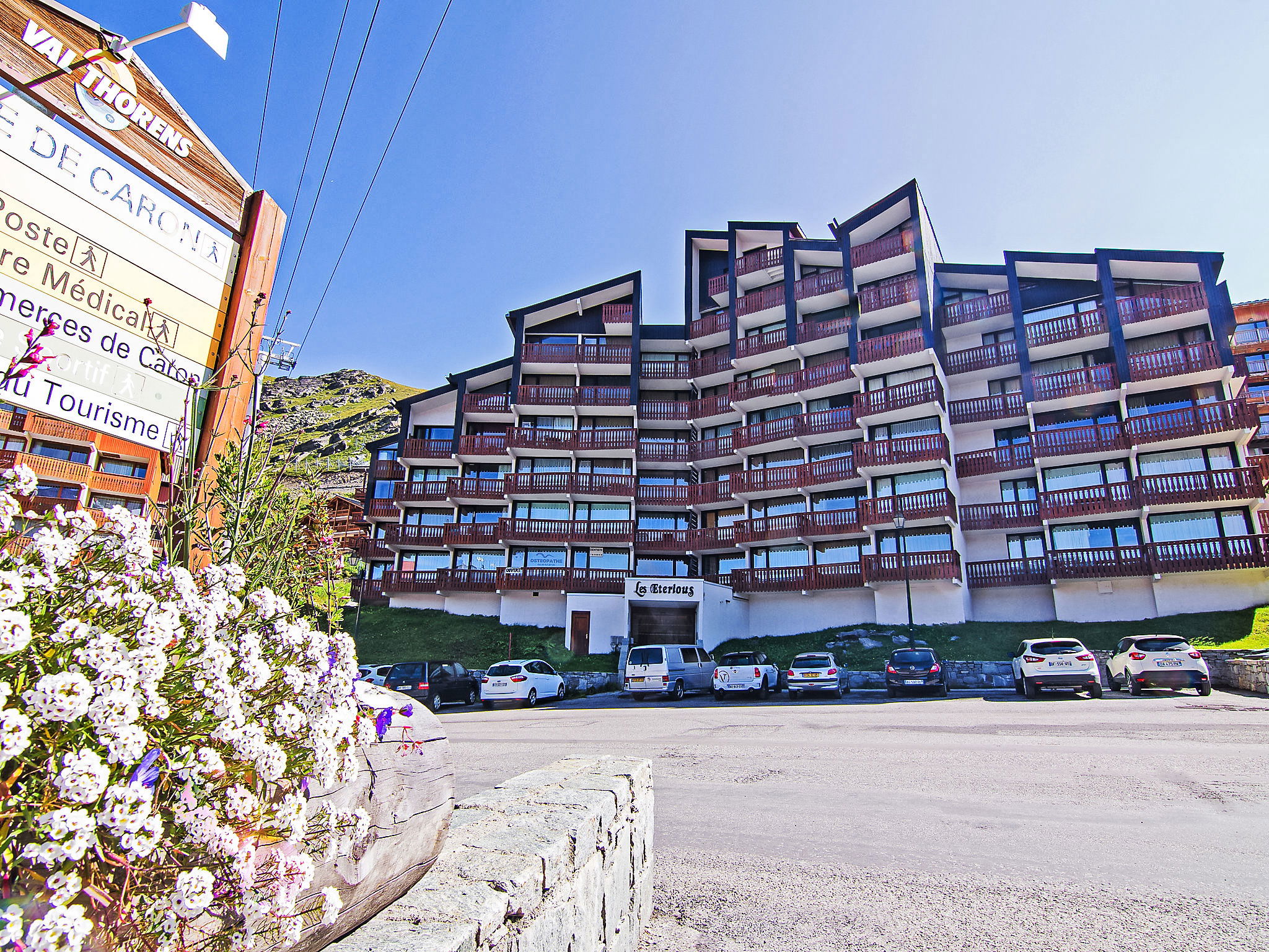 Residence "Les Eterlous". In the centre of la station, in a central, busy, sunny position, 50 m from the skiing area, south facing position. In the house: lift, storage room for skis. In Winter: please take snow chains. Public car park at 100 m. Shop 50 m, grocery 50 m, supermarket 100 m, shopping centre 100 m, restaurant 10 m, bakery, café, pedestrian zone 50 m, 2 minute walk to the centre, bus stop 5 m, outdoor swimming pool 100 m. Sports centre 100 m, chair lift 50 m, gondola lift 100 m, skisport facilities 150 m, slopes 50 m, ski school 10 m, ice rink 150 m. Please note: entertainment in the season. Groups of teenagers on request only. Nightclub/disco close by 150 m from the property.