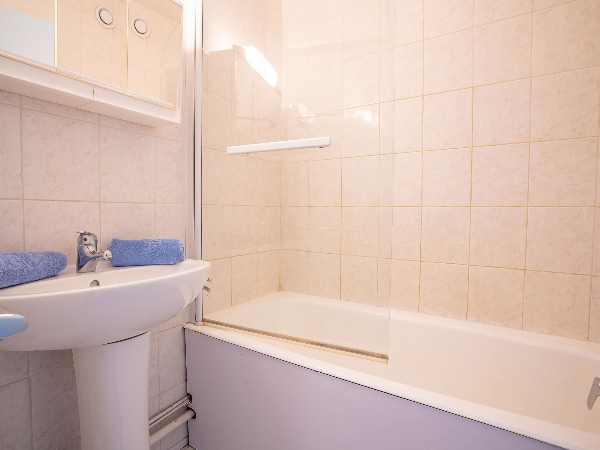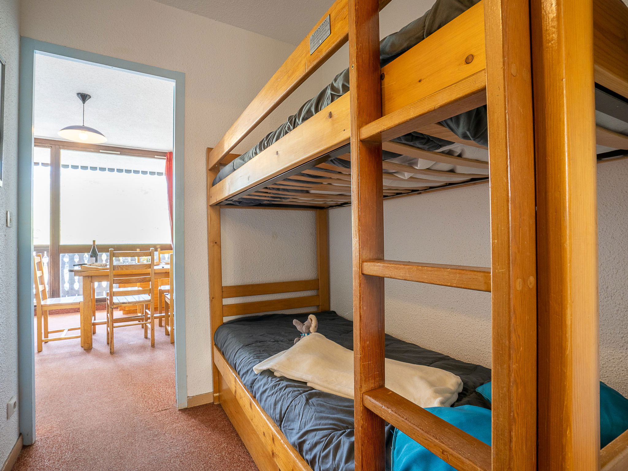 "Lac du Lou 506", 2-room apartment 35 m2 on 5th floor, south facing position. Bright, simple furnishings: living/dining room with 1 pull-out bed (2 pers. 2 x 90 cm, length 190 cm), TV (flat screen), electric heater. Exit to the balcony, south facing position. 1 room with 1 french bed (140 cm, length 190 cm), electric heater. Entrance hall with 1 x 2 bunk beds (80 cm, length 190 cm). Kitchenette (4 hot plates, oven, dishwasher, microwave, electric coffee machine). Bathroom, sep. WC. Small balcony 3 m2, south facing position. Beautiful view of the mountains. Facilities: Internet (WiFi, extra). Please note: maximum 1 pet/ dog allowed. Smoke alarm. 73257007801DP