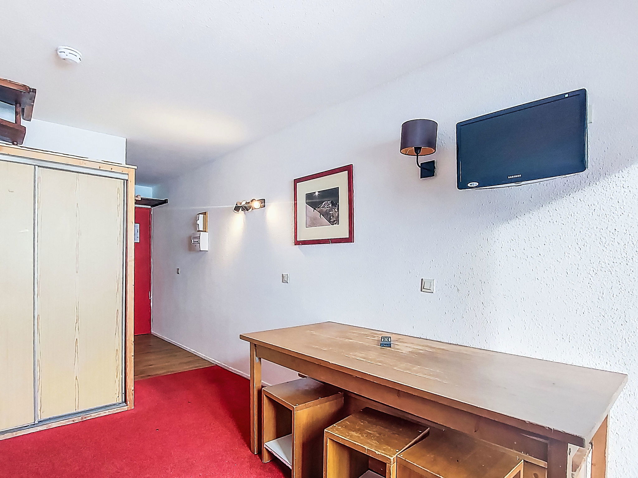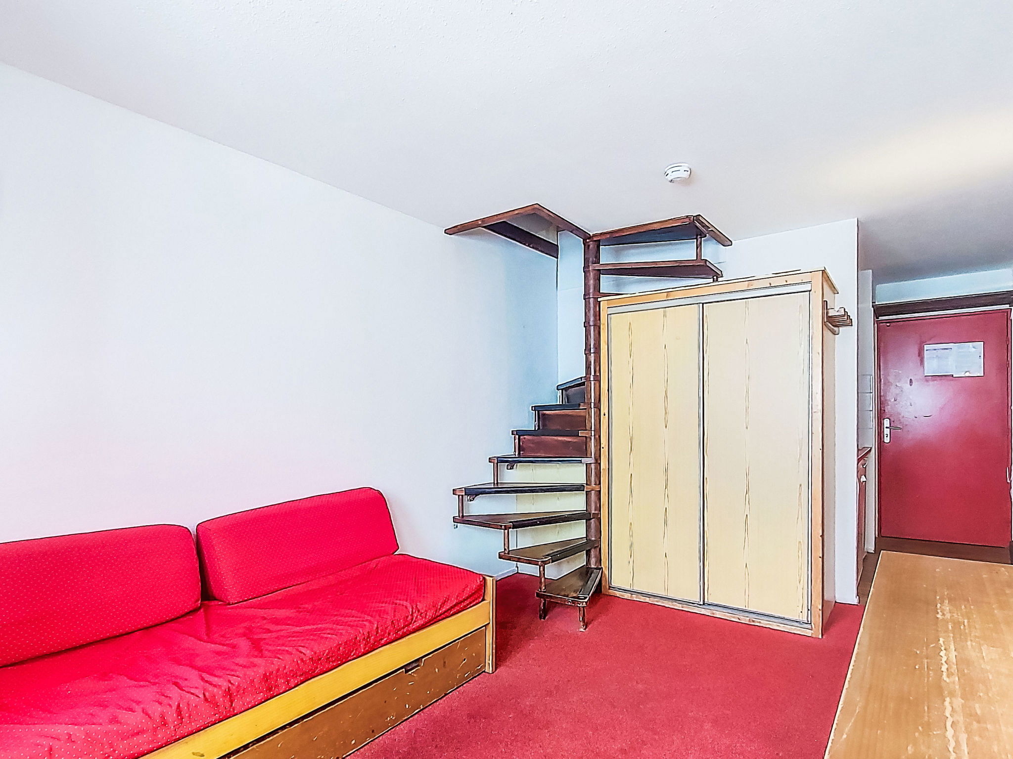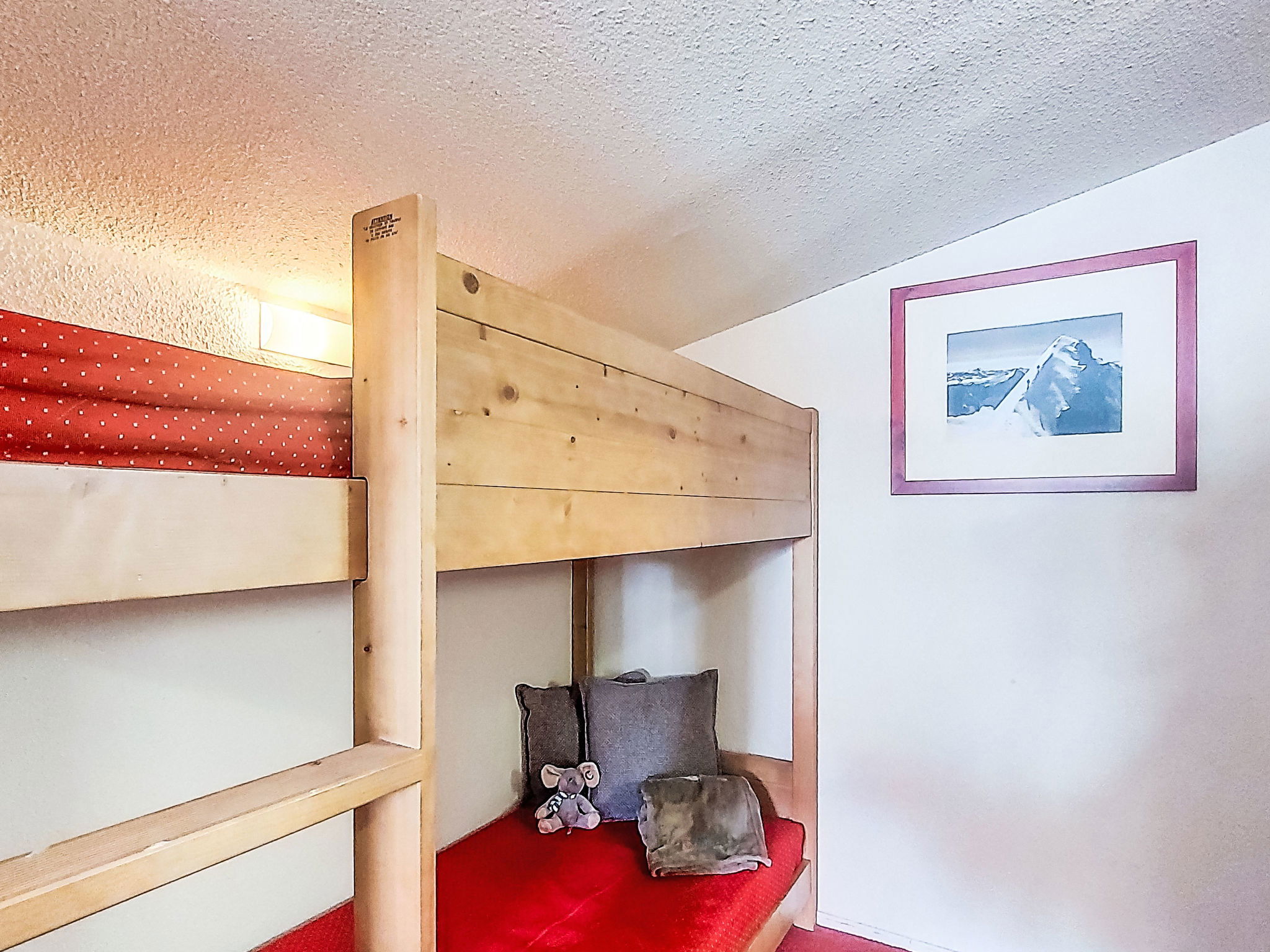 2-room apartment 44 m2 on 7th floor, south facing position. Simple and practical furnishings: living/dining room with 1 pull-out bed (1 pers. 2 x 80 cm, length 190 cm), dining table and electric heating. Exit to the balcony, south facing position. Entrance hall with kitchen corner. Kitchenette (2 induction hot plates, kettle, microwave, electric coffee machine). Bath/WC. Upper floor: (spiral staircase), 1 room with 2 x 2 bunk beds (80 cm, length 190 cm), electric heating. Alcove with 1 x 2 bunk beds (80 cm, length 190 cm). Shower/WC. Carpet. Small balcony 3 m2. Very beautiful panoramic view of the mountains, the valley, the ski run and the resort. Facilities: Internet (WiFi, extra). Please note: fridge without freezer, non-smokers only. Maximum 1 pet/ dog allowed. Smoke alarm. Offer by a private individual according to Art. 155, IV of CGI.
