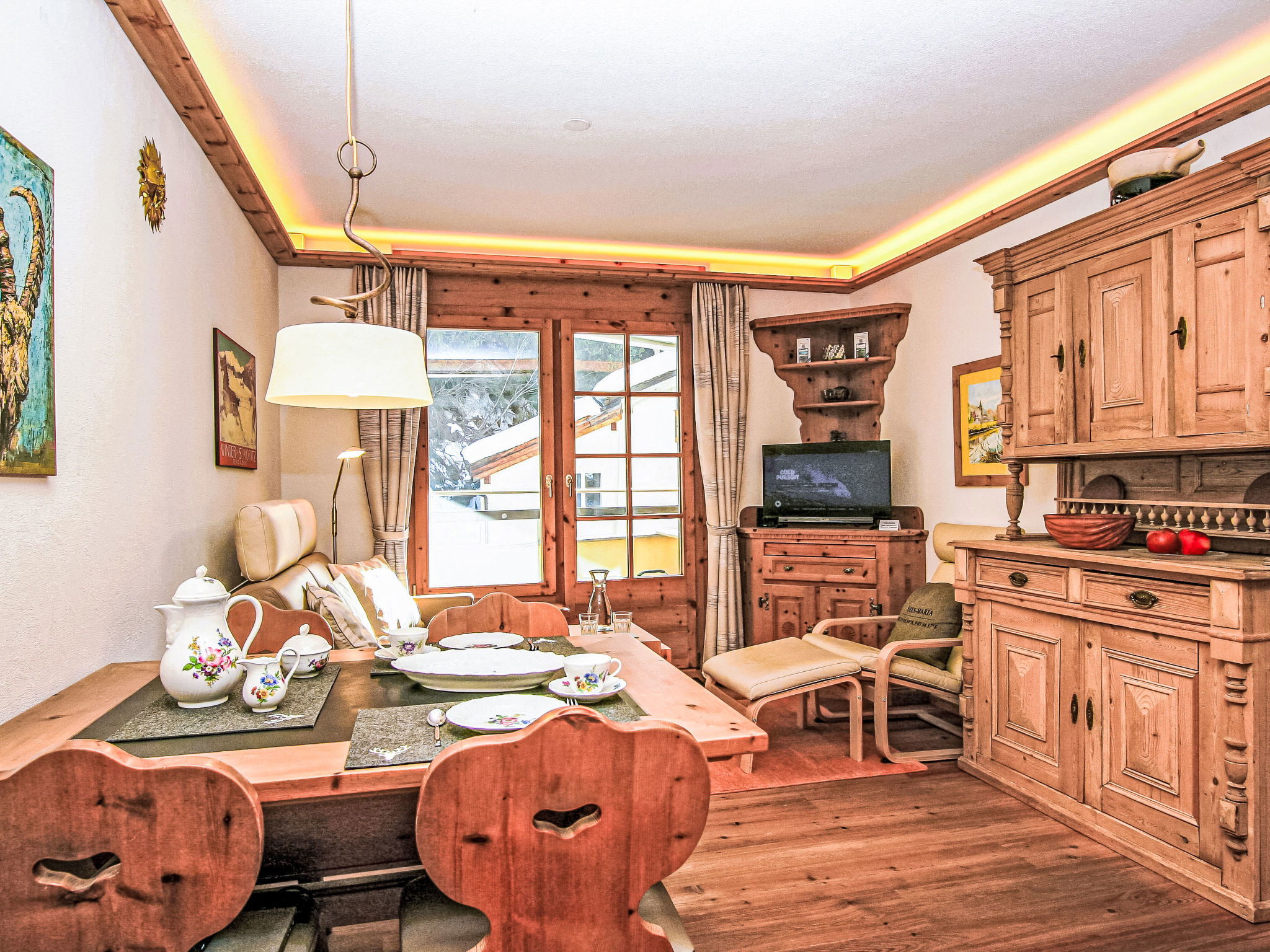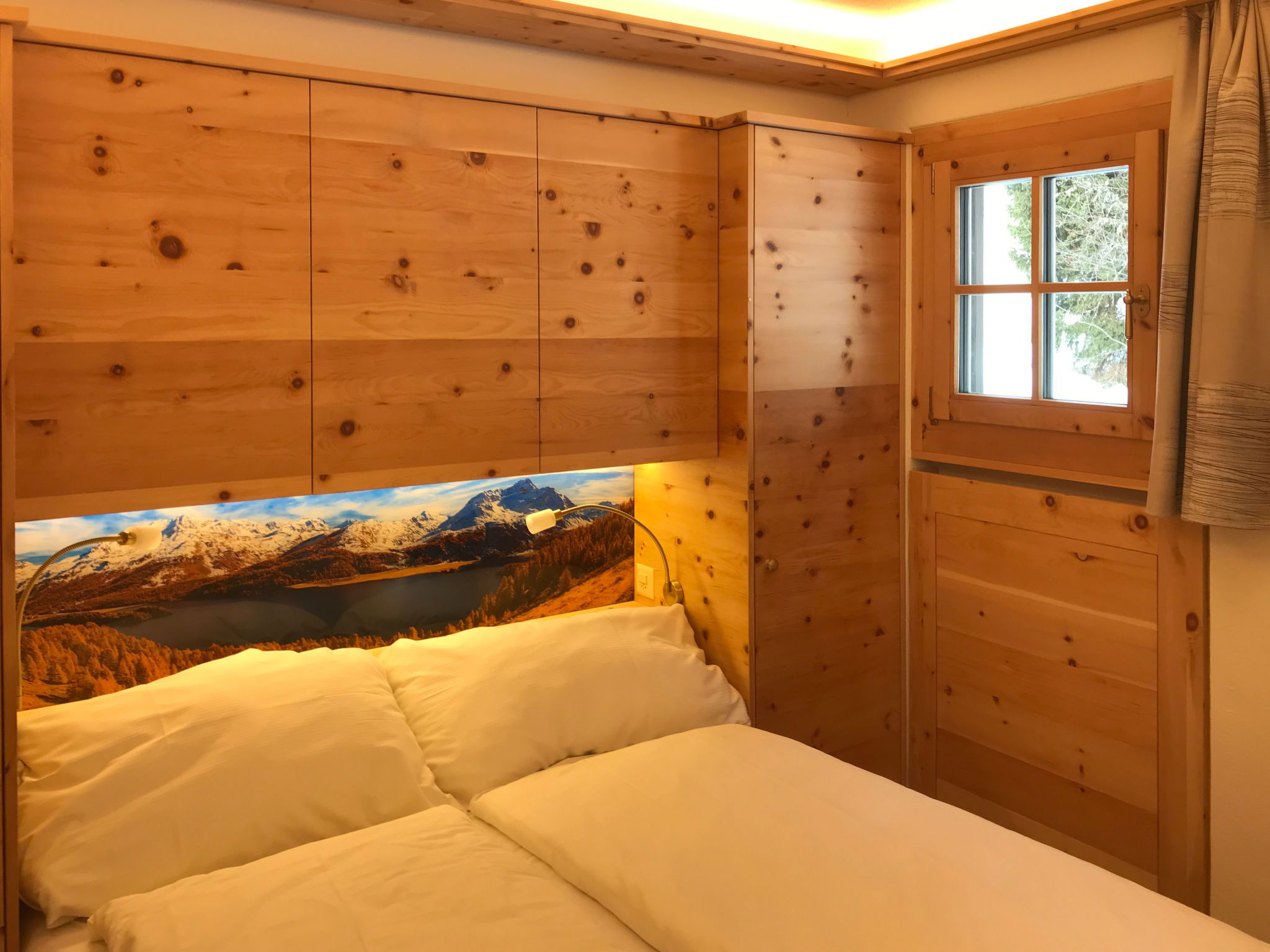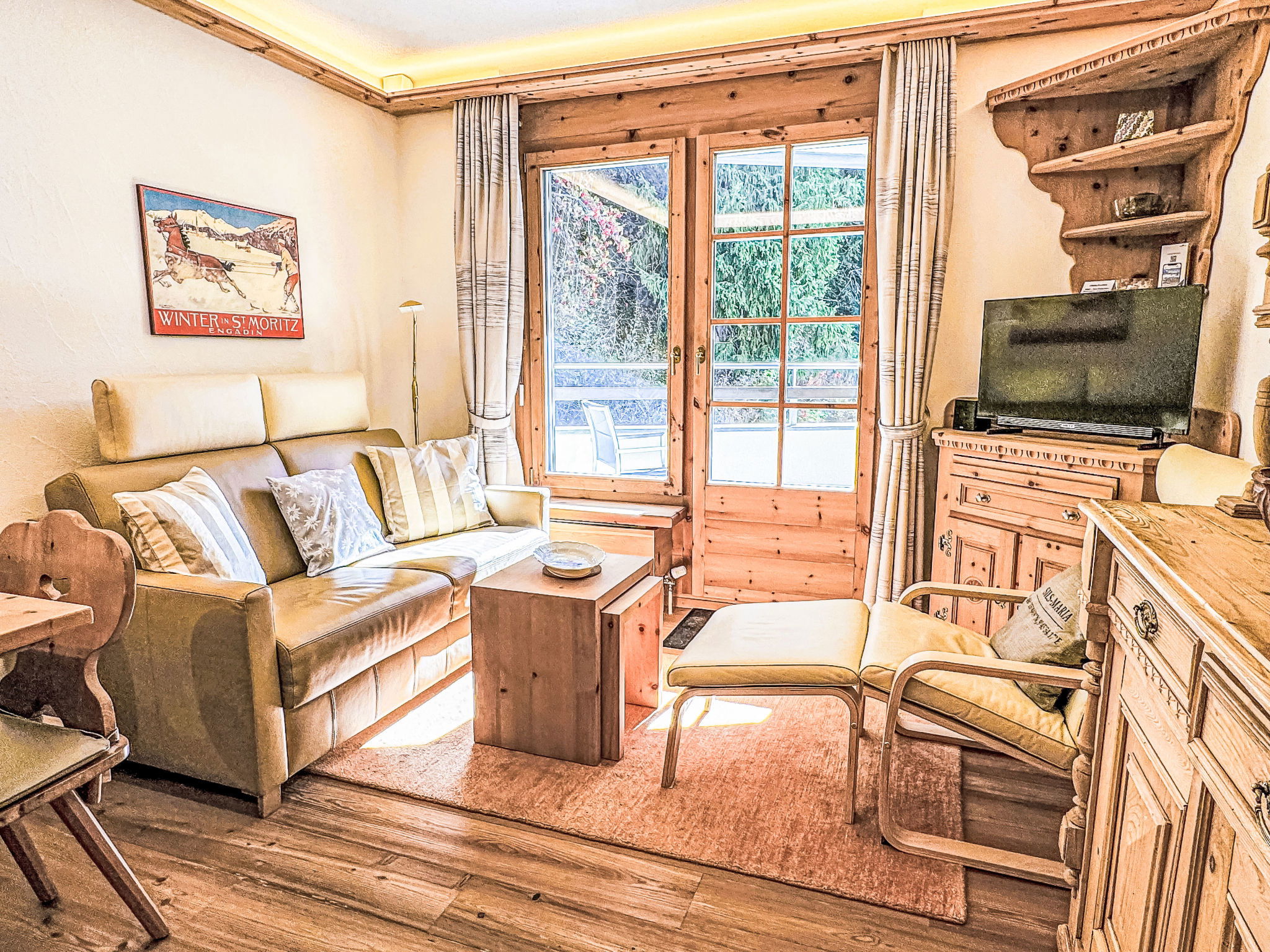 "Chesa Alvetern 5", 1-room apartment 35 m2 on 1st floor. Partly renovated in 2016, comfortable and wooden furniture furnishings: living/sleeping room with 1 double bed (2 x 80 cm, length 200 cm), dining table and TV (flat screen). Exit to the balcony, south facing position. Open kitchen in the entrance (4 hot plates, oven, dishwasher, toaster, kettle, microwave, electric coffee machine, Capsules for coffee machine (Nespresso) extra, raclette grill, fondue Set (cheese)). Bath/WC. Heating. Balcony. Balcony furniture. Partial view of the resort. Facilities: hair dryer. Internet (WiFi, free). Garage space n 5, height 200 cm, width 250 cm. Please note: non-smokers only. Maximum 1 pet/ dog allowed.