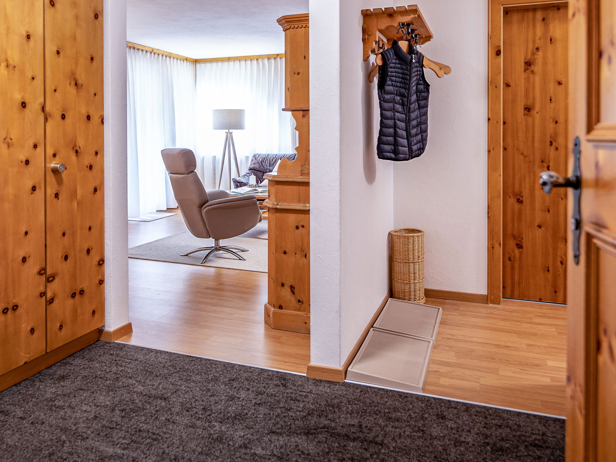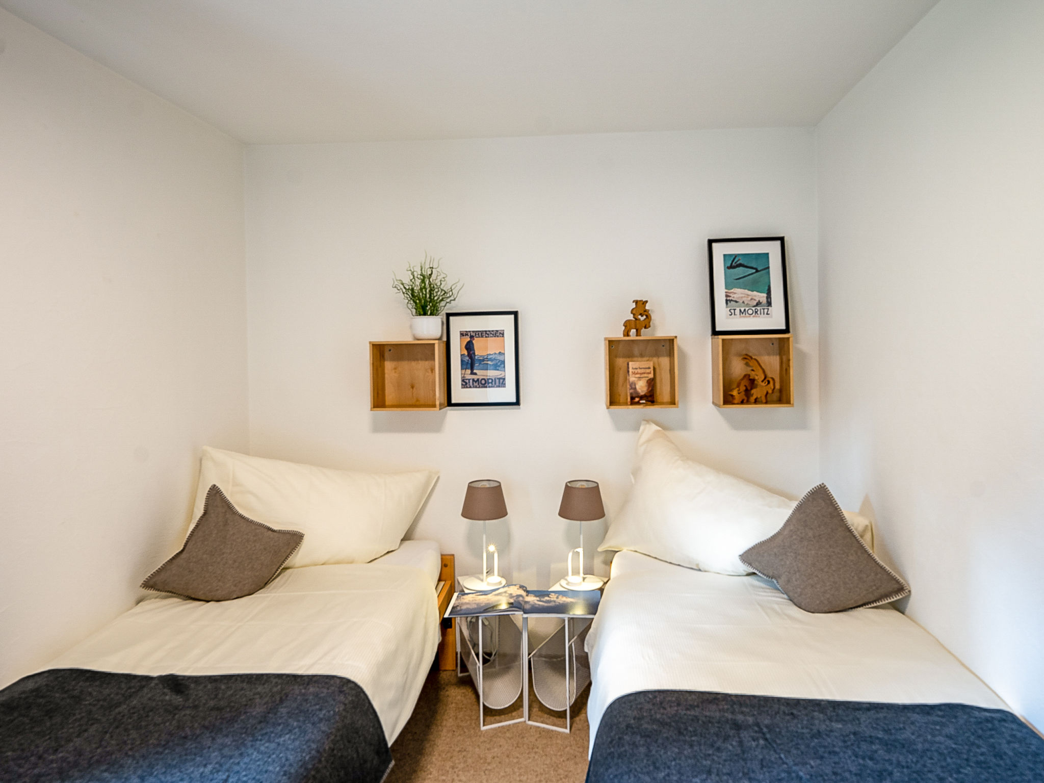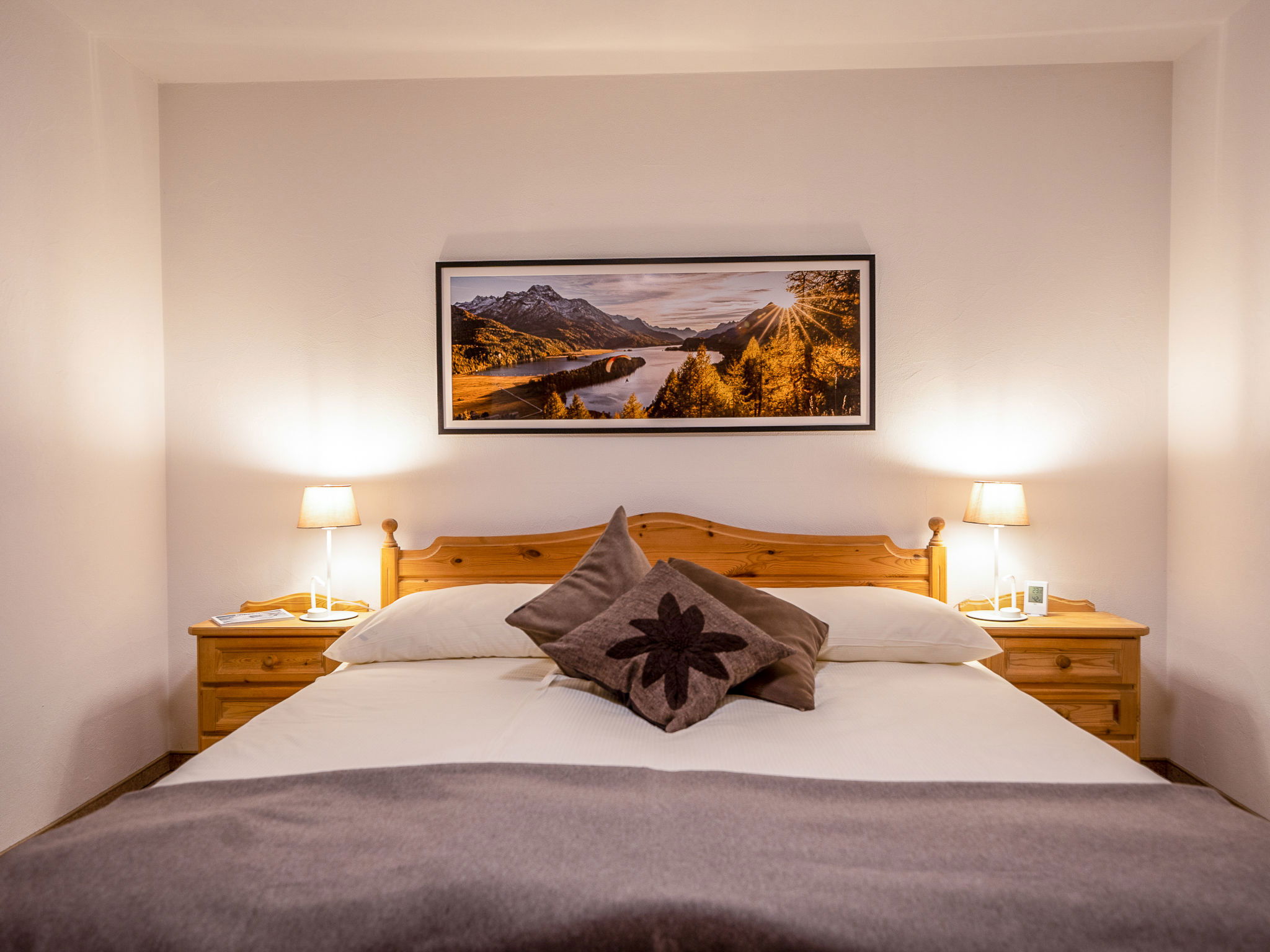 "Chesa Auricula 1.1", 3-room apartment 92 m2, on the ground floor. Spacious and bright, cosy furnishings: living/dining room with TV (flat screen). Exit to the terrace. 1 room with 2 beds (90 cm, length 200 cm). 1 double bedroom with 1 double bed (2 x 90 cm, length 200 cm). Kitchen (oven, dishwasher, 4 ceramic glass hob hotplates, toaster, kettle, microwave, freezer, electric coffee machine, Capsules for coffee machine (Nespresso) extra, fondue Set (cheese)). Bathroom, shower/WC. Heating. Patio 10 m2. Terrace furniture. Side view of the mountains and the resort. Facilities: iron, hair dryer. Internet (WiFi, free). Garage space n 11 (1 car), height 205 cm, width 220 cm. Please note: suitable for families. Non-smokers only, non-smoking house. Maximum 1 pet/ dog allowed.