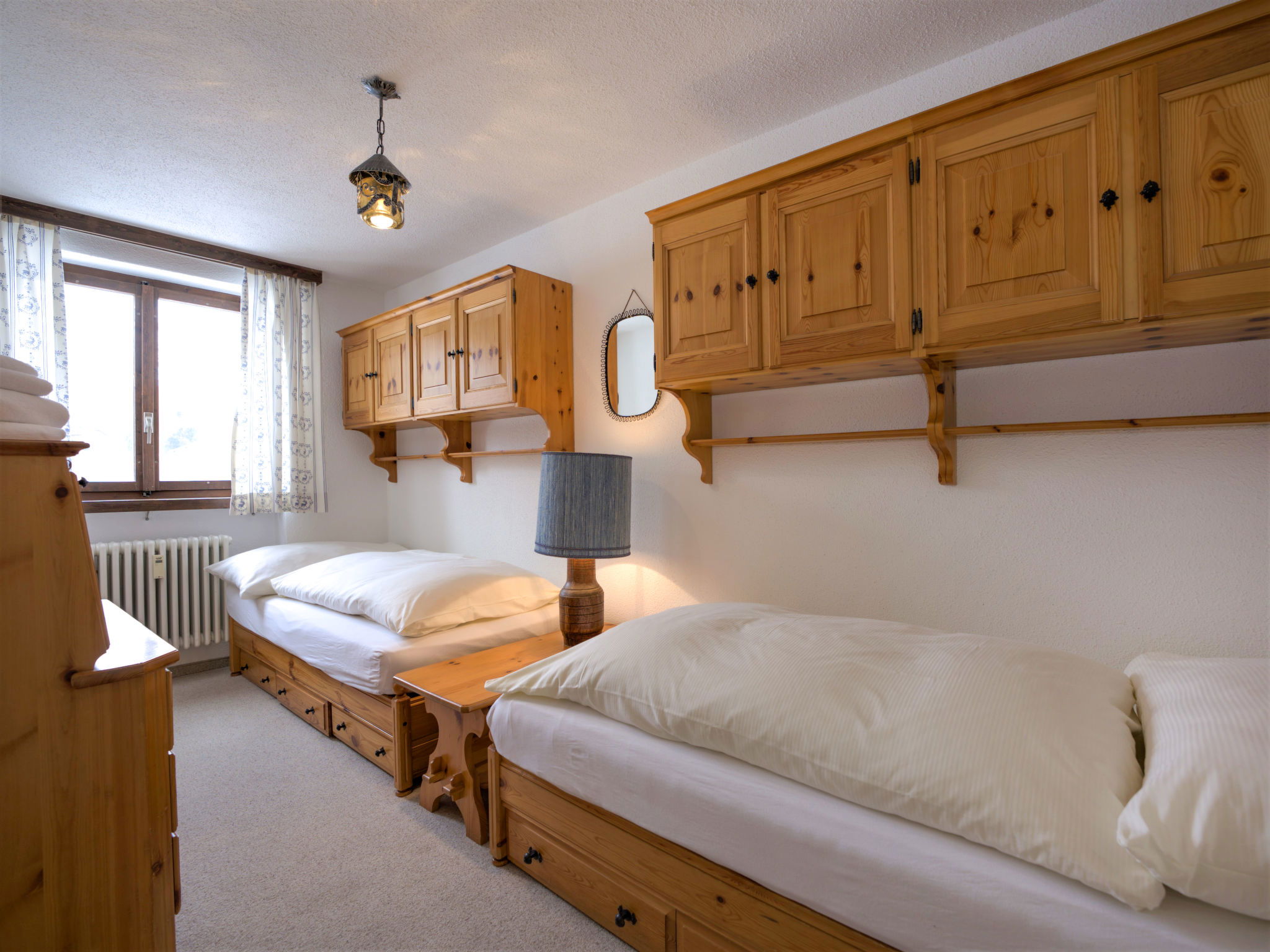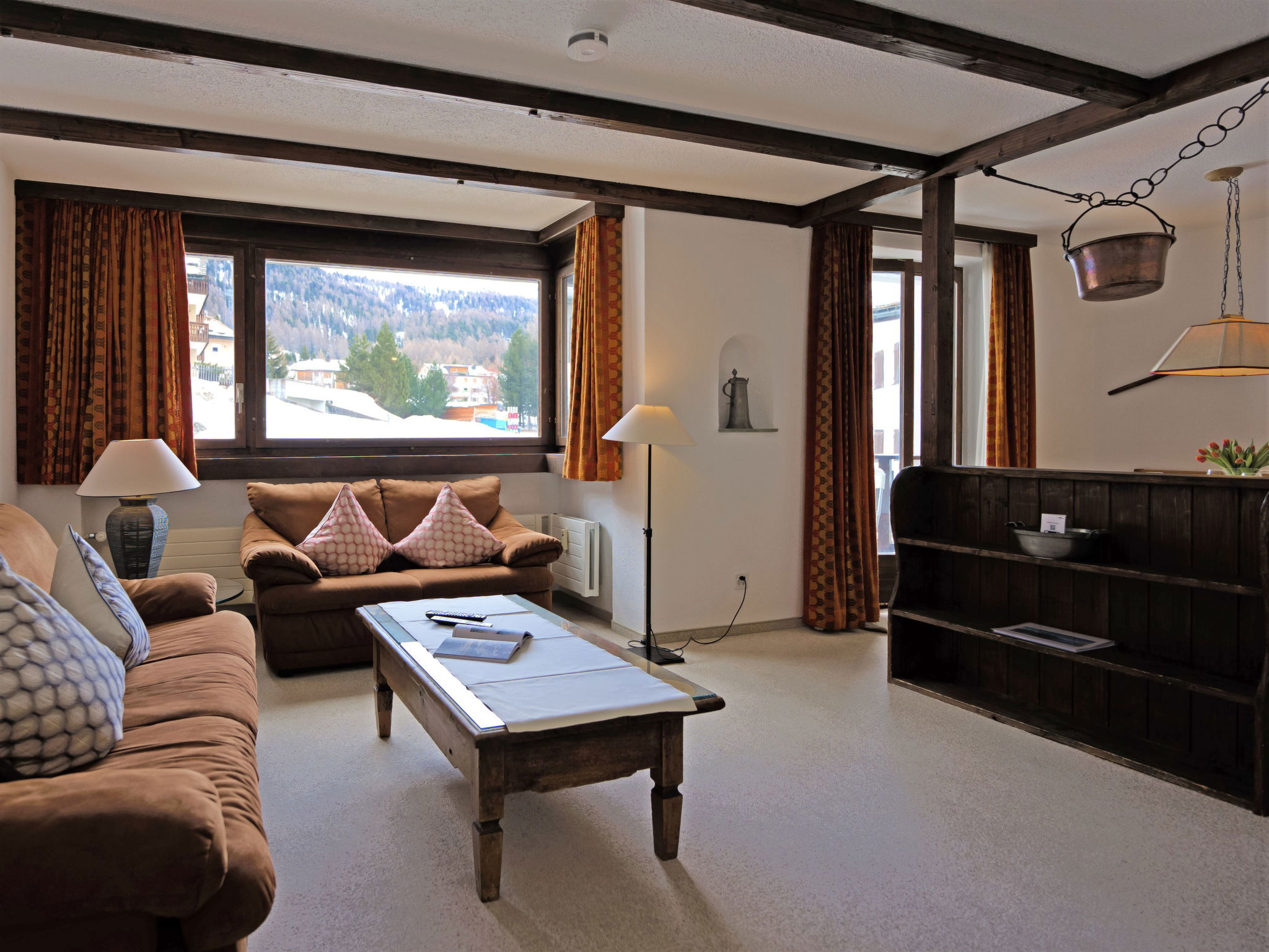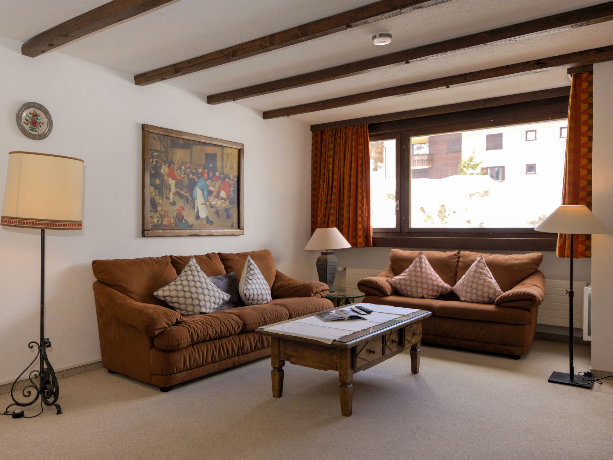 "Chesa Linaria", 3-room apartment 70 m2, on the upper ground floor. Simple furnishings: living room with dining nook and TV (flat screen). Exit to the balcony, south facing position. 1 room with 1 double bed (2 x 90 cm, length 185 cm). 1 small room with 2 beds (90 cm, length 190 cm). Kitchen (oven, dishwasher, toaster, kettle, electric coffee machine, Capsules for coffee machine (Nespresso) extra, raclette grill, fondue Set (chinoise)) with hatch. Bath/WC, shower/bidet/WC. Heating. Small balcony. Terrace furniture. Beautiful view of the mountains. Facilities: iron, hair dryer. Internet (WiFi, free). Garage space n 9 (small!), height 205 cm, width 190 cm. Maximum 1 pet/ dog allowed. 756.8668.2733.01