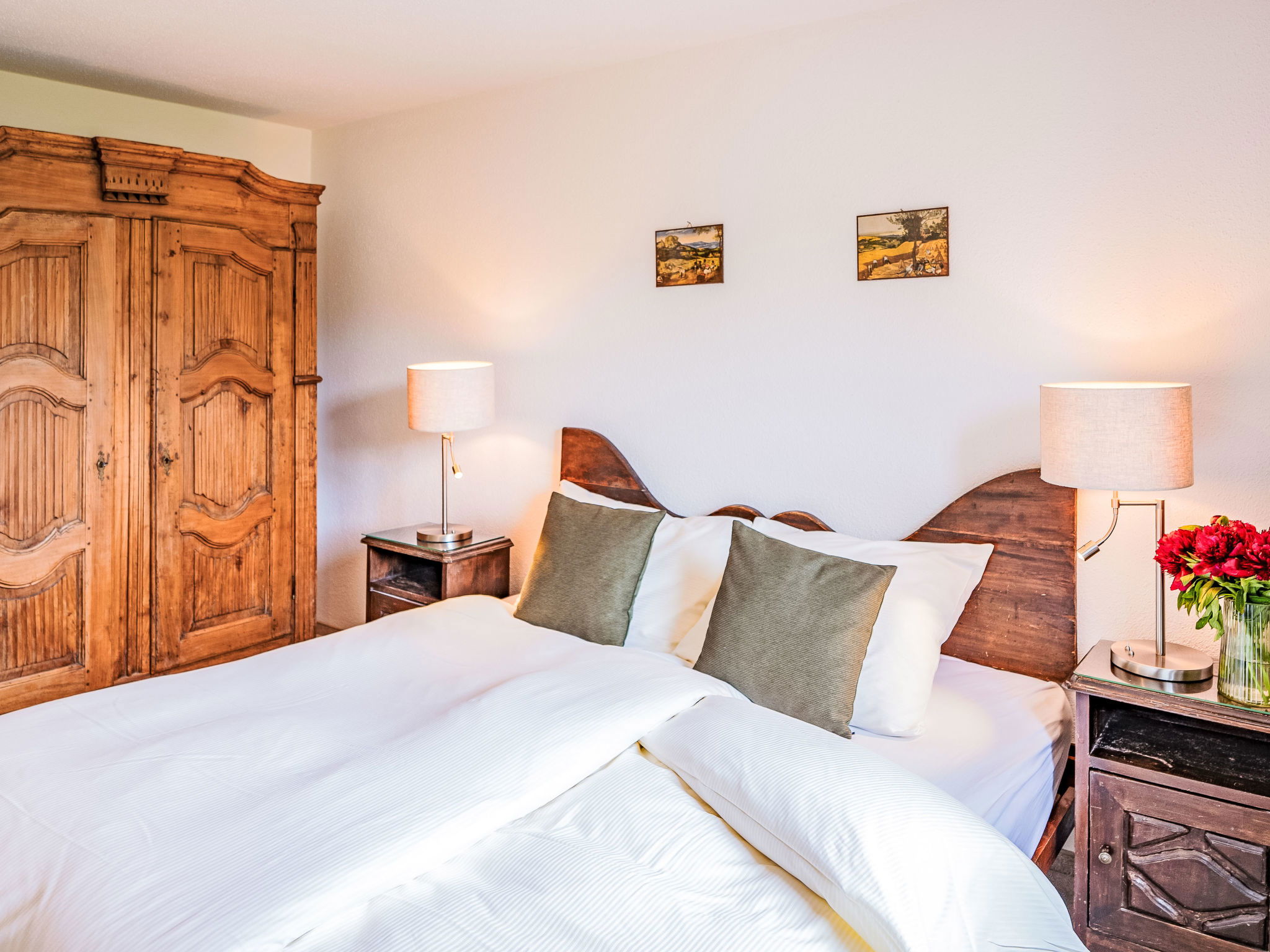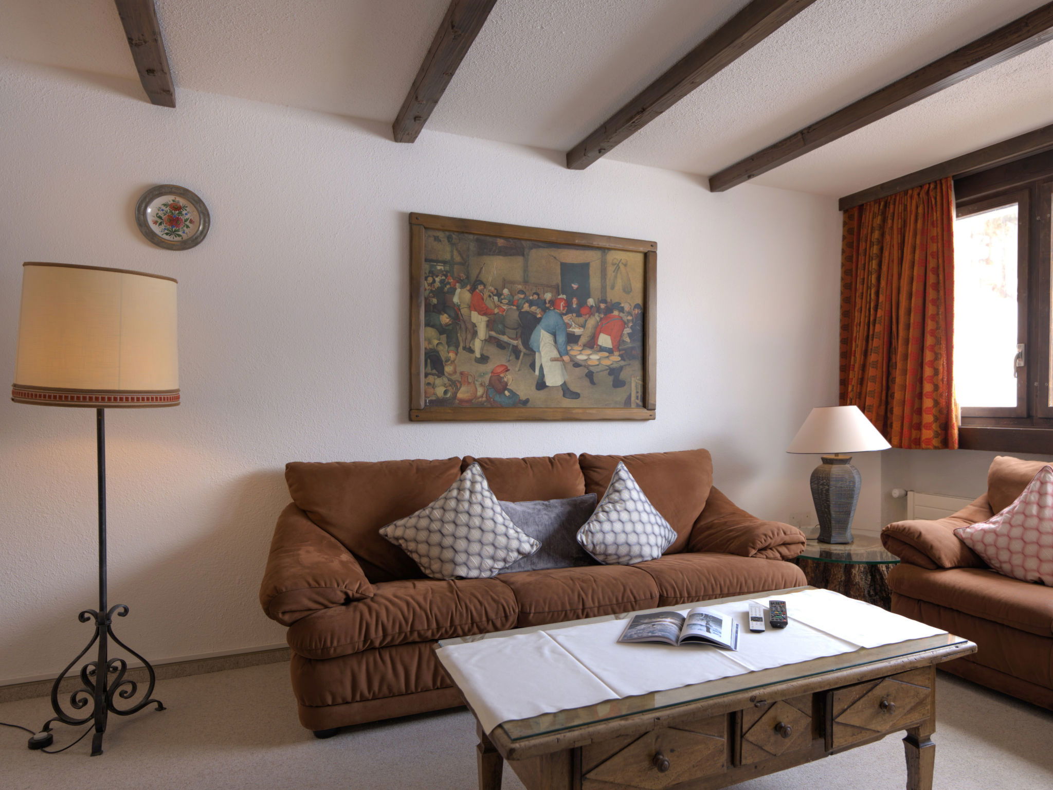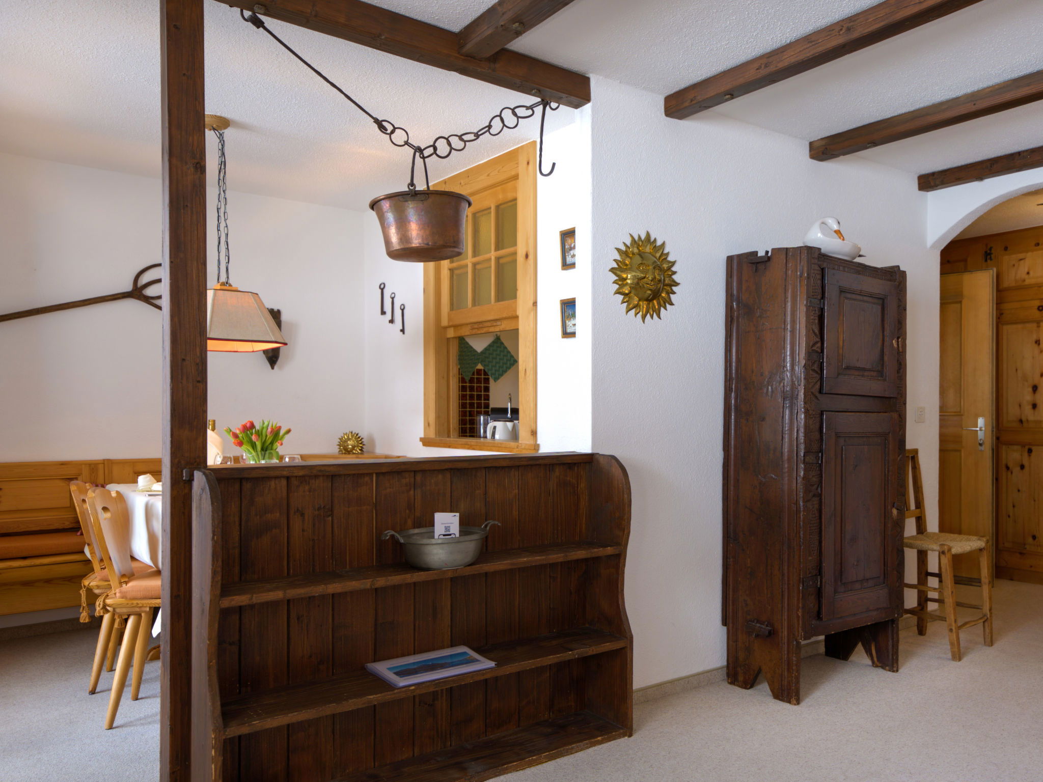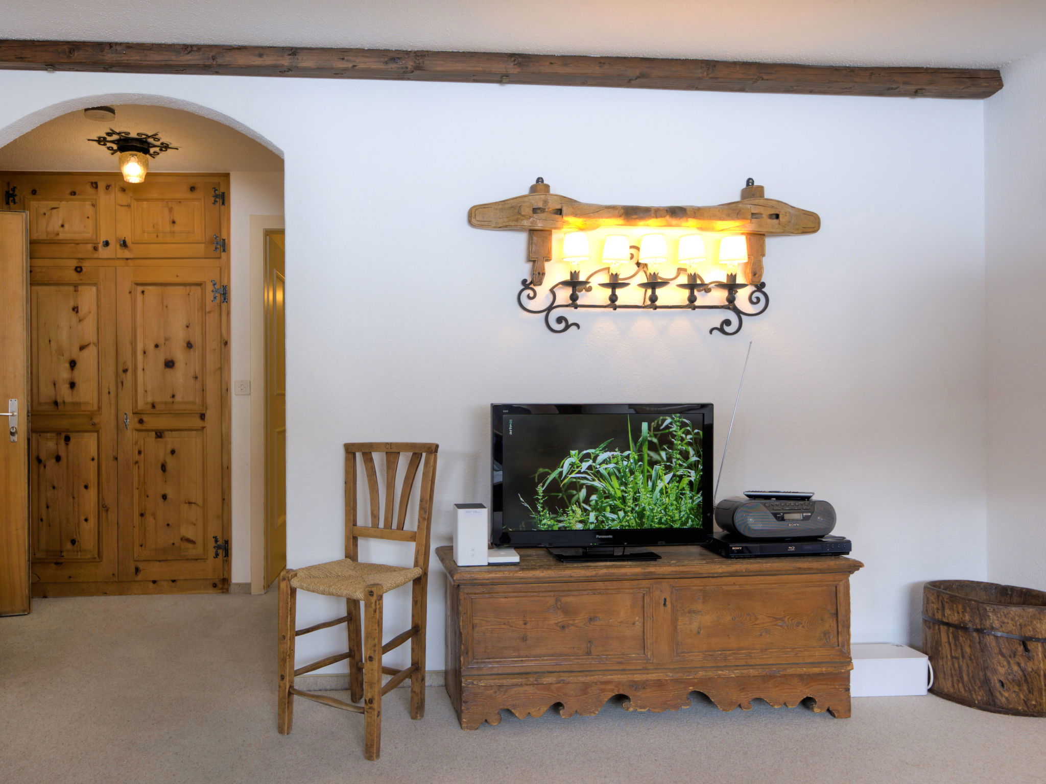 "Chesa Linaria", 3-room apartment 70 m2, on the upper ground floor. Simple furnishings: living room with dining nook and TV (flat screen). Exit to the balcony, south facing position. 1 room with 1 double bed (2 x 90 cm, length 185 cm). 1 small room with 2 beds (90 cm, length 190 cm). Kitchen (oven, dishwasher, toaster, kettle, electric coffee machine, Capsules for coffee machine (Nespresso) extra, raclette grill, fondue Set (chinoise)) with hatch. Bath/WC, shower/bidet/WC. Heating. Small balcony. Terrace furniture. Beautiful view of the mountains. Facilities: iron, hair dryer. Internet (WiFi, free). Garage space n 9 (small!), height 205 cm, width 190 cm. Maximum 1 pet/ dog allowed. 756.8668.2733.01