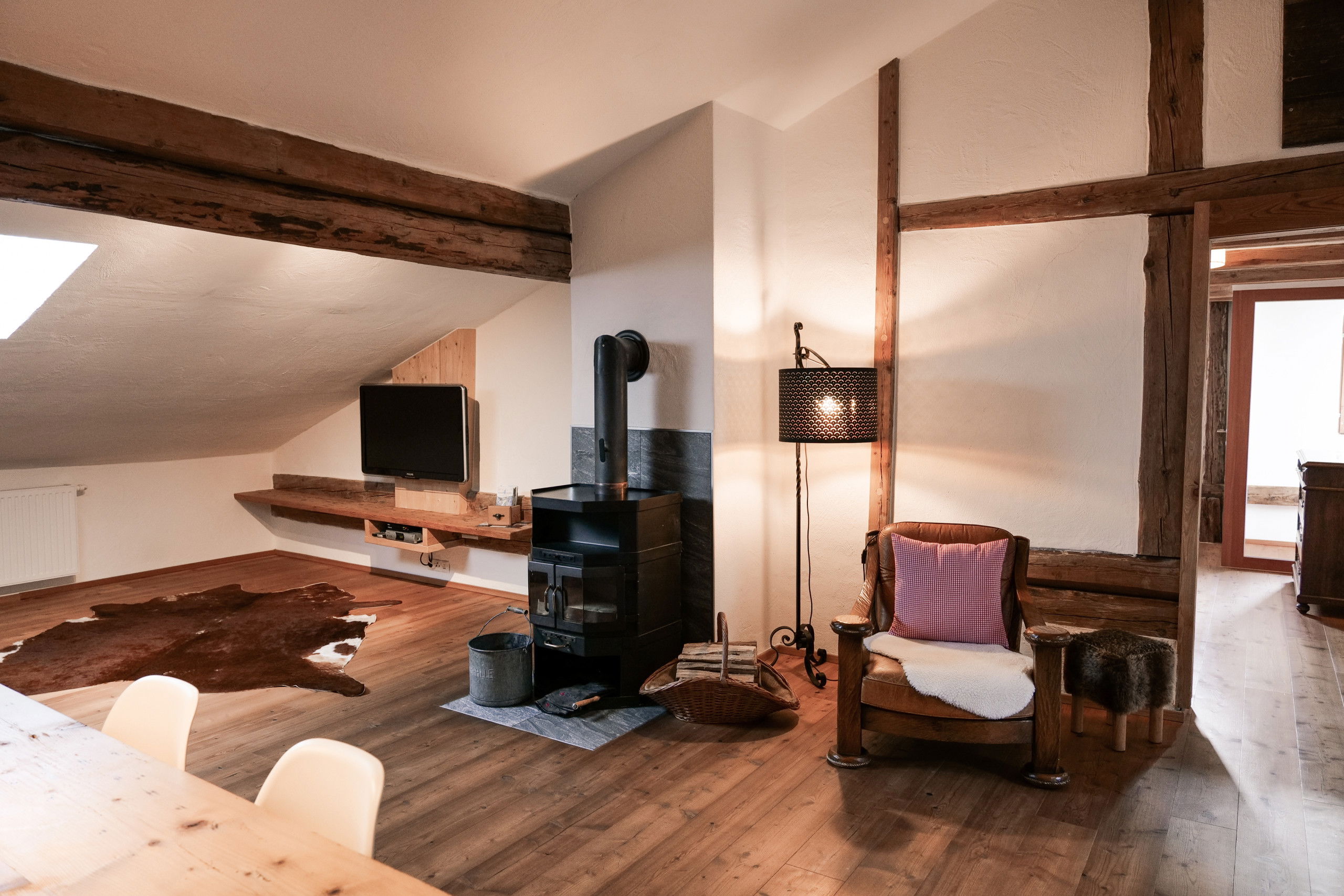The flat welcomes its guests with a spacious living room, which radiates a particularly cosy atmosphere thanks to the rustic exposed wood and the warming wood-burning stove. The wood-burning stove provides cosy warmth and accompanies guests throughout the flat with its pleasant crackling.