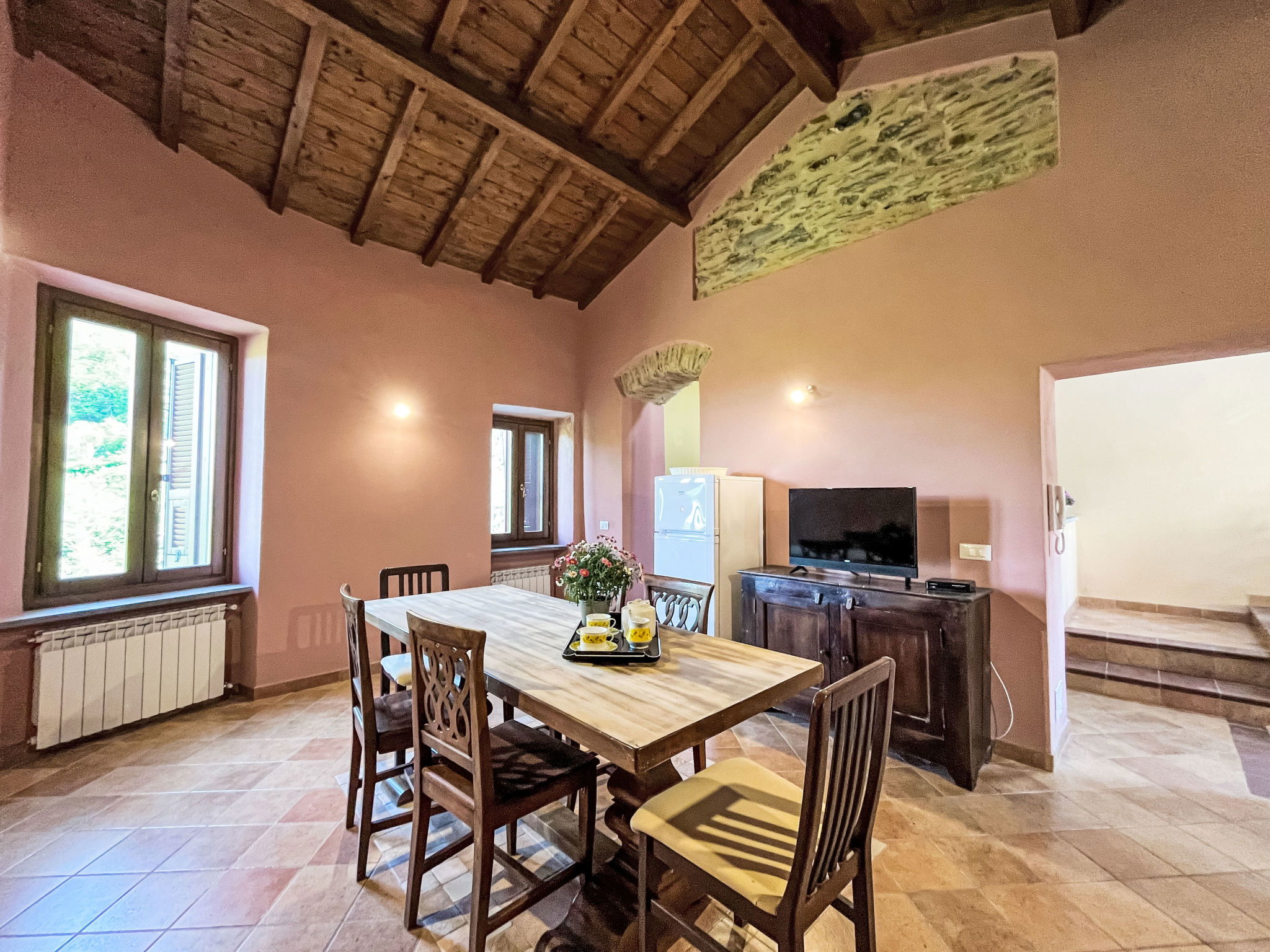 Rustic, comfortable cottage "Il Vecchio Mulino", 500 m a.s.l., from the 18th century. 4 apartments in the property. In the district of Novelli with 10 houses 1 km from the centre of Tavole, 9 km from the centre of Dolcedo, 17 km from the centre of Imperia, in a secluded, sunny, elevated position in the residential district, 15 km from the sea, 1 km from the lake, 1 km from the river. For shared use: natural state property 1'000 m2 (fenced), meadow, swimming pool (12 x 5 m, depth 140 cm, seasonal availability: 15.May. - 30.Sep.). Patio, terrace, garden furniture, barbecue. 1 km long narrow motor access. 150 m footpath to the house. Public parking 150 m. Shop 2 km, grocery 2 km, supermarket 15 km, shopping centre 15 km, restaurant 2 km, bar 2 km, bakery 6 km, café 2 km, bicycle rental 4 km, bus stop 400 m, railway station "Imperia / Porto Maurizio" 17 km, pebble beach "Imperia" 17 km, bathing lake "laghetti" 1 km. Walking paths from the house 100 m. Nearby attractions: Madonna del Piano, Aussichtspunkt 800 m, Kapelle Santa Marta, Wanderung 5 km, Bussana Vecchio Erdbebendorf 34 km, Valloria,Künstlerdorf,160 bemalten Türen 3 km, Lavendeldestillation in Pantasina 10 km, San Remo 35 km. Please note: car-free holiday complex, car recommended.