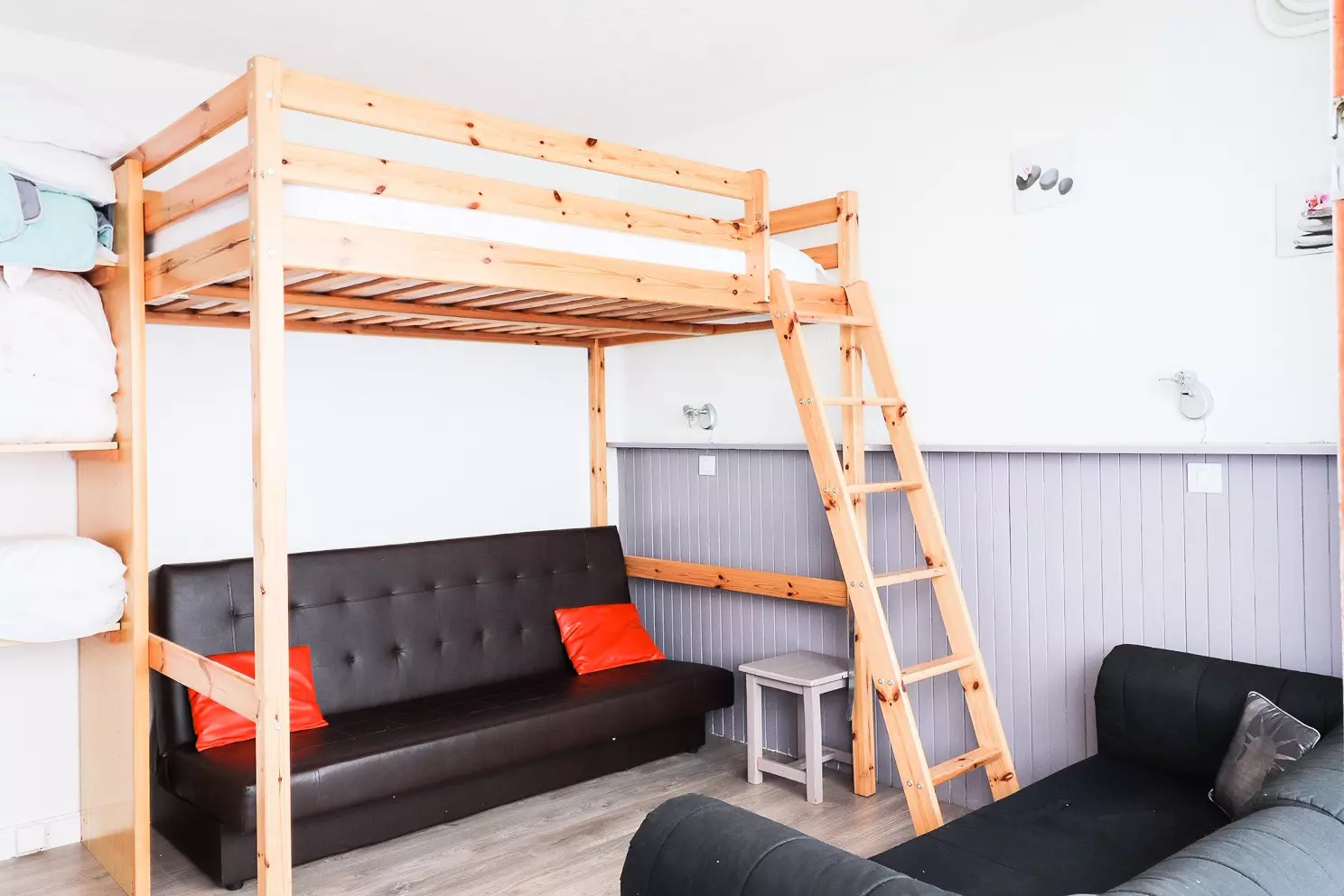 Bedroom with a double bed on the mezzanine and a double sofa bed underneath.