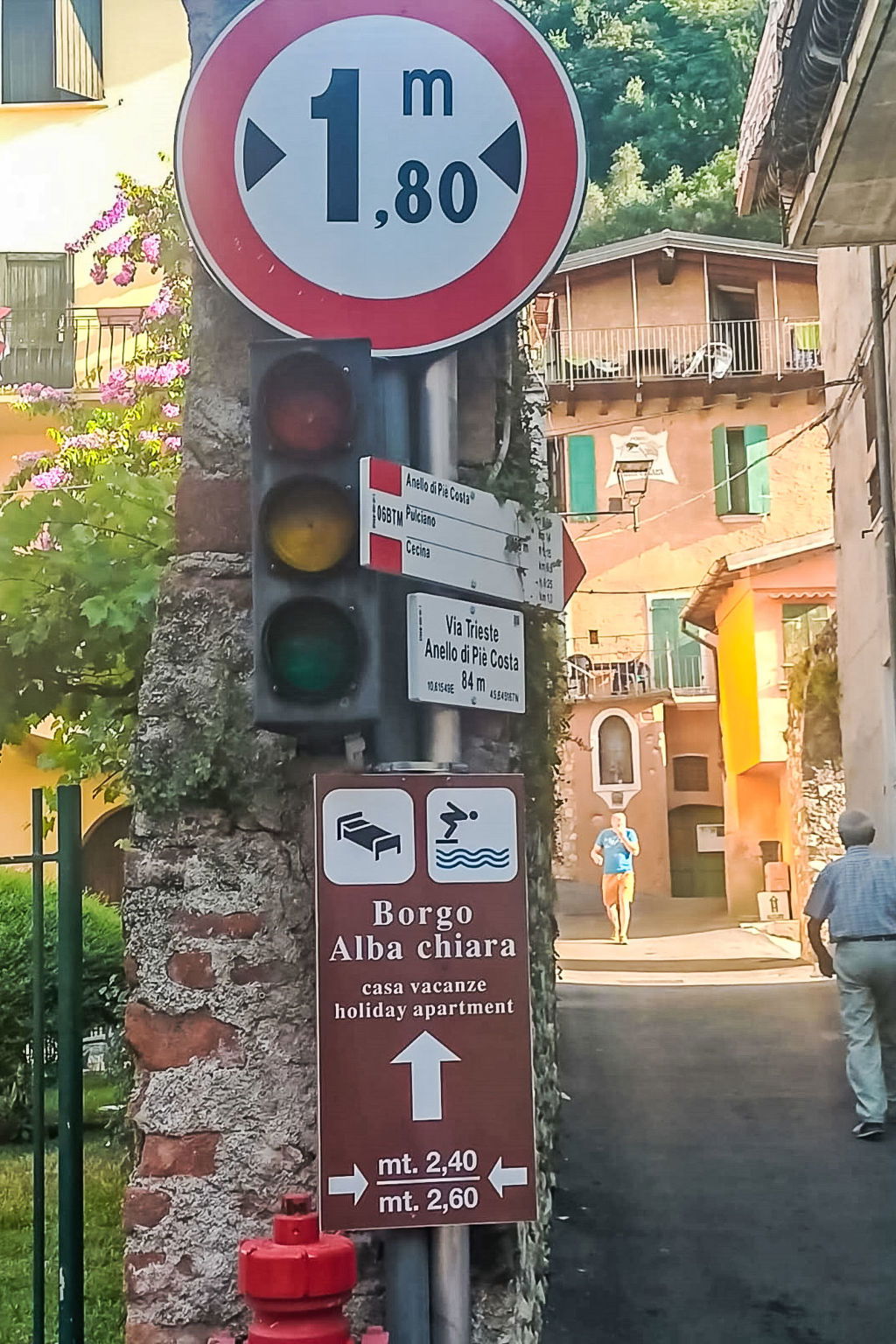 Historical residence "Borgo Alba Chiara", 3 storeys, from the 16th century. 18 apartments in the residence. In the resort 150 m from the centre of Toscolano, 2 km from the centre of Maderno, in an elevated position on a slope, 400 m from the lake. For shared use: property (fenced), terraced garden (fenced) with plants and flowers, meadow, swimming pool kidney-shaped (12 x 6 m, seasonal availability: 01.Jan. - 31.Dec.). Children's pool, outdoor shower, patio, garden furniture, barbecue, children's playground (sandbox). In the complex: WiFi, washing machine (for shared use, extra). 80 m long very steep, narrow motor access to the house. Stepped path to the house. Width of access road: 250 cm. Parking (limited number of spaces) on the premises, public parking 400 m on the road extra. Shop 500 m, grocery 150 m, supermarket 2.2 km, bus stop 200 m, railway station "Desenzano del Garda" 31 km, ferry "Maderno" 2.5 km, 400 m. Nearby attractions: Salò 12 km, Limone sul Garda 25 m, Brescia 50 km. Please note: baby equipment on request (extra). Residence with electric gates. The photo is just an example. The holiday properties may differ in situation, size and location. The holiday properties may differ in living space, floorplan, equipment and furnishing.