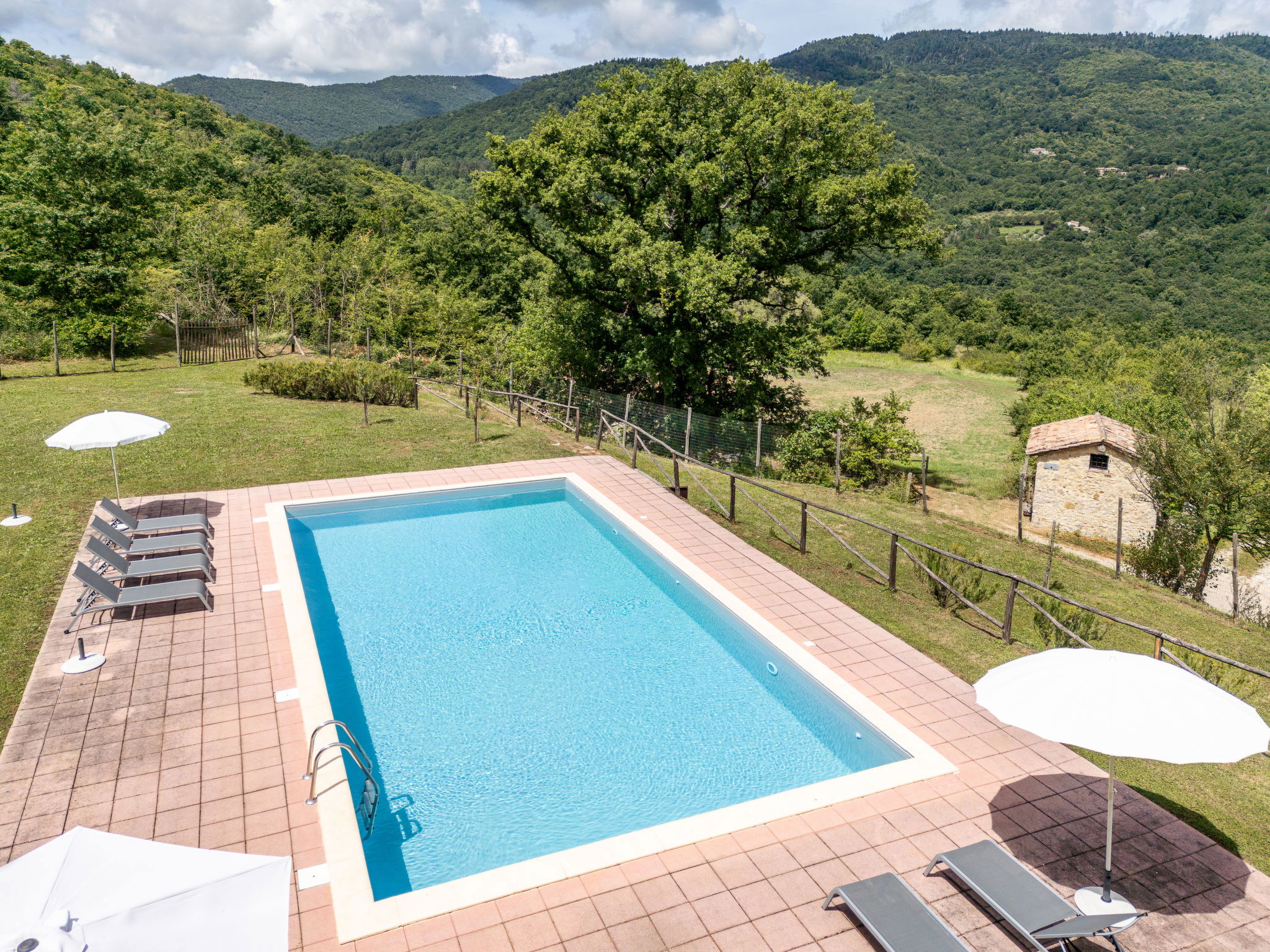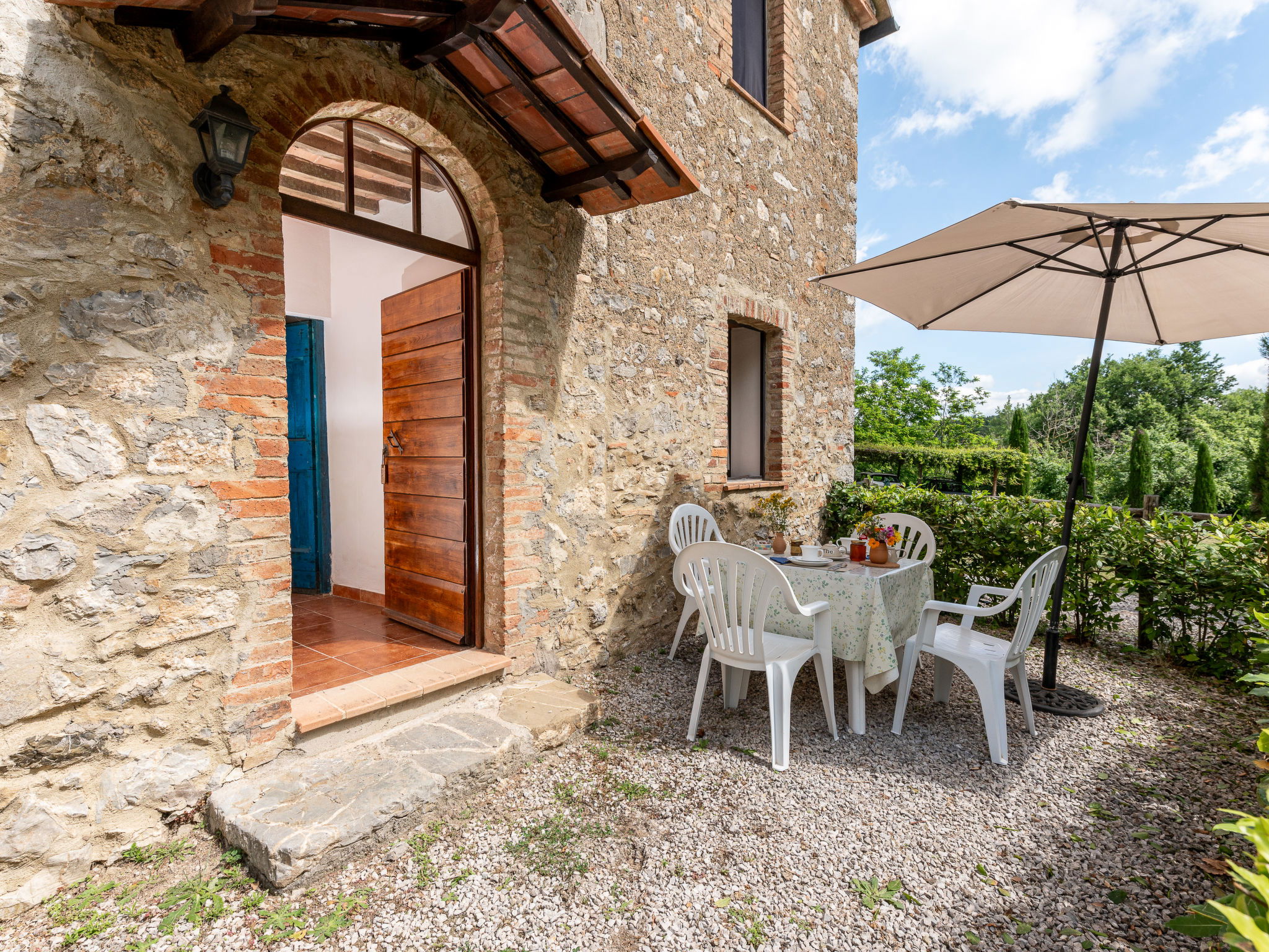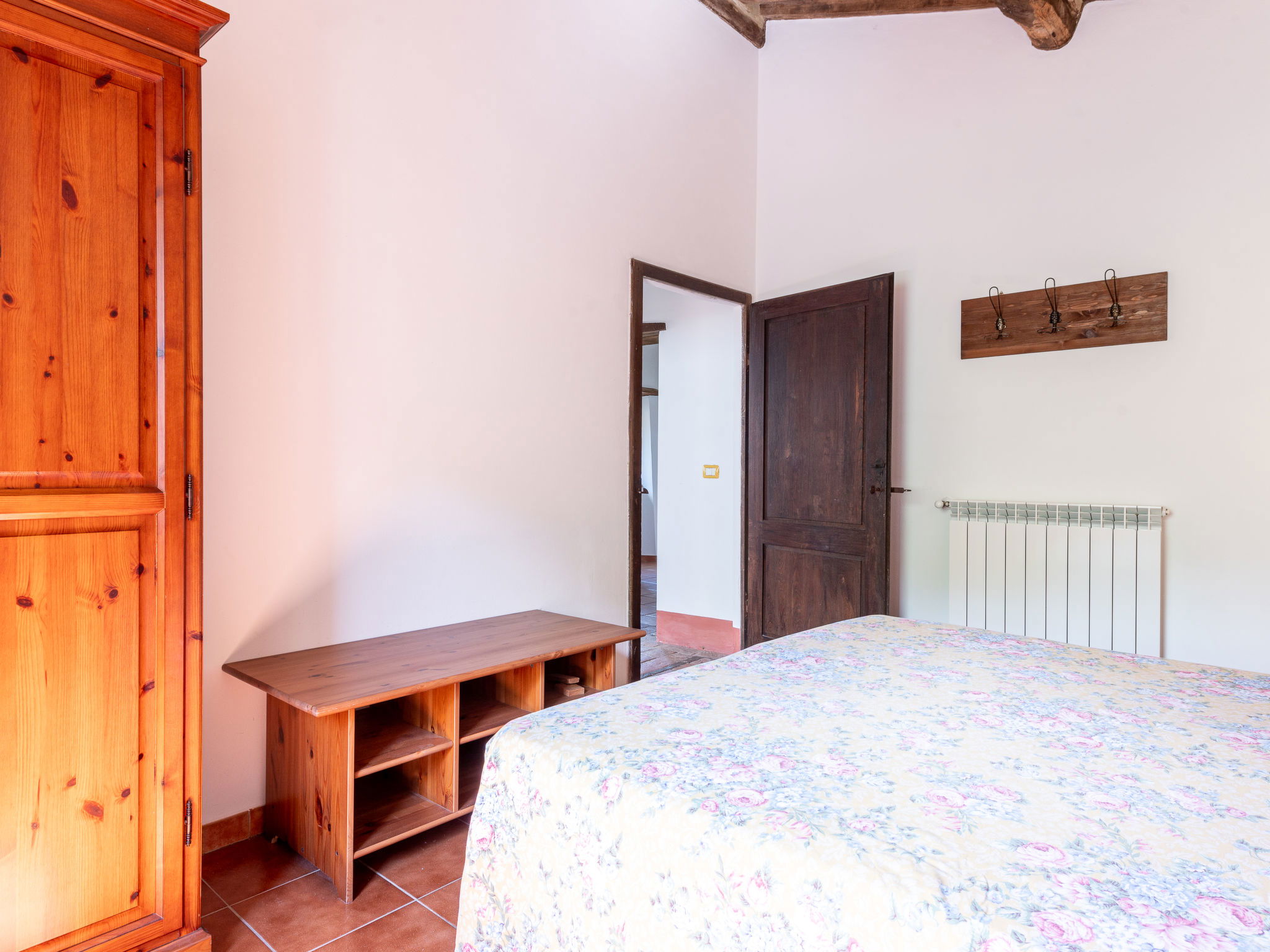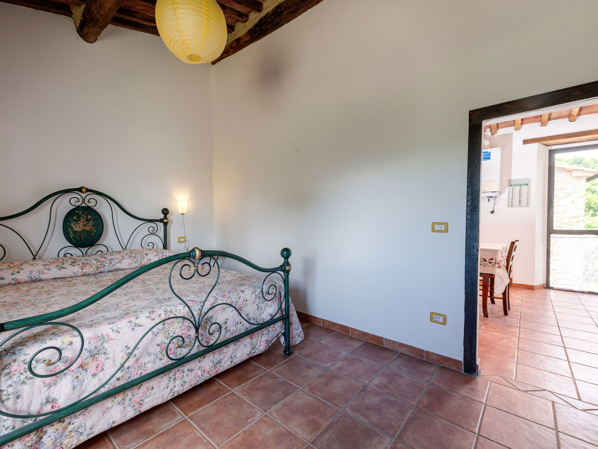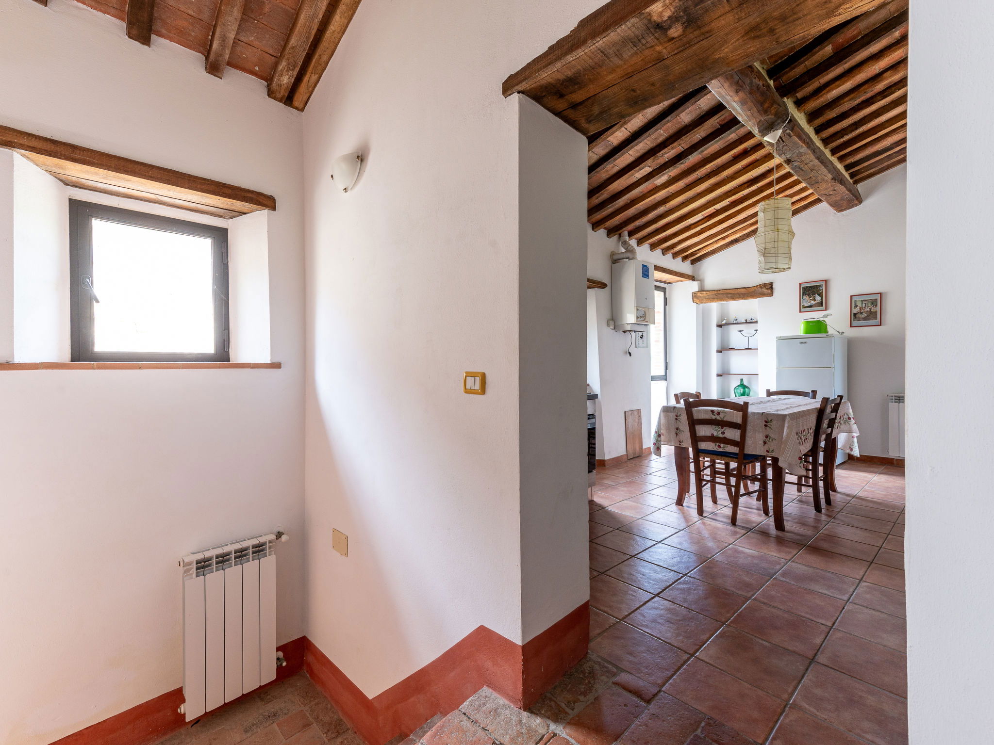Country house "I Prati di Travale", detached, surrounded by trees, meadows and fields. 4 apartments in the residence. 1 km from the centre of Travale, 6 km from the centre of Montieri, 45 km from the centre of Siena, 45 km from the sea. For shared use: natural state property 3'000 m2, trees, meadow, swimming pool (12 x 6 m, depth 140 cm, seasonal availability: 24.May. - 20.Sep. pool opening hours: 09:00-20:00). Outdoor shower, patio, pool maintenance by the owner/gardener. In the house: washing machine (for shared use, extra). 400 m long bumpy motor access. Parking on the premises. Shop 1 km, supermarket 6 km, bicycle rental 5 km, park "Cornate e Fosini" 12 km, bathing lake "Accesa" 19 km. Riding stable 5 km, walking paths from the house 10 m. Nearby attractions: Giardino dei Suoni 19 km, Abbazia di San Galgano 20 km, Dream Wood - Artistic park 30 km. Well-known lakes can easily be reached: Accesa 35 km. Hiking paths: Mountain-bike 3 km. Local sale of farm products. Please note: animals in the neighbourhood. The swimming pool is reached by an external staircase. E-Bike rental 5km. The prices include limited consumption of electricity.