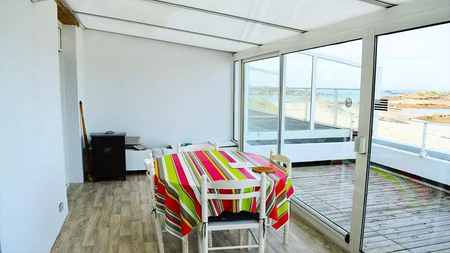 Residence des Sept îles in Trégastel, apartment with magnificent sea view and direct access to the Grève Blanche beach. 3-star rental rated for its comfort, 35 m² furnished for 2 to 4 people, including a living room with access to the terrace and veranda with sea view, kitchenette, dining table and TV lounge, Wi-Fi connection, bedroom with sea view and access to the terrace, bathroom with sink and shower, WC. One private parking space. Linen optional. Small dog accepted. Non-smoking accommodation. Final cleaning included.
