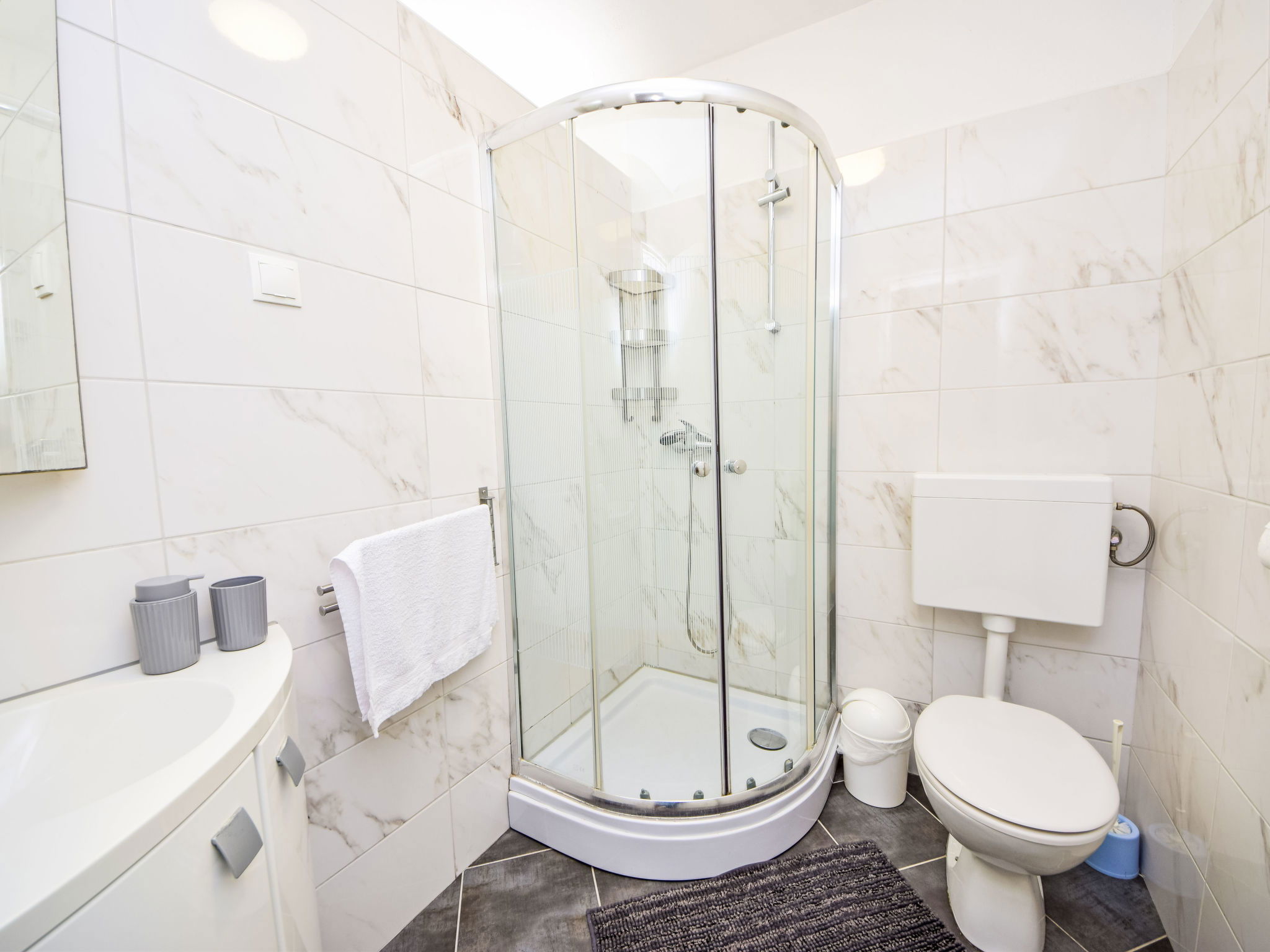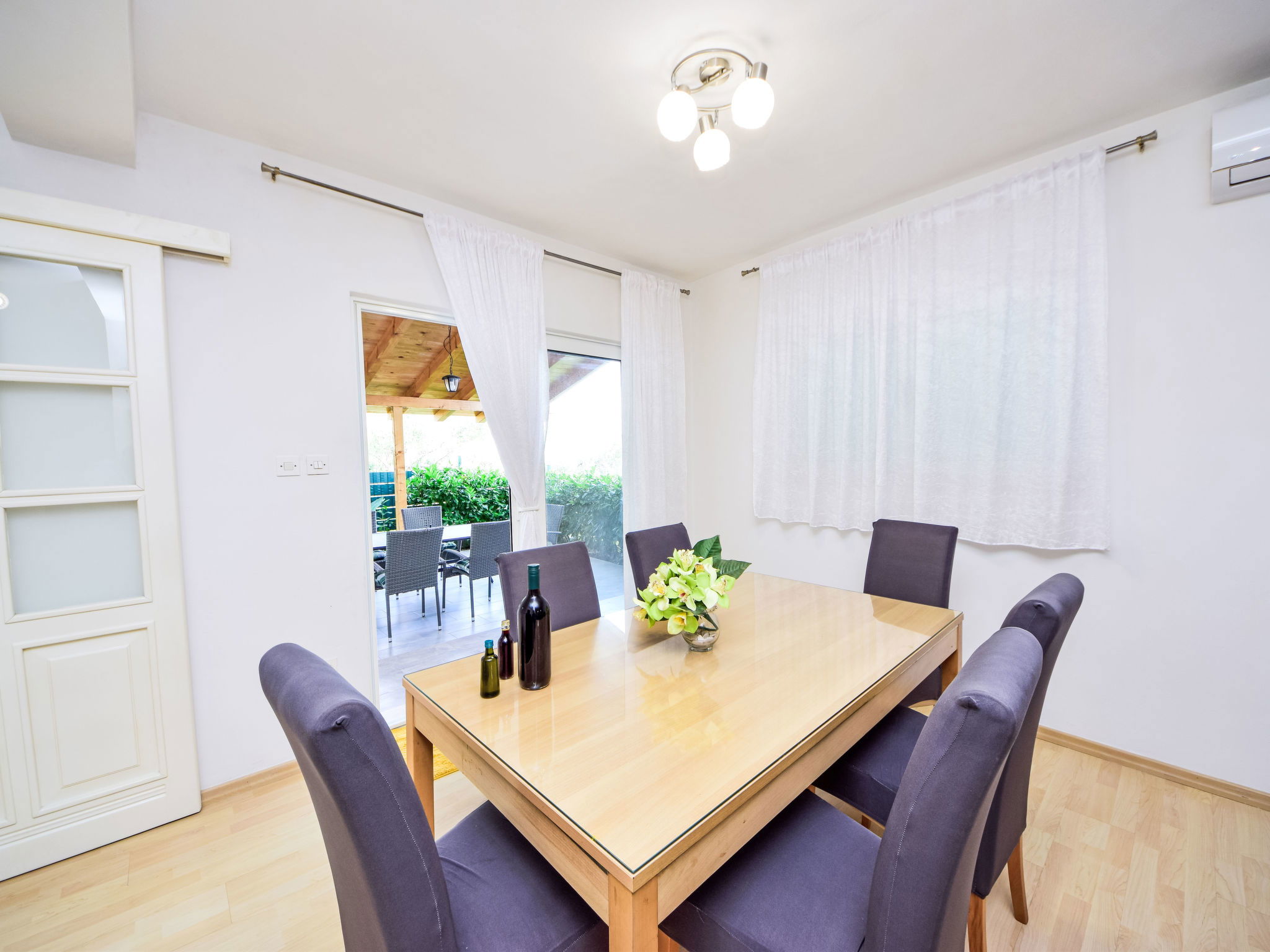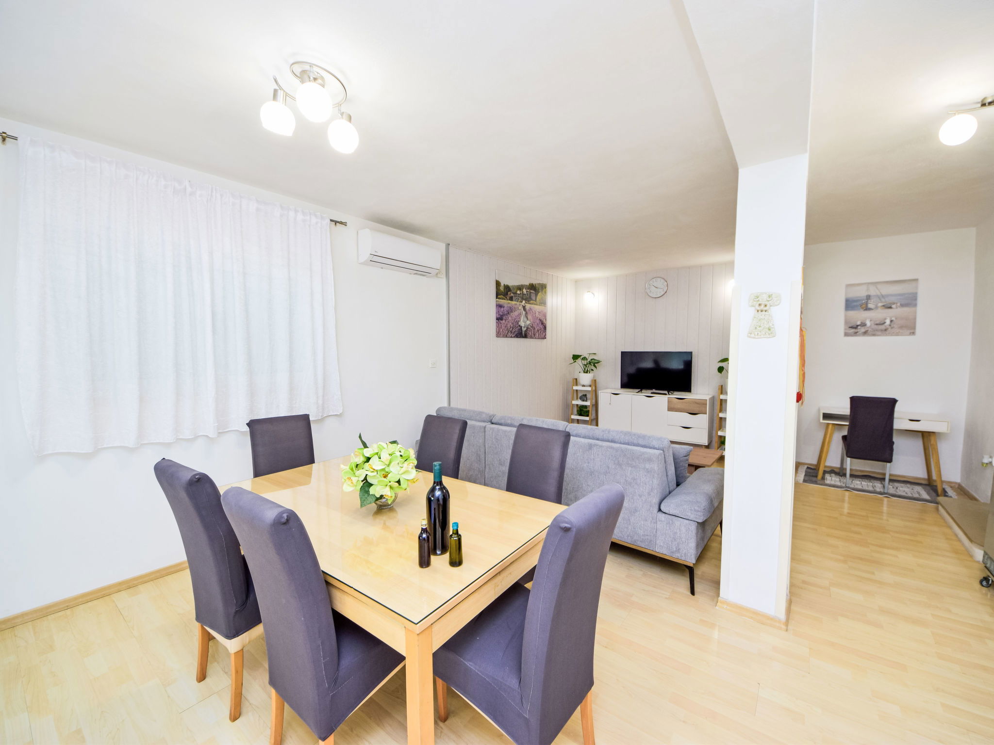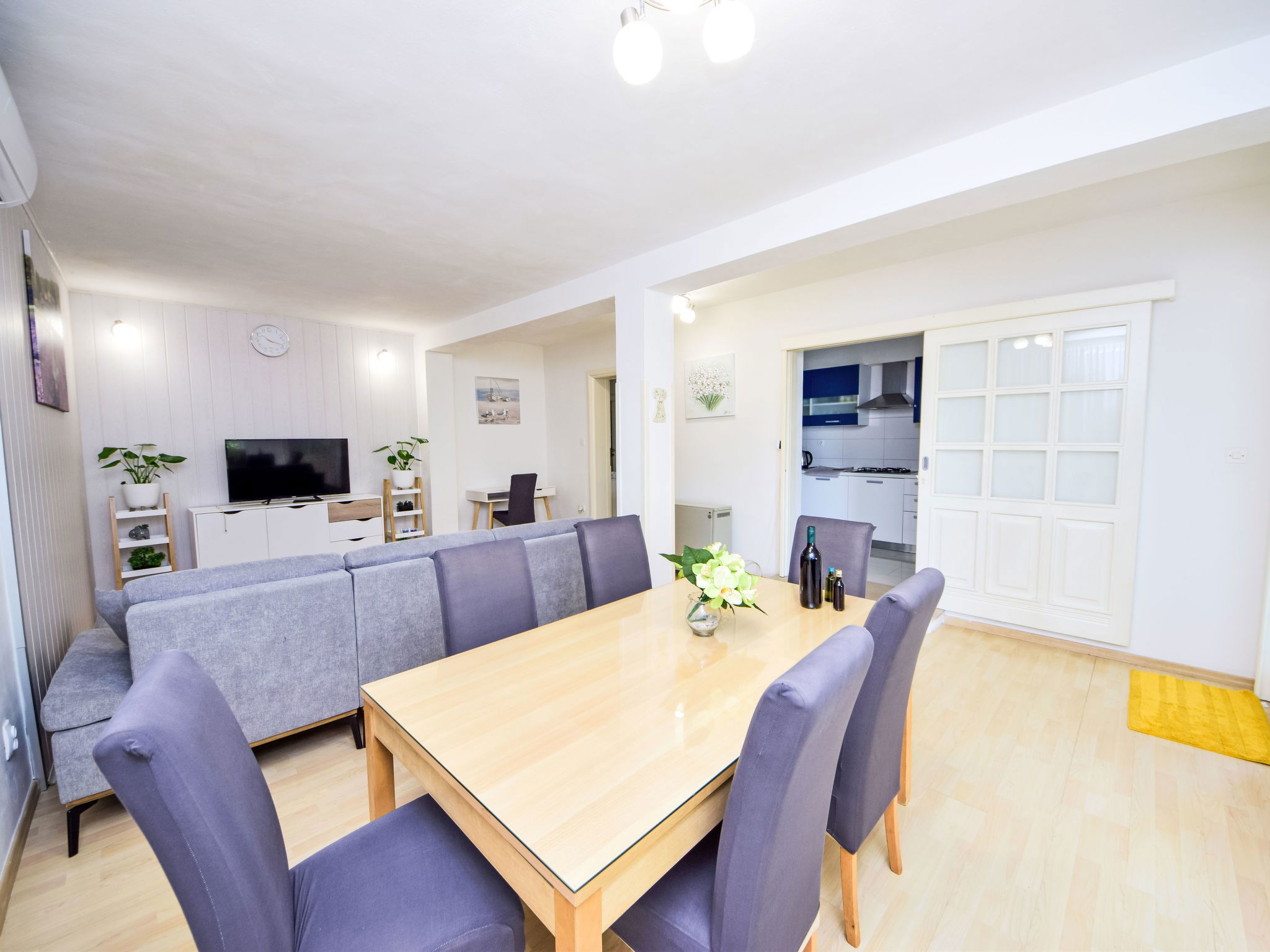 "Klarić", 4-room apartment 95 m2, on the ground floor. Living/dining room with satellite TV (flat screen), air conditioning. Exit to the terrace. 1 room with 1 french bed. 1 room with 1 bed and 1 french bed. 1 room with 1 double bed. Kitchen (1 hot plate, oven, dishwasher, 3 gas rings, toaster, kettle, microwave, freezer, electric coffee machine). 2 showers/WC. No heating option. Terrace. Terrace furniture. Partial view of the sea. Facilities: washing machine, iron. Internet (WiFi, free). Parking (2 cars). Please note: maximum 1 small pet/ dog allowed. Private entrance.